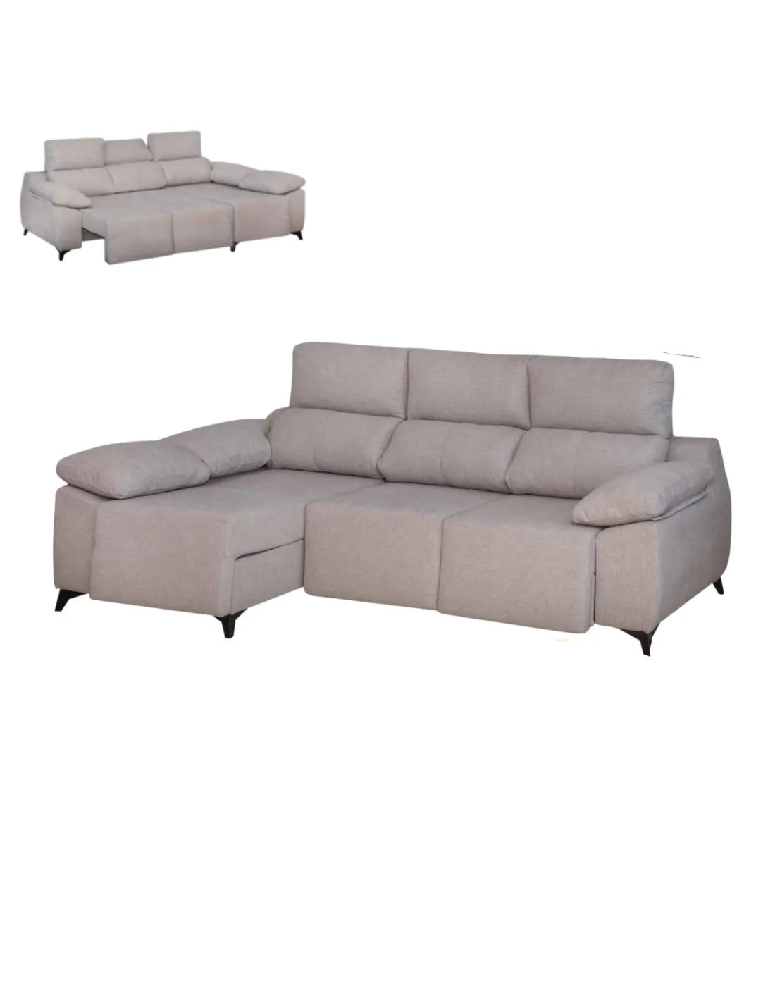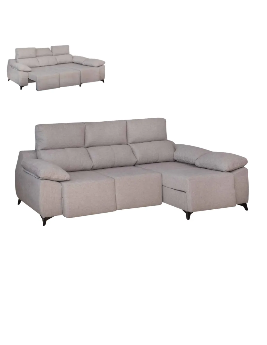 Su diseño incorpora cabeceros reclinables multiposicionales, cojines de respaldo y asiento con materiales de alta calidad, y patas altas ideales para la limpieza con robots.