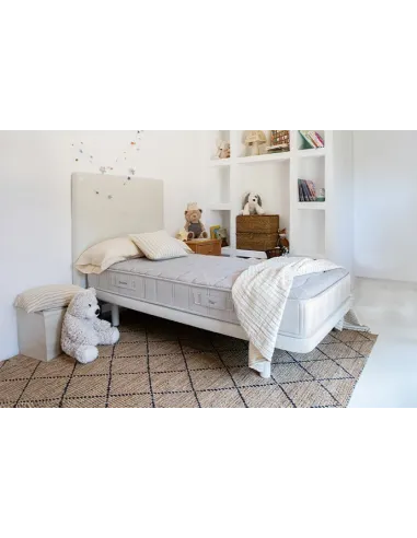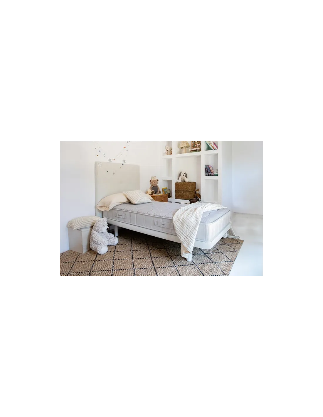 Colchón Play diseñado para garantizar un descanso óptimo y el bienestar de los más pequeños, combinando comodidad, soporte y durabilidad. Su núcleo de 300 muelles ensacados independientes ofrece una firmeza media-alta que se adapta a cada zona del cuerpo, asegurando un soporte ergonómico que cuida la columna durante toda la noche. El acolchado de viscoelástica 42 kg/m³ proporciona una acogida suave y termosensible que reduce los puntos de presión y mejora la circulación sanguínea, mientras que su elevada transpirabilidad mantiene el colchón fresco y confortable.