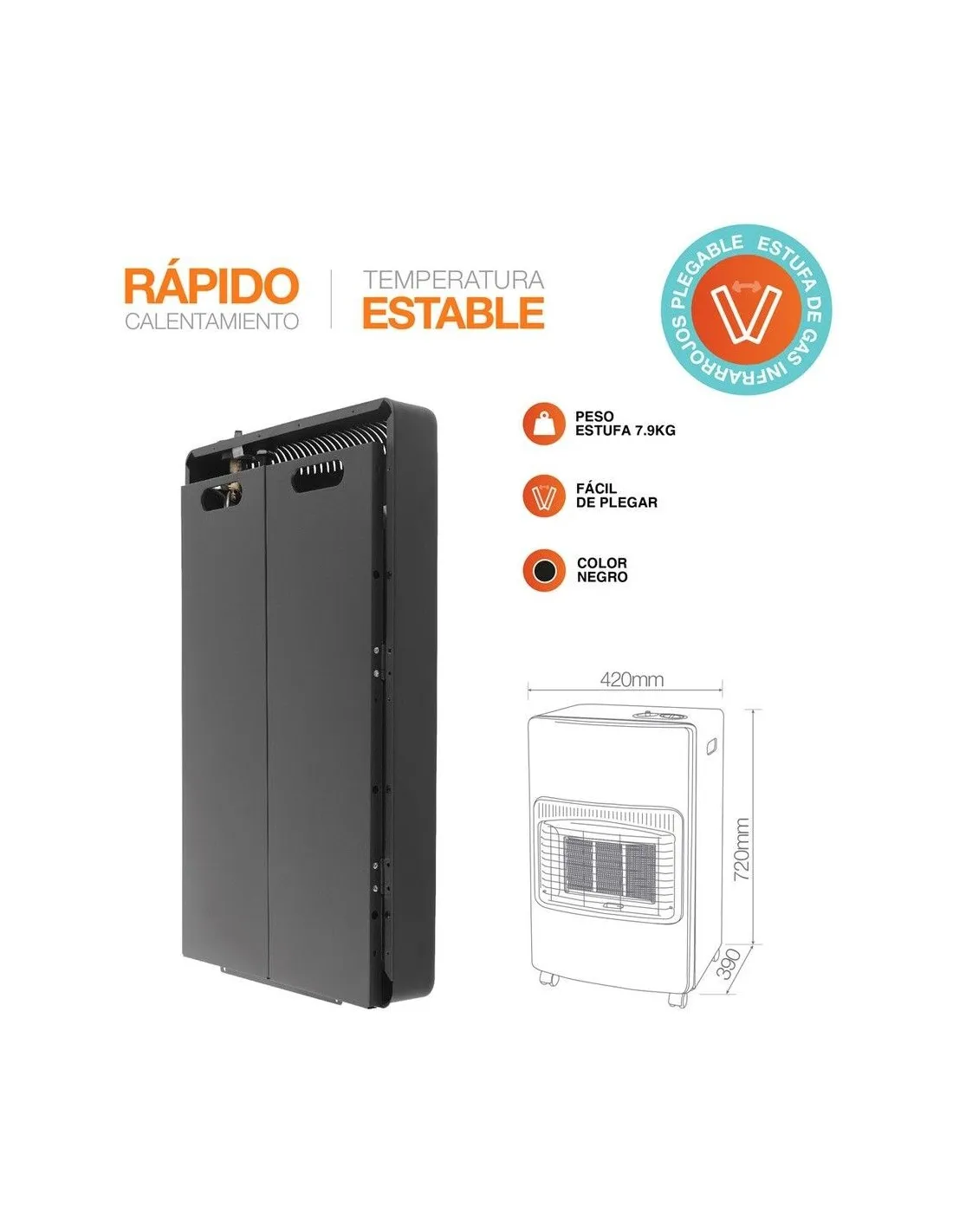 Una opción potente y segura para quienes buscan calefacción a gas eficiente con la comodidad de un diseño plegable.
