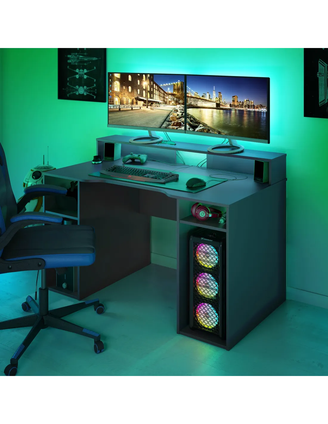 La mesa gamer está diseñada para ofrecer la máxima funcionalidad y comodidad durante largas sesiones frente al ordenador. Su estructura robusta incluye compartimentos específicos para la torre y periféricos, permitiendo mantener una zona de juego organizada y libre de obstáculos.