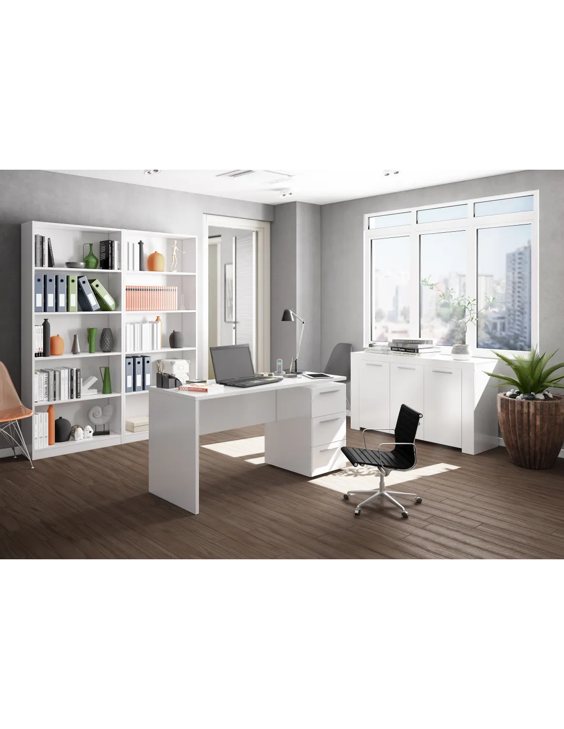 La mesa de escritorio Theon es una pieza clave para crear un entorno de trabajo eficiente. Destaca por su gran superficie de trabajo y su capacidad de almacenamiento lateral, permitiendo mantener el material de oficina ordenado y siempre al alcance de la mano.