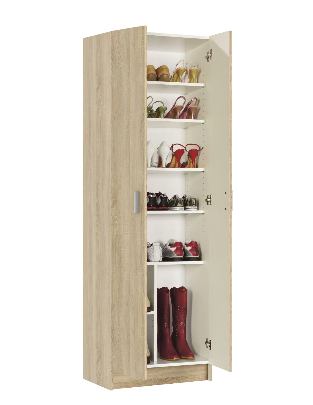 Cuenta con cinco estantes sueltos con varias posiciones en altura, permitiendo adaptar el interior según las necesidades de organización. Incorpora bisagras metálicas y soporte de estantes metálicos para una mayor resistencia y estabilidad.