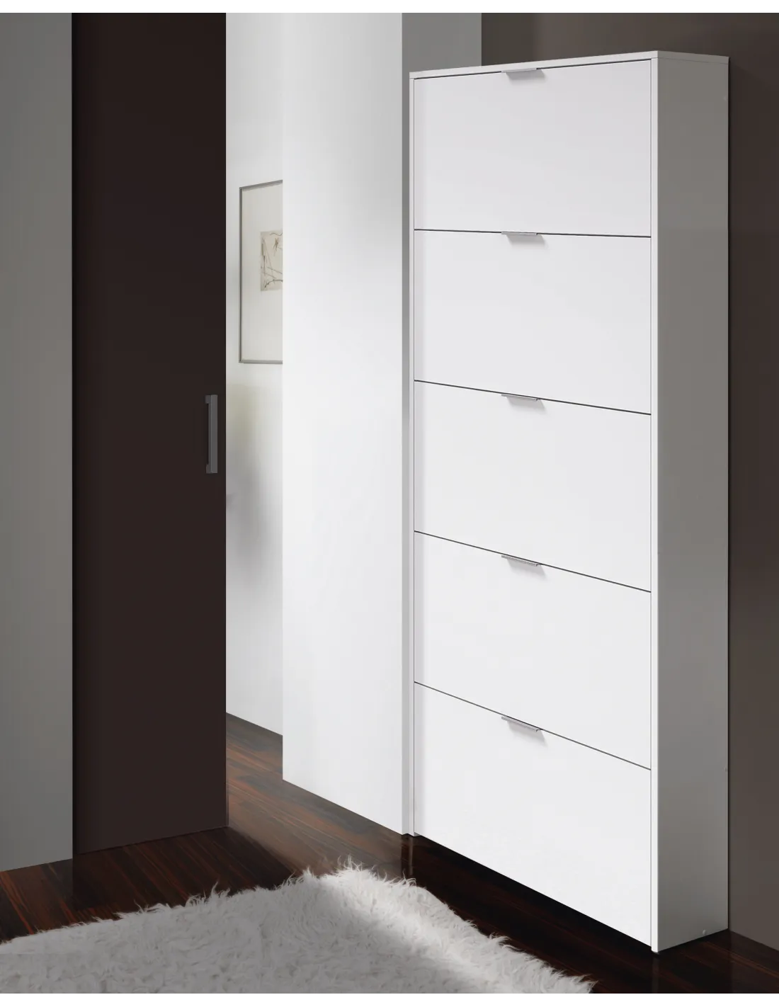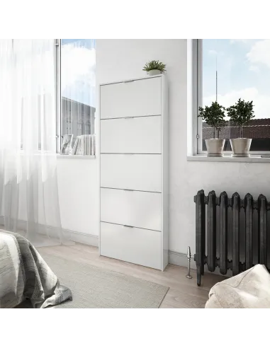 Zapatero de 5 puertas abatibles con capacidad aproximada para 15 pares de zapatos. Una solución compacta y funcional para mantener el calzado organizado.