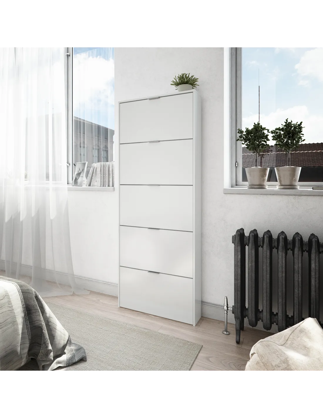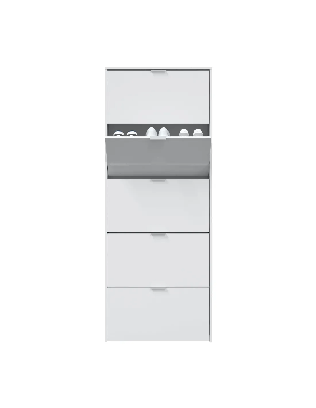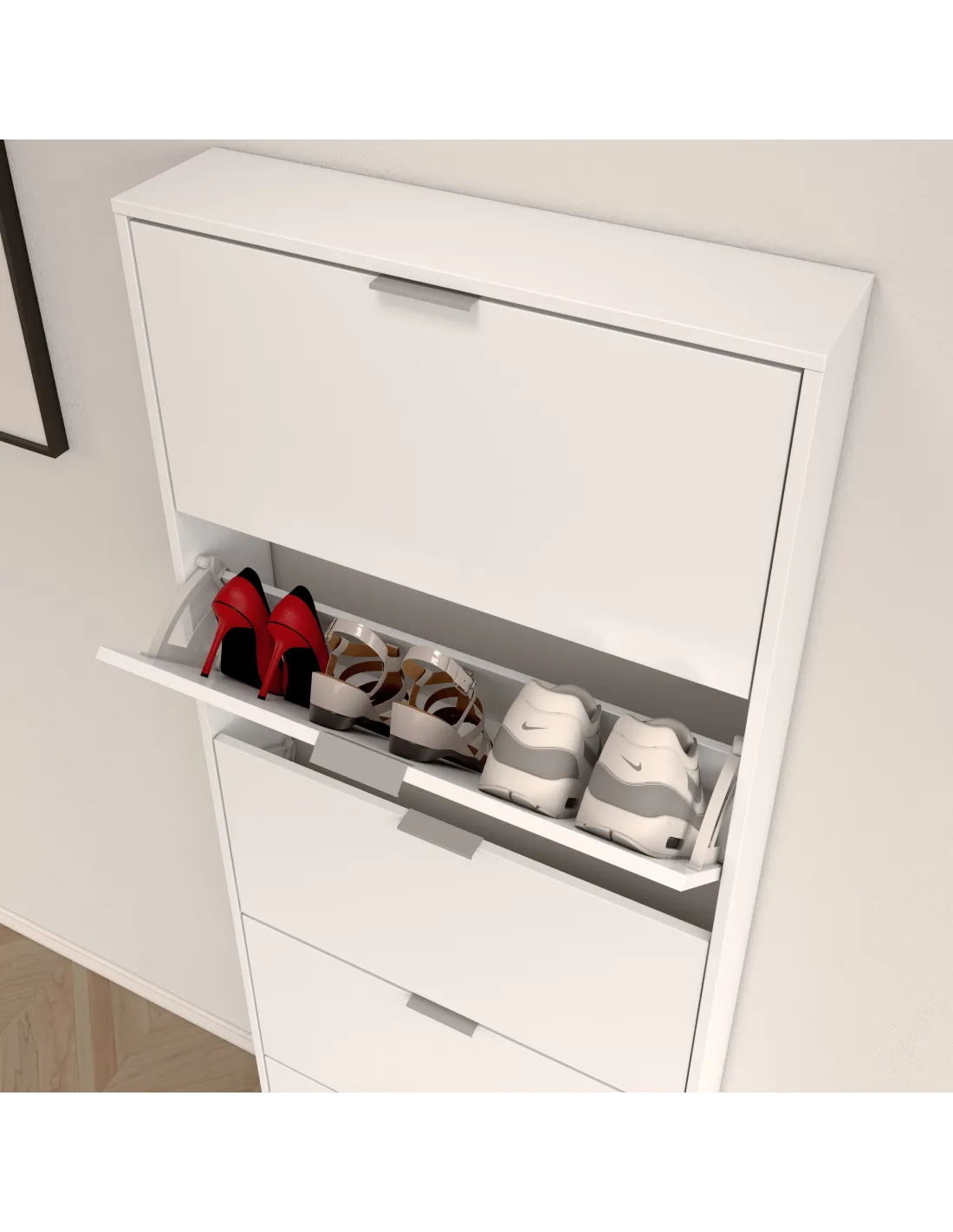 Dispone de sistema abatible ABS (termoplástico de alta resistencia) con una bandeja en color blanco en cada puerta, facilitando el acceso y la organización del calzado.