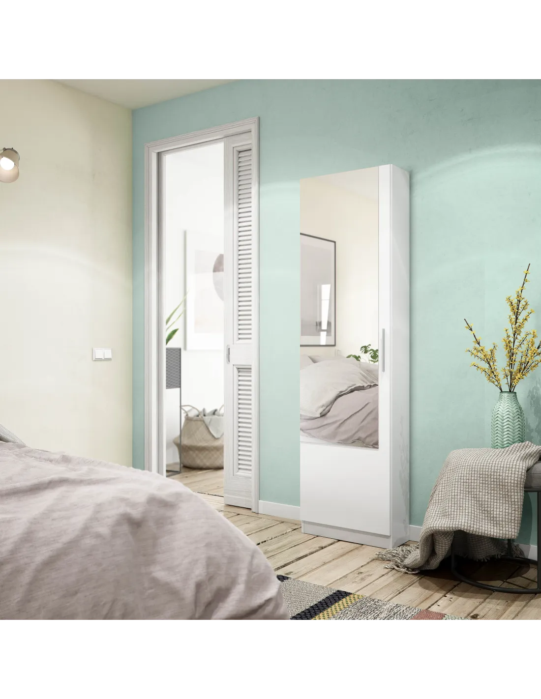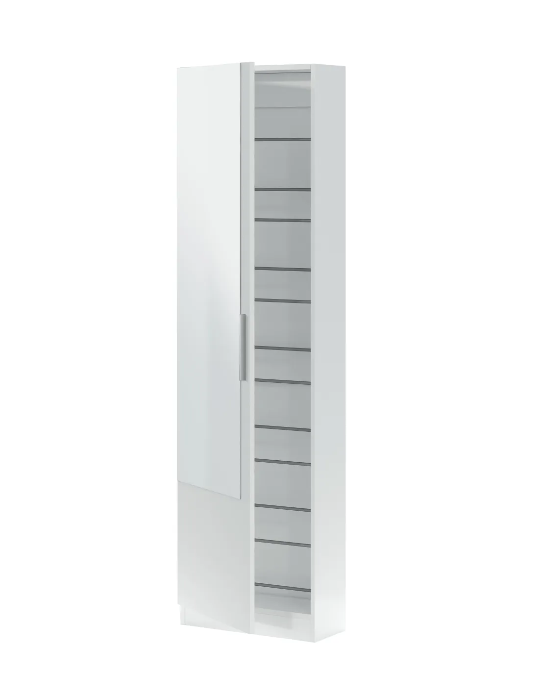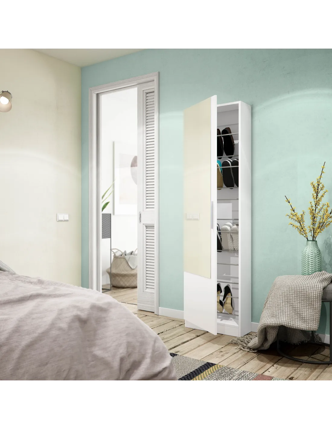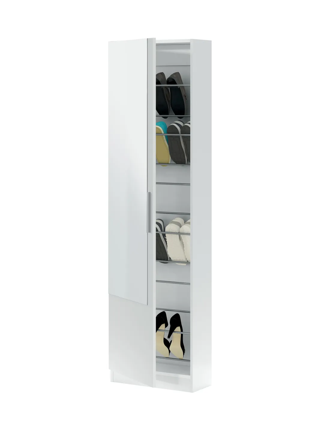 Zapatero de una puerta con espejo y capacidad aproximada para 16 pares de zapatos. Una solución funcional que combina almacenaje y practicidad en un solo mueble.