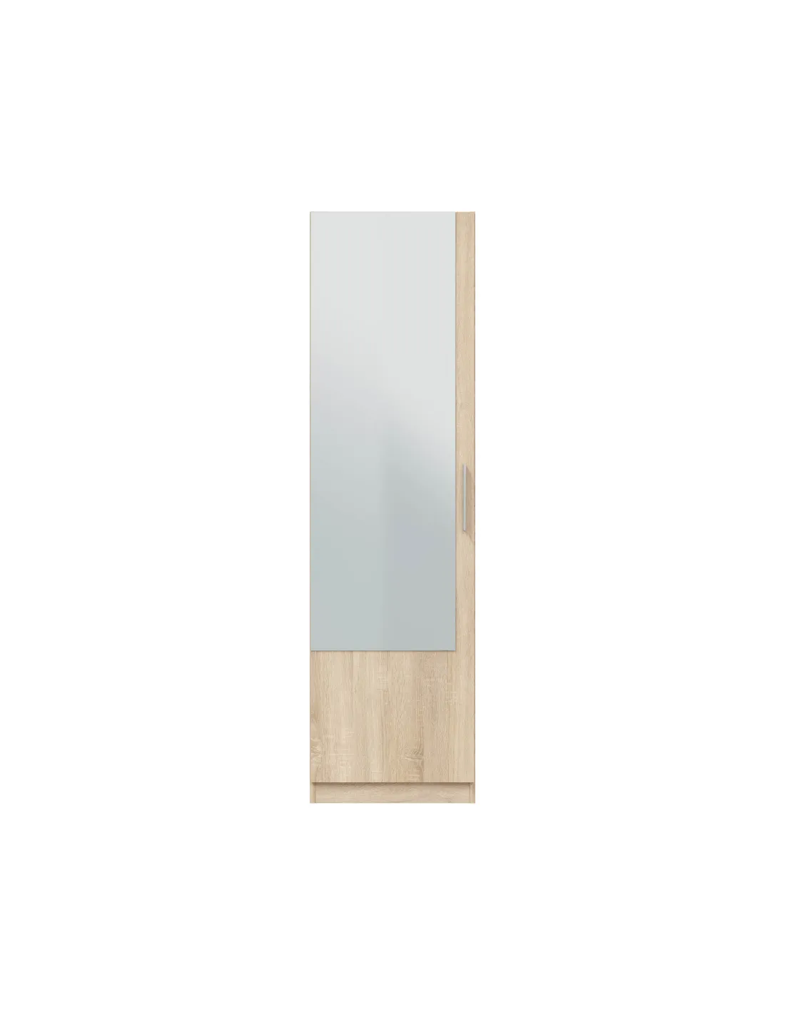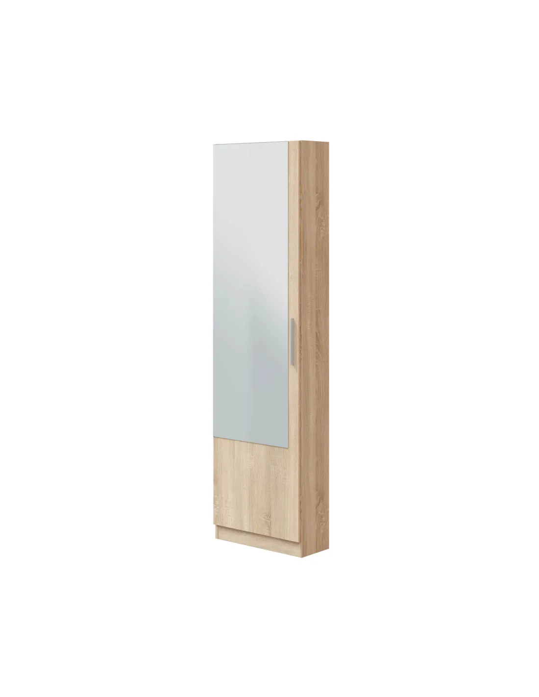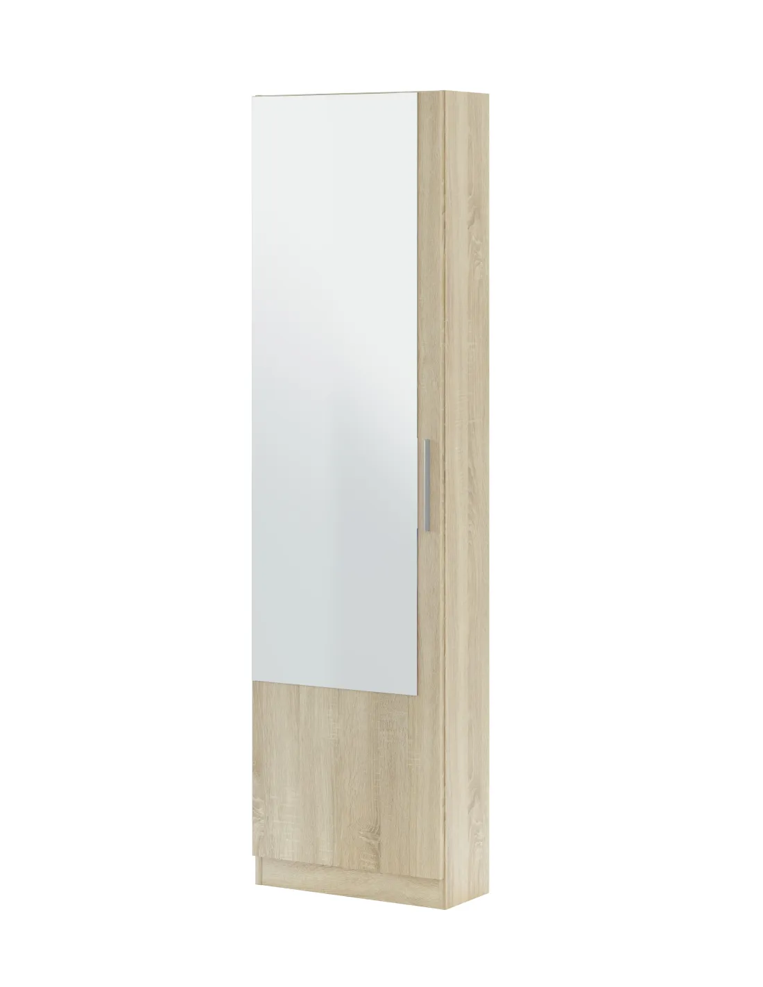 Zapatero de una puerta con espejo y capacidad aproximada para 16 pares de zapatos. Una solución práctica que combina almacenaje y funcionalidad en un solo mueble.