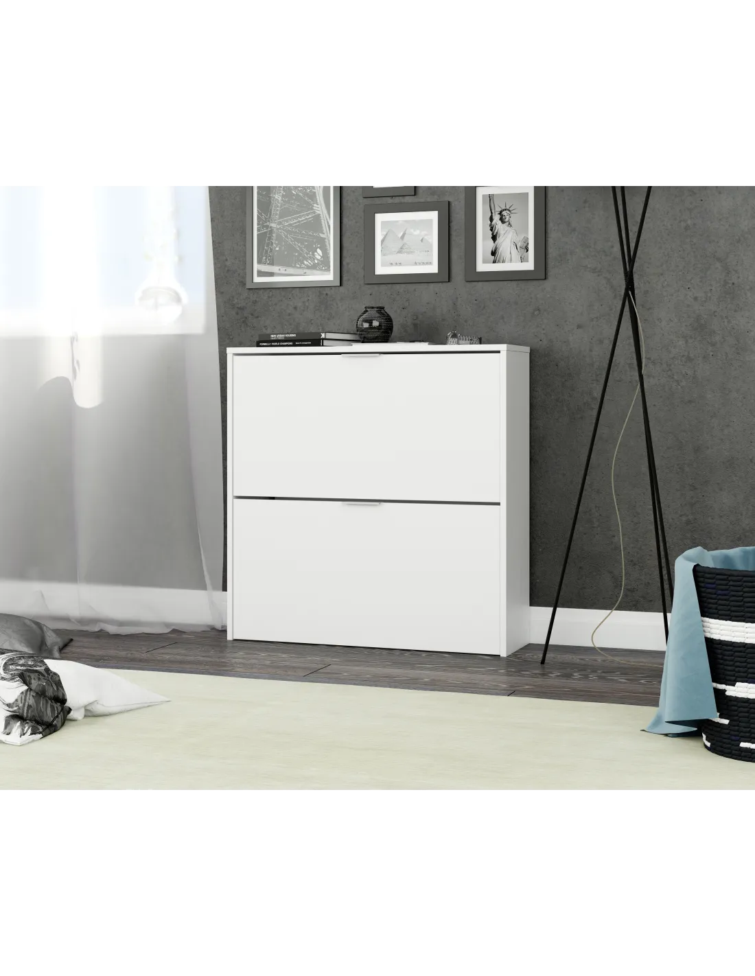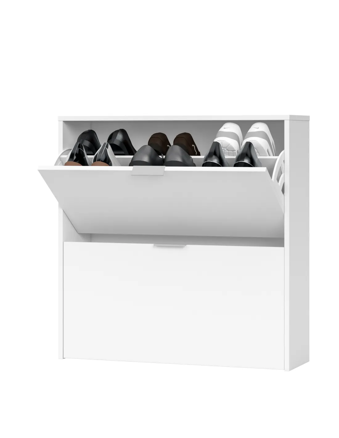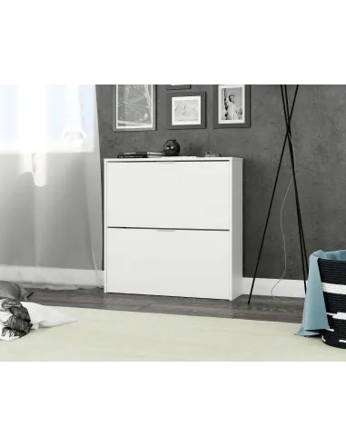 Zapatero de 2 puertas abatibles con capacidad aproximada para 16 pares de zapatos. Una solución práctica y compacta para mantener el calzado organizado.