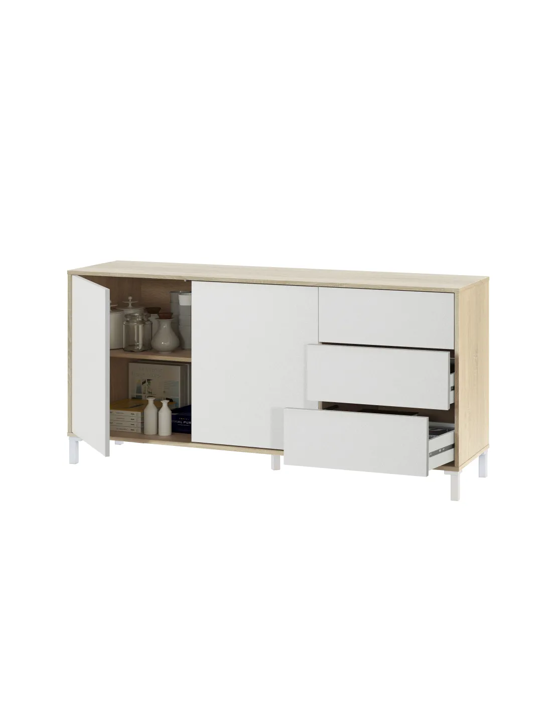 Dispone de bisagras metálicas para las puertas y tiradores metálicos efecto cromo que aportan un acabado actual. Los estantes son fijos en altura y ofrecen espacio para dispositivos electrónicos y accesorios.