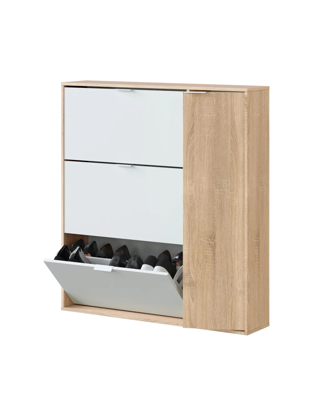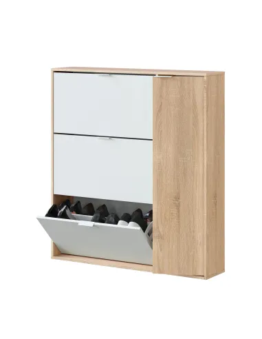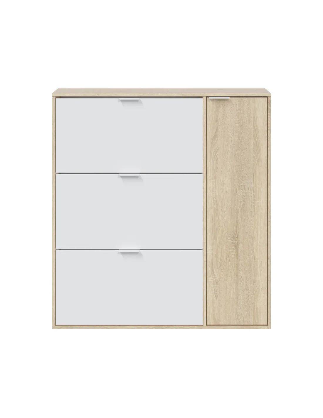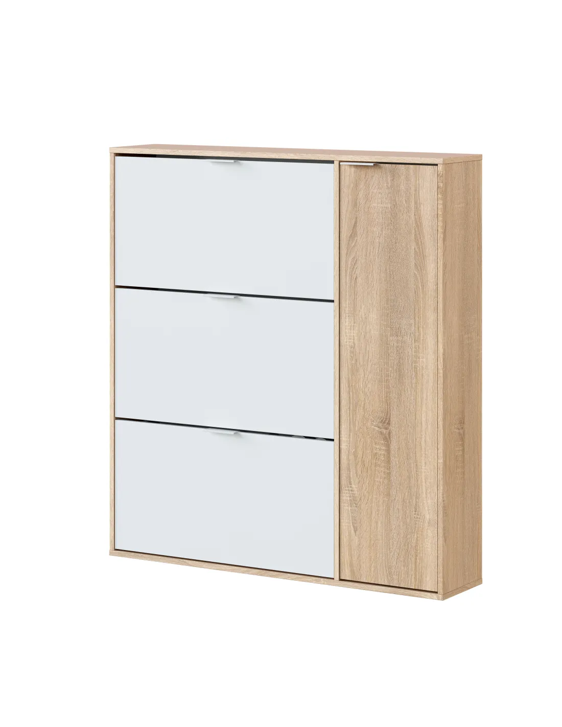 Zapatero MATT compuesto por 3 puertas abatibles y una puerta lateral con 5 estantes, ofreciendo una capacidad aproximada de hasta 30 pares de zapatos.