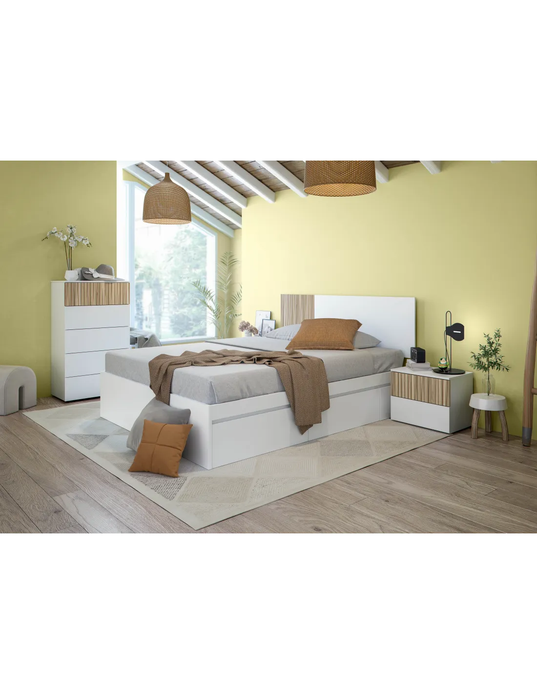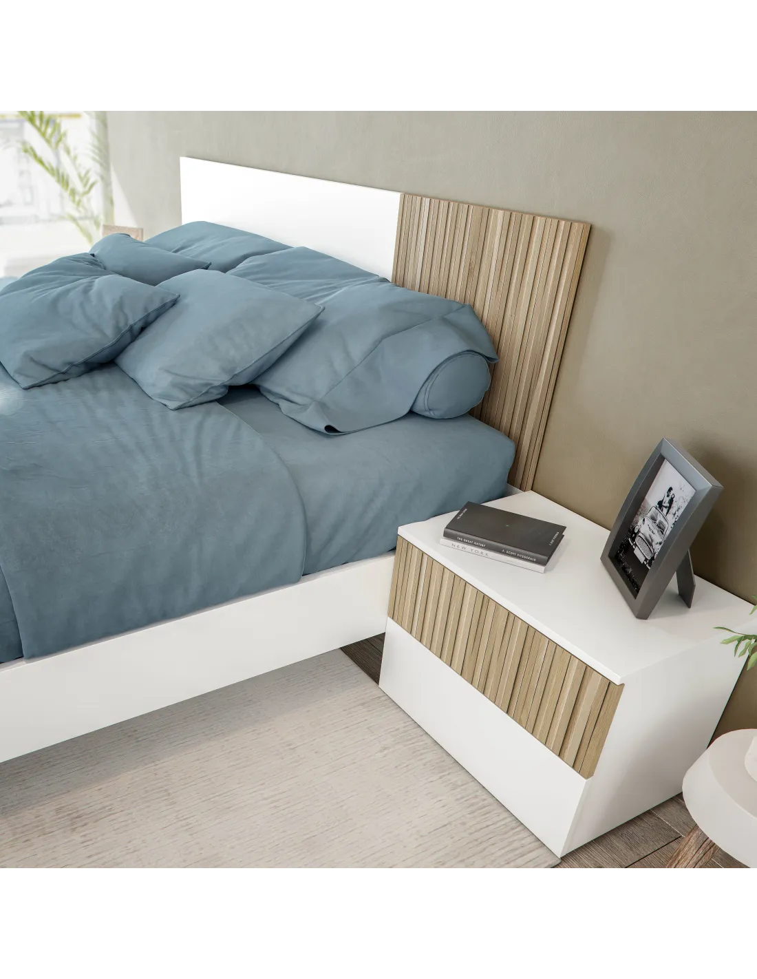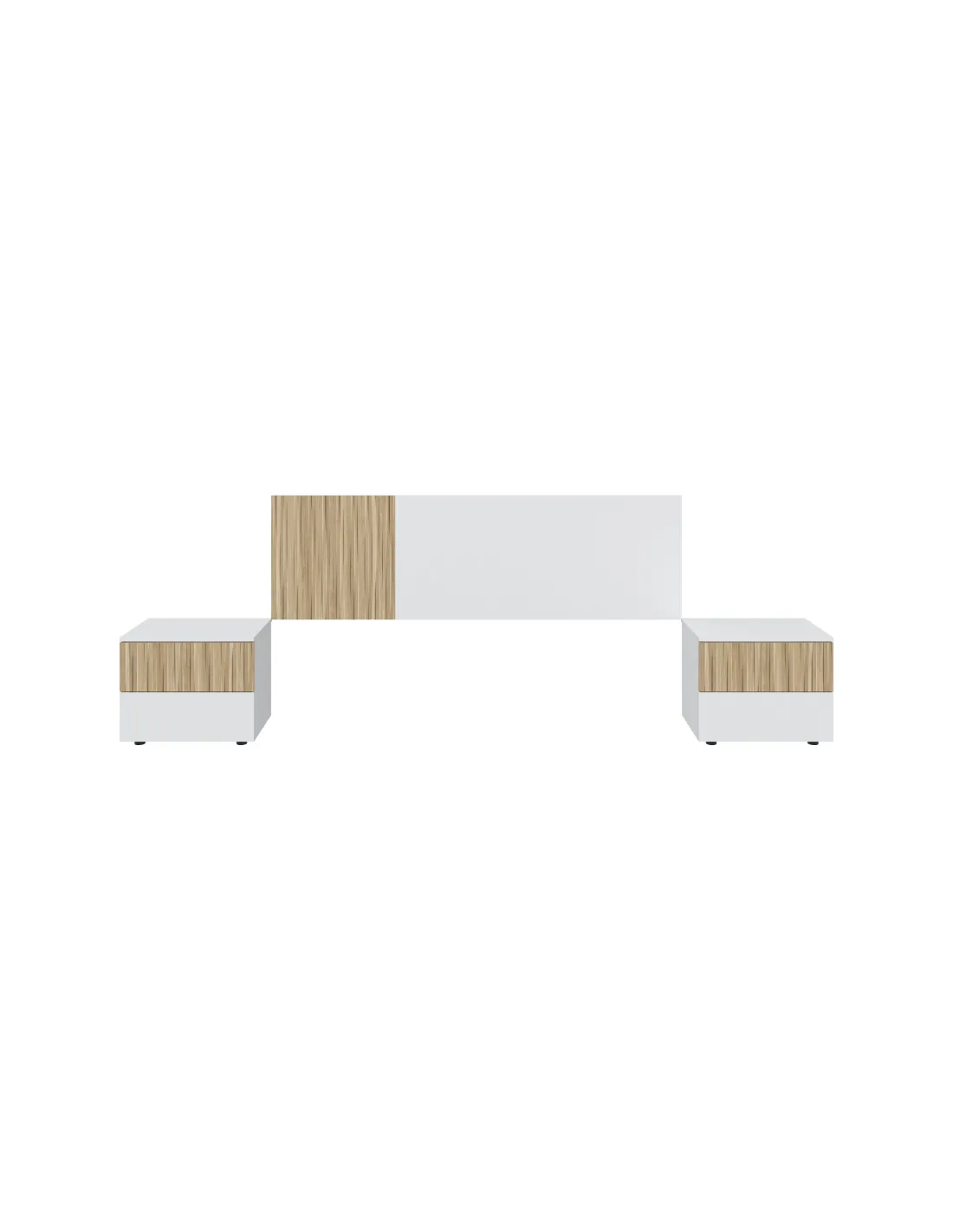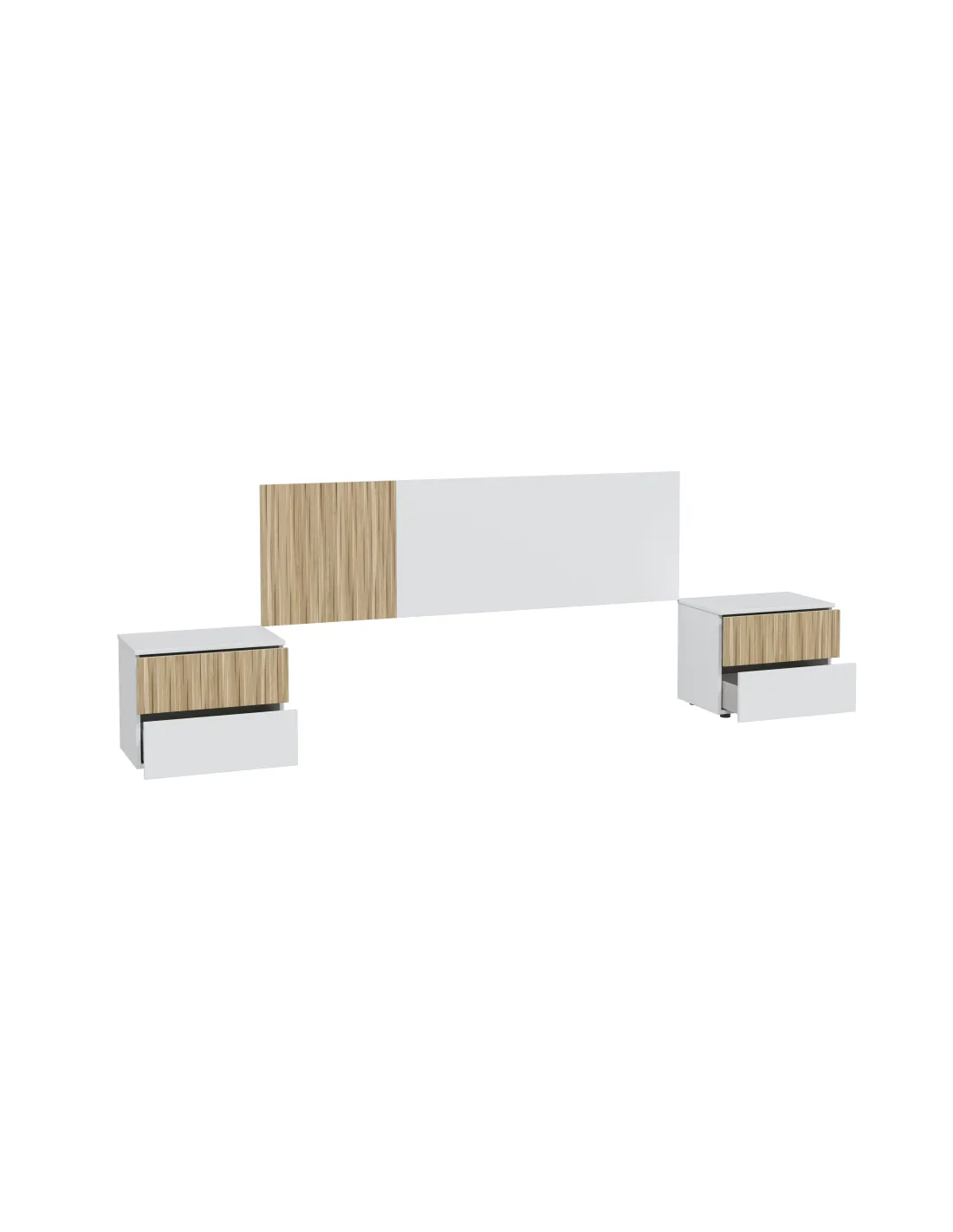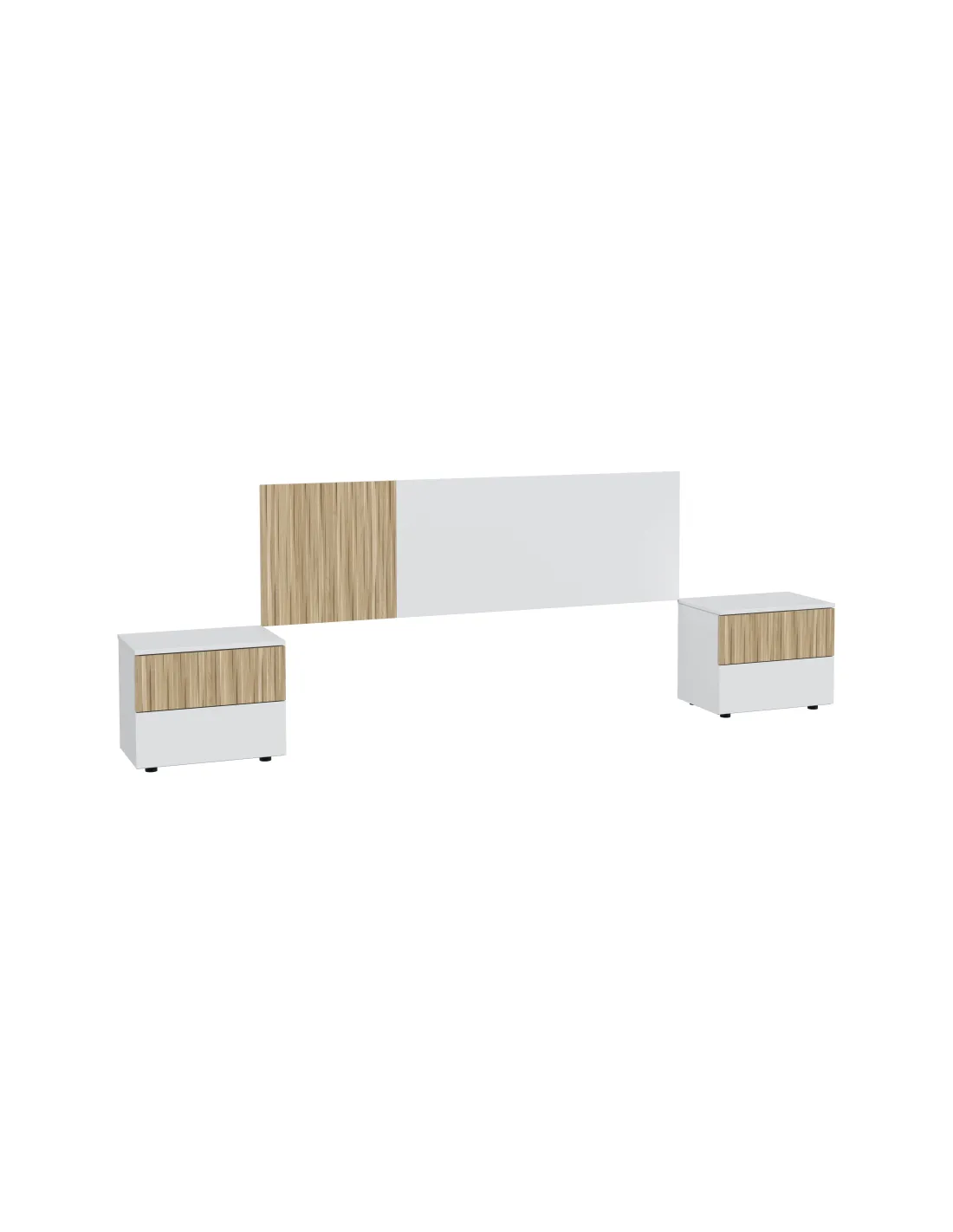 Conjunto TEMPUS formado por cabezal para cama de 160cm y dos mesitas con dos cajones cada una, ideal para dormitorios de matrimonio.