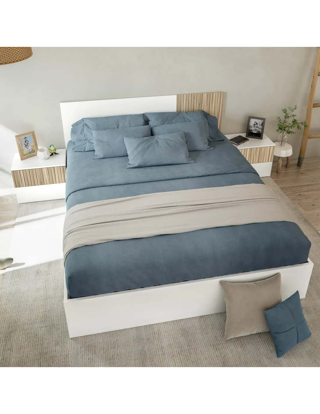 El cabezal es reversible y las mesitas sobresalen del cabezal por los lados en camas de 160cm. Dispone de patas ABS (termoplástico de alta resistencia) ocultas para la parte inferior del mueble.