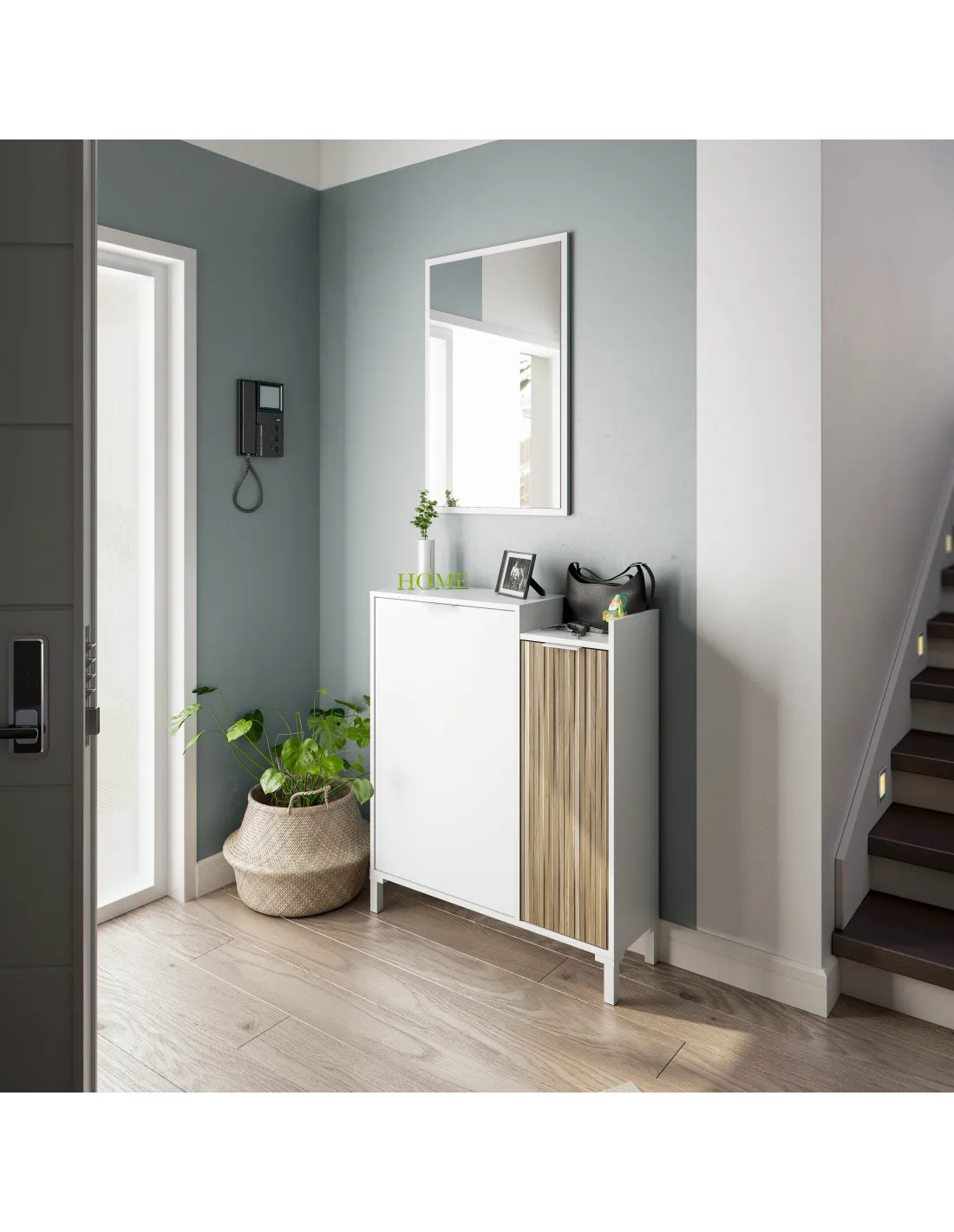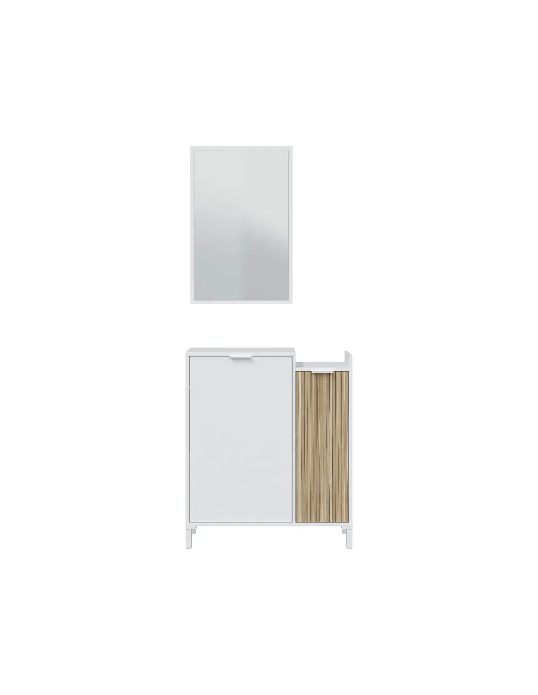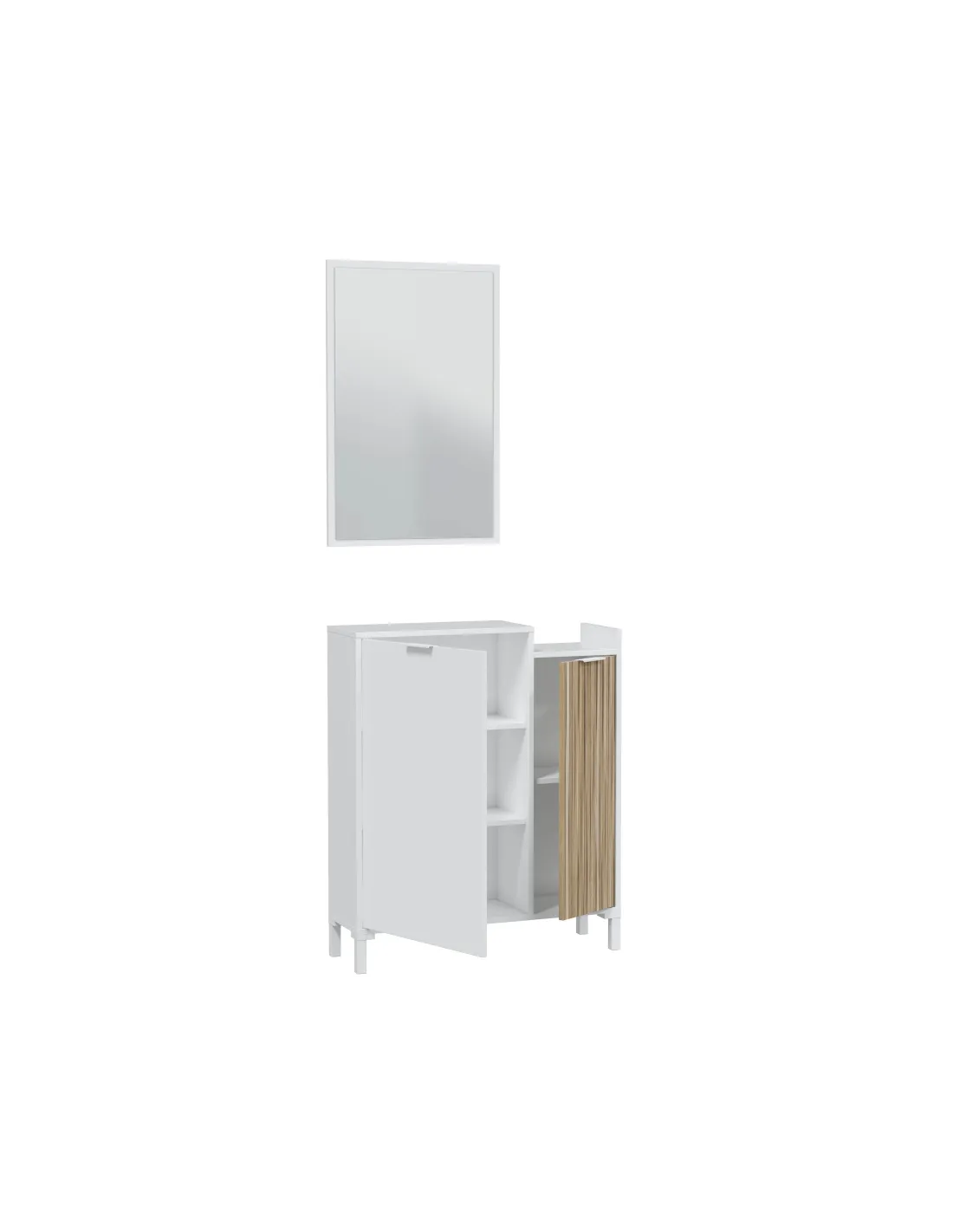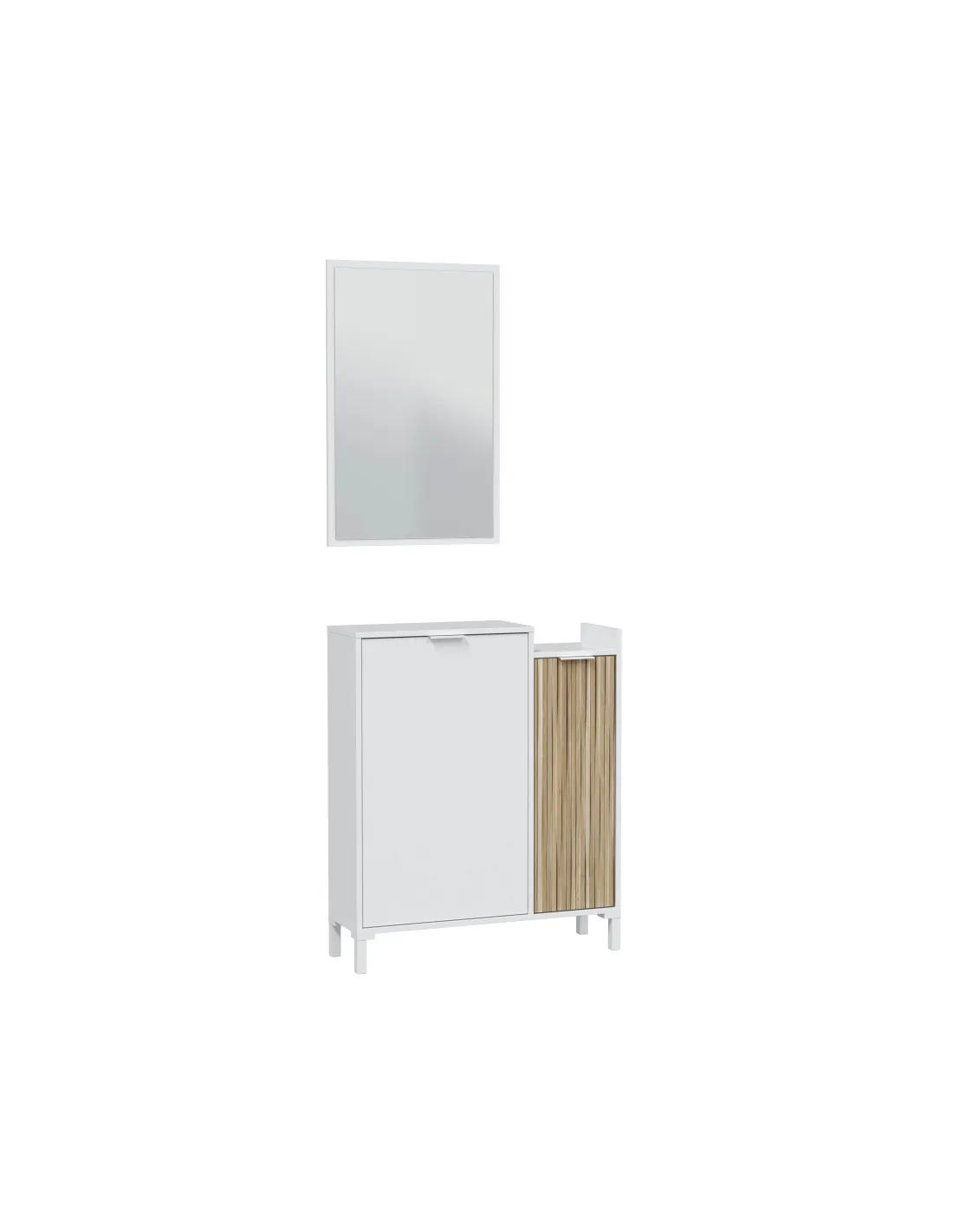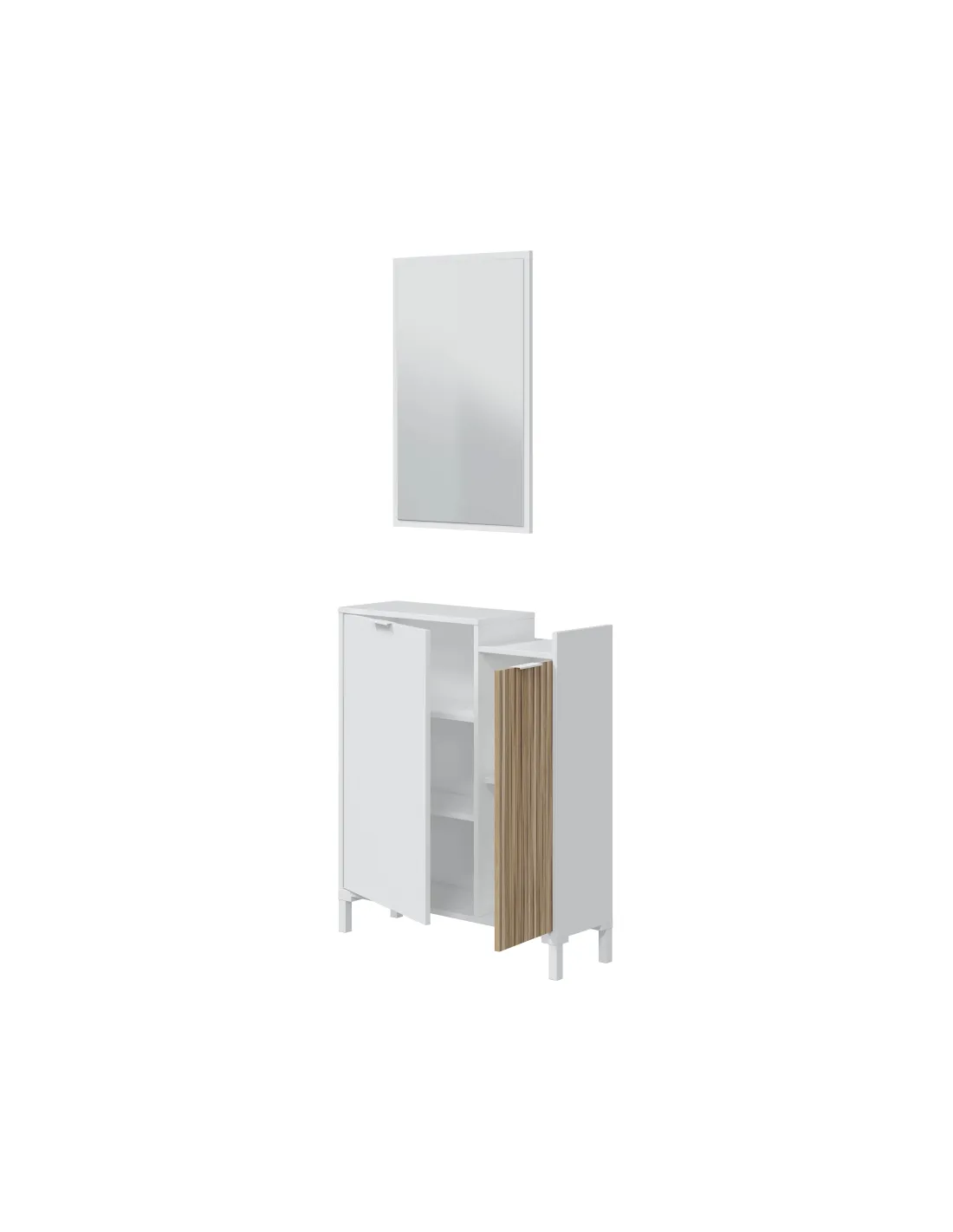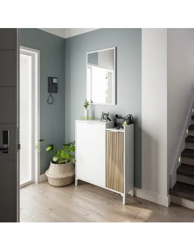 Recibidor TEMPUS compuesto por mueble de 2 puertas con estantes de almacenamiento, patas y espejo a juego.