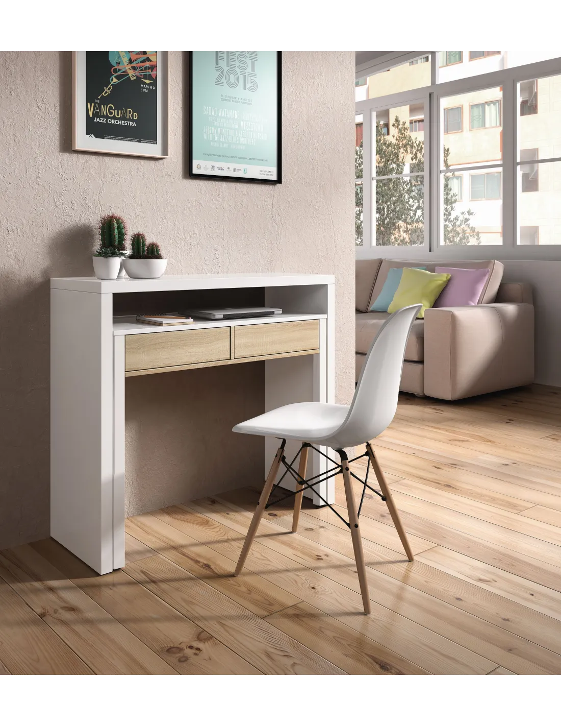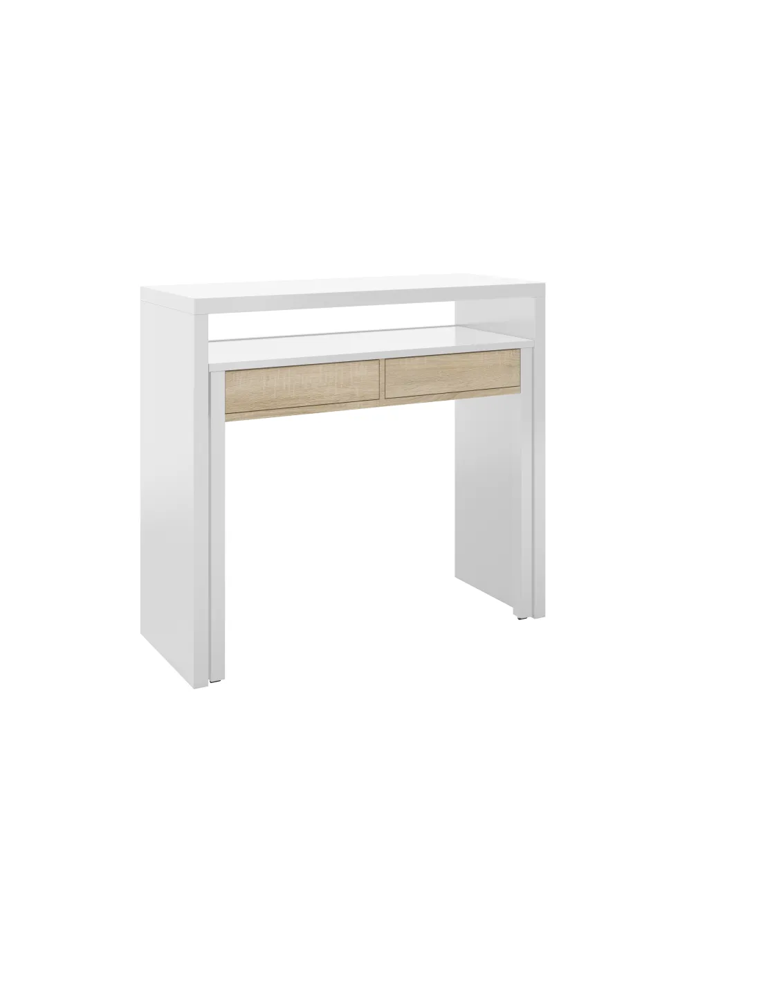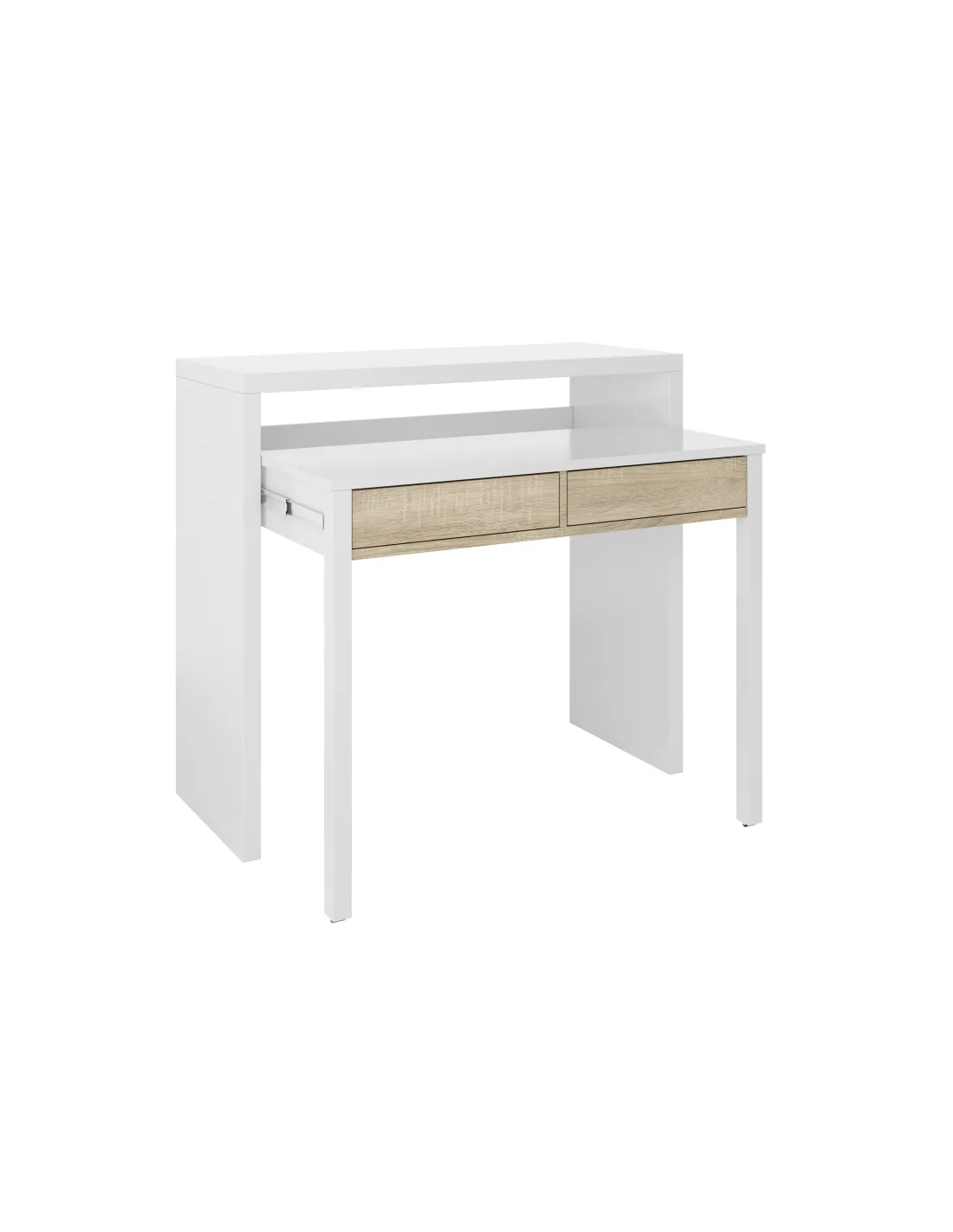 Consola escritorio TYRION auxiliar extensible con 2 cajones, ideal para optimizar el espacio en salones, dormitorios o zonas de estudio.