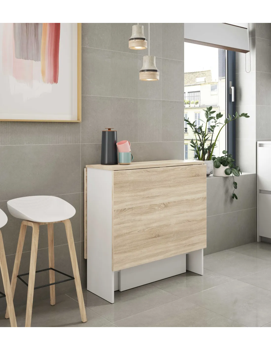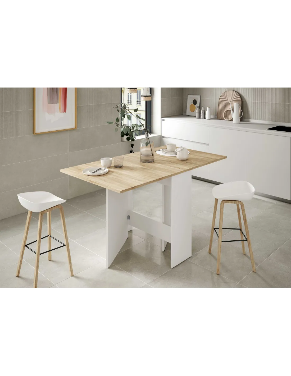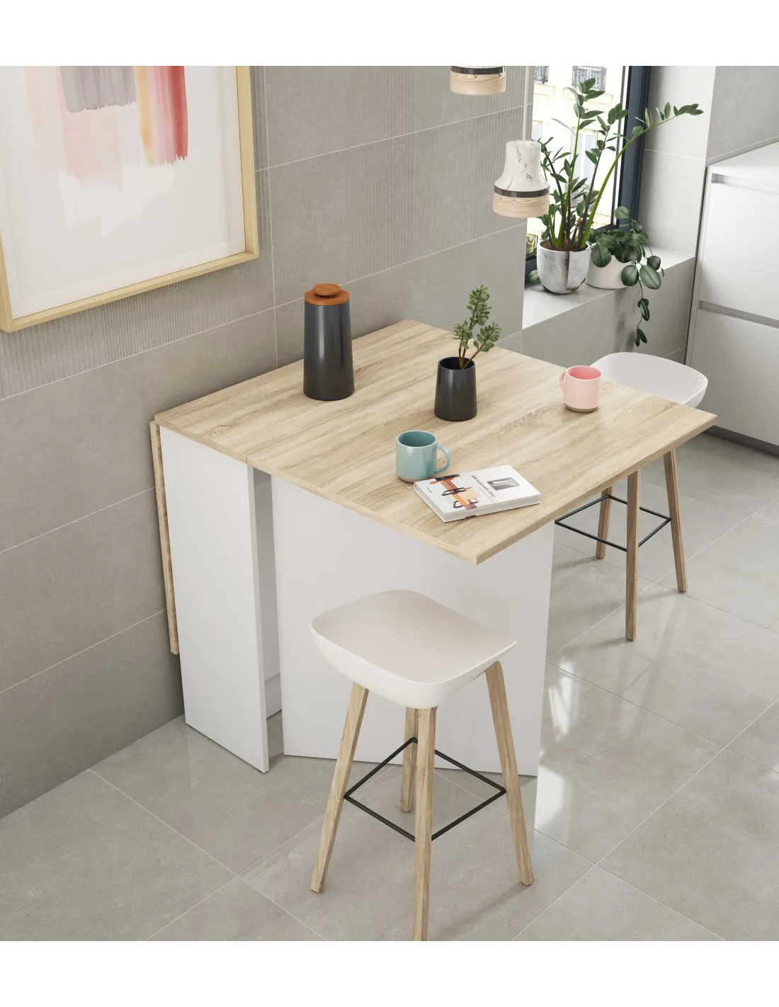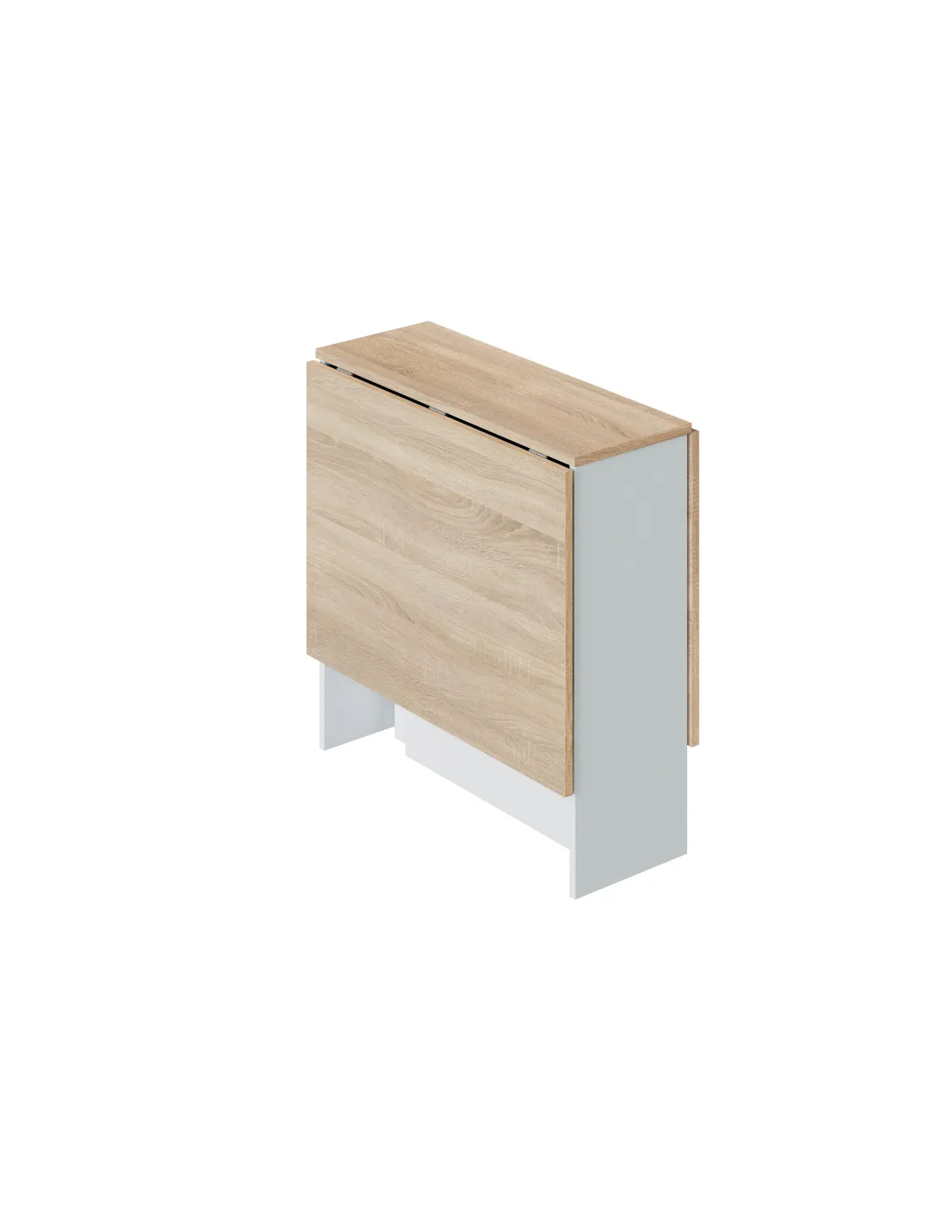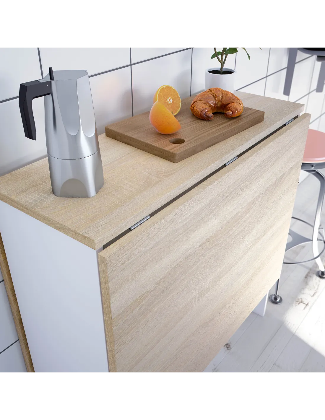 Mesa auxiliar VOLARE con alas abatibles, ideal para ampliar la superficie cuando se necesita y reducirla para ahorrar espacio.