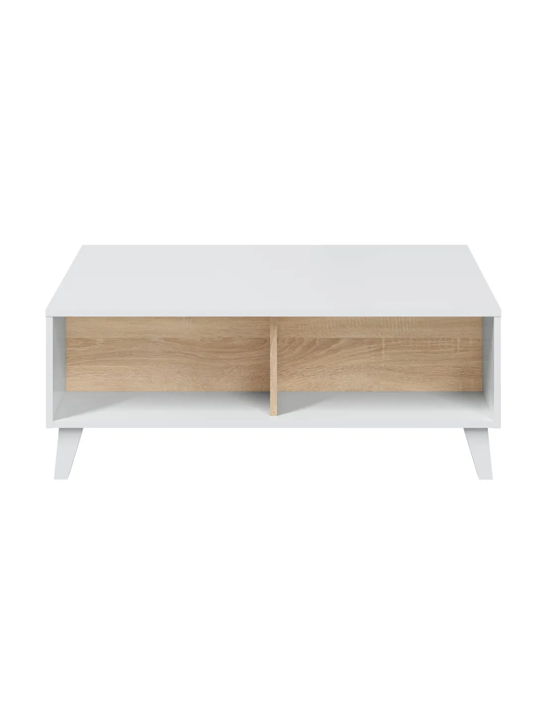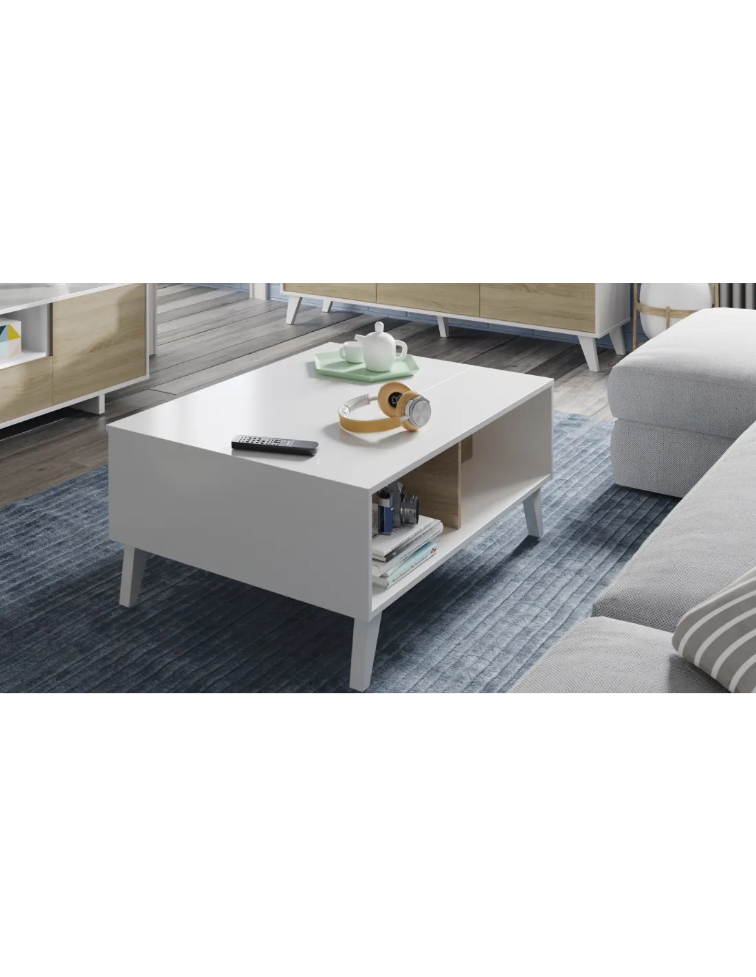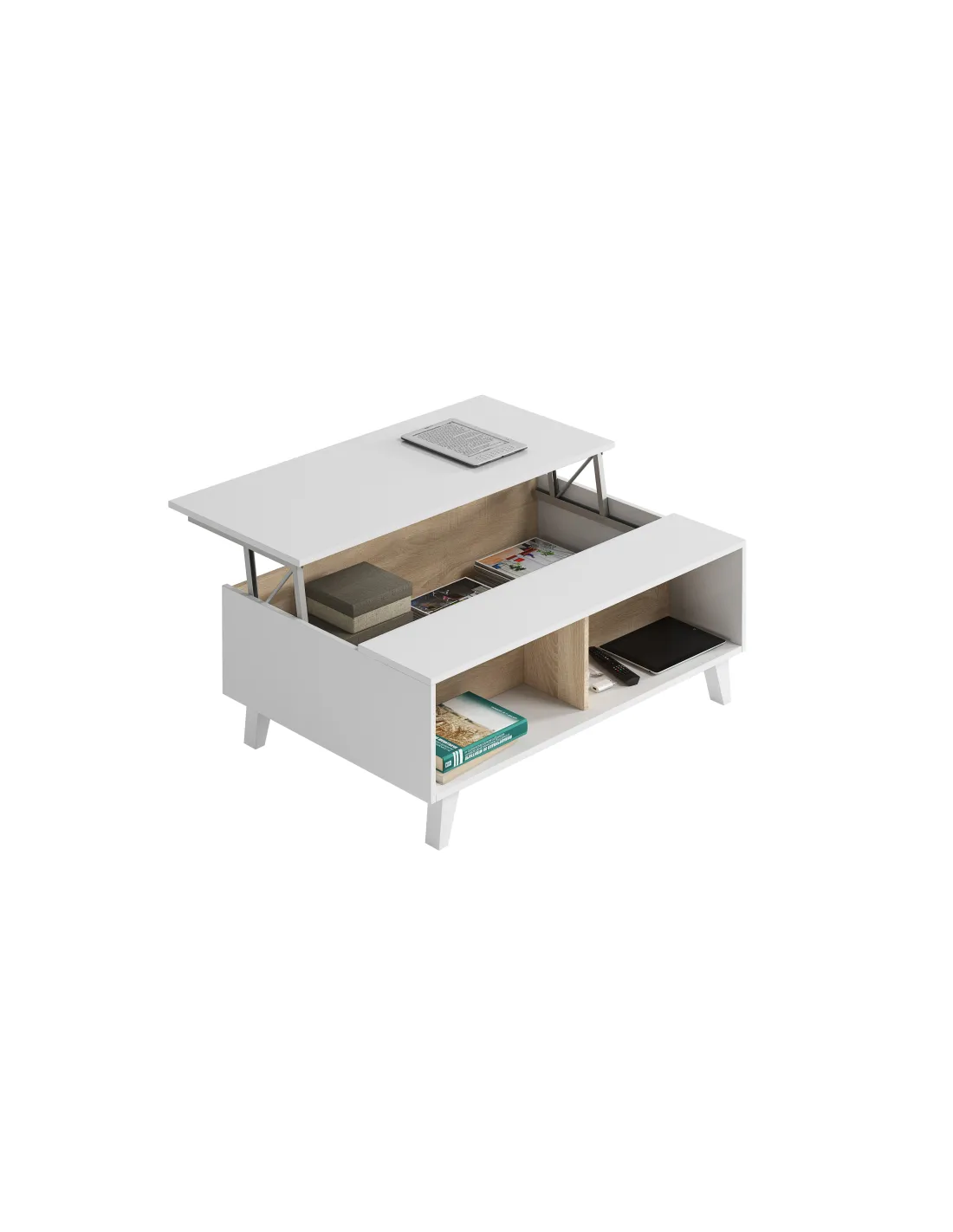 Mesa centro STYLUS PLUS con tapa elevable que permite acceder a un práctico espacio de almacenamiento interior, el cual queda oculto al cerrar la tapa, además de disponer de huecos exteriores.