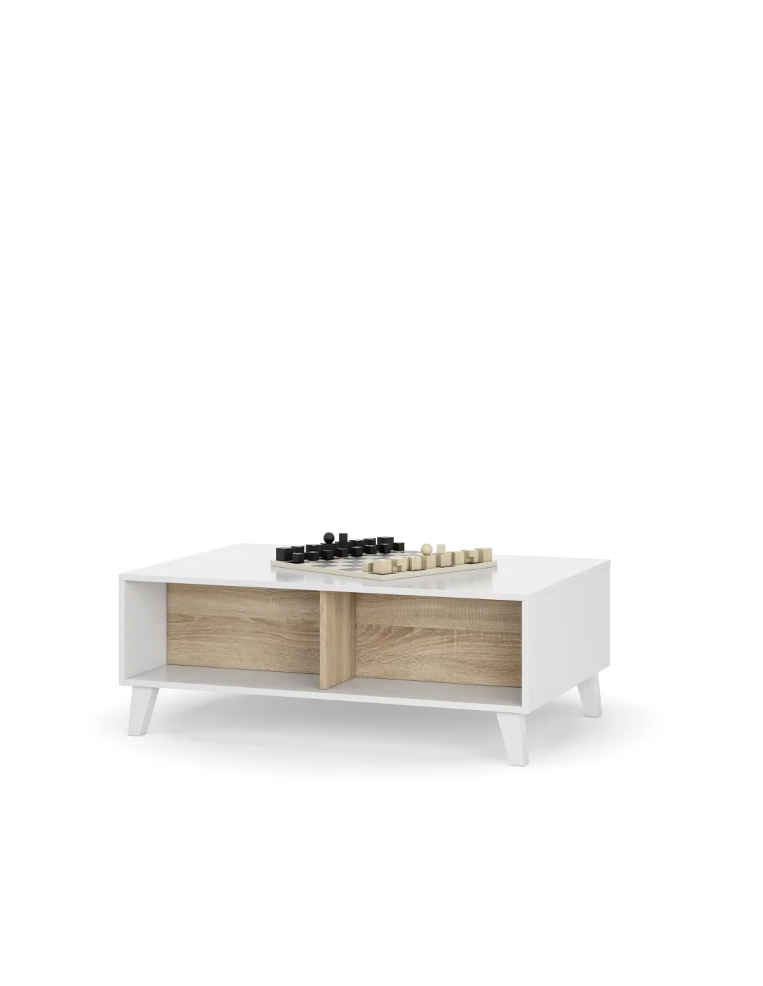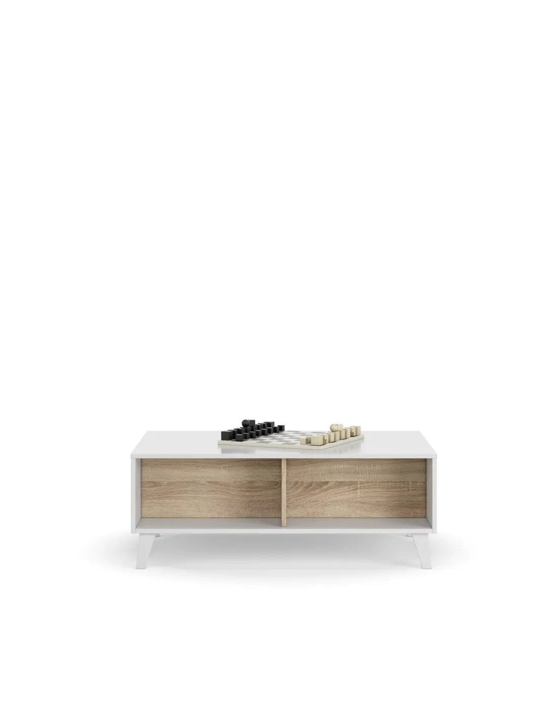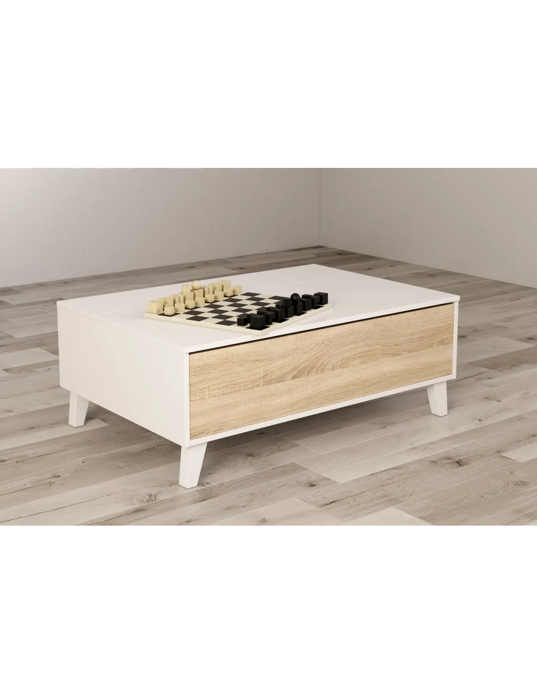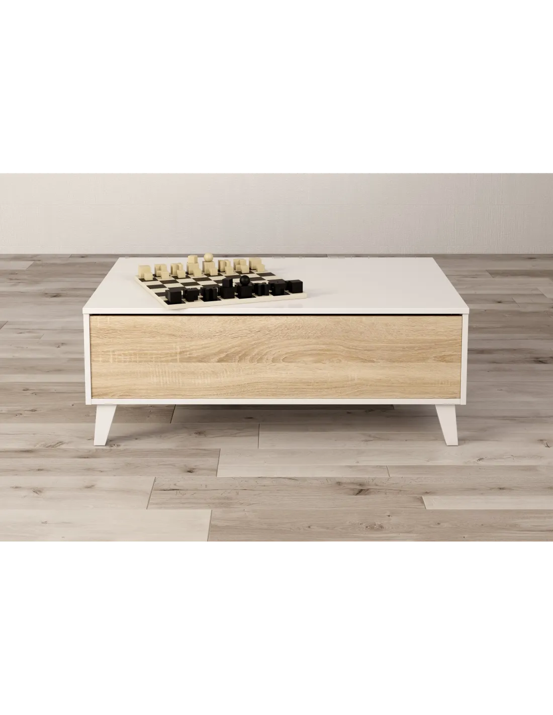 Mesa centro STYLUS PLUS con tapa elevable que permite acceder a un práctico espacio de almacenamiento interior, el cual queda oculto al cerrar la tapa, además de disponer de huecos exteriores.