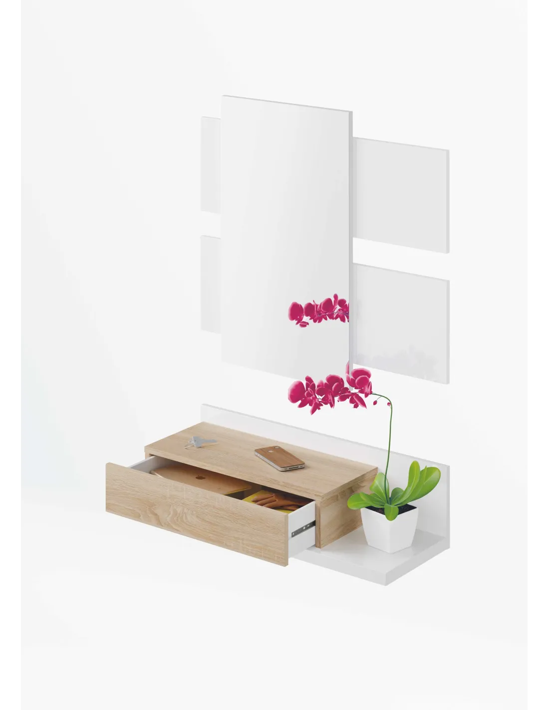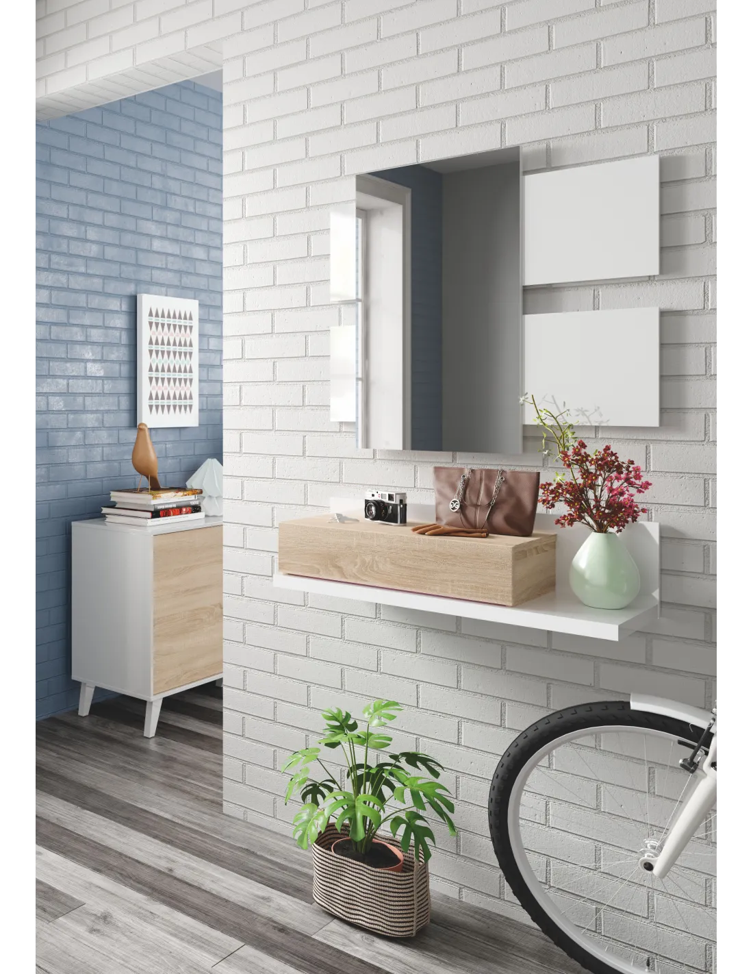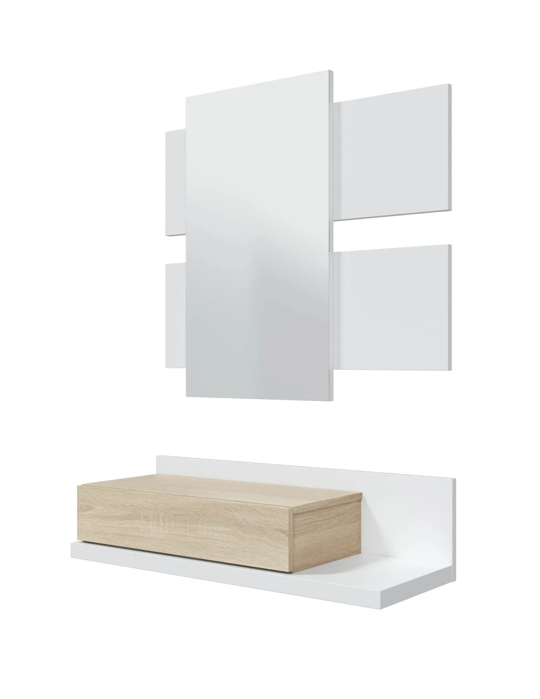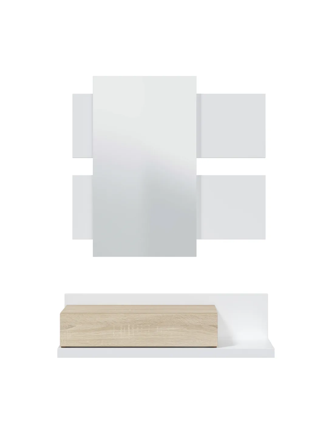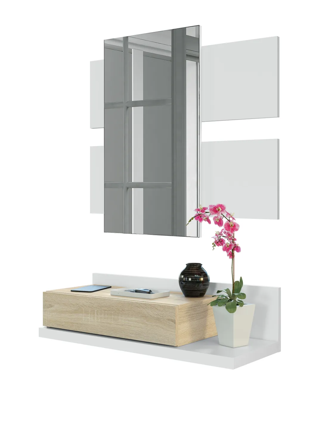Recibidor MODERN compuesto por mueble con cajón y espejo, ideal para organizar la entrada del hogar con estilo.