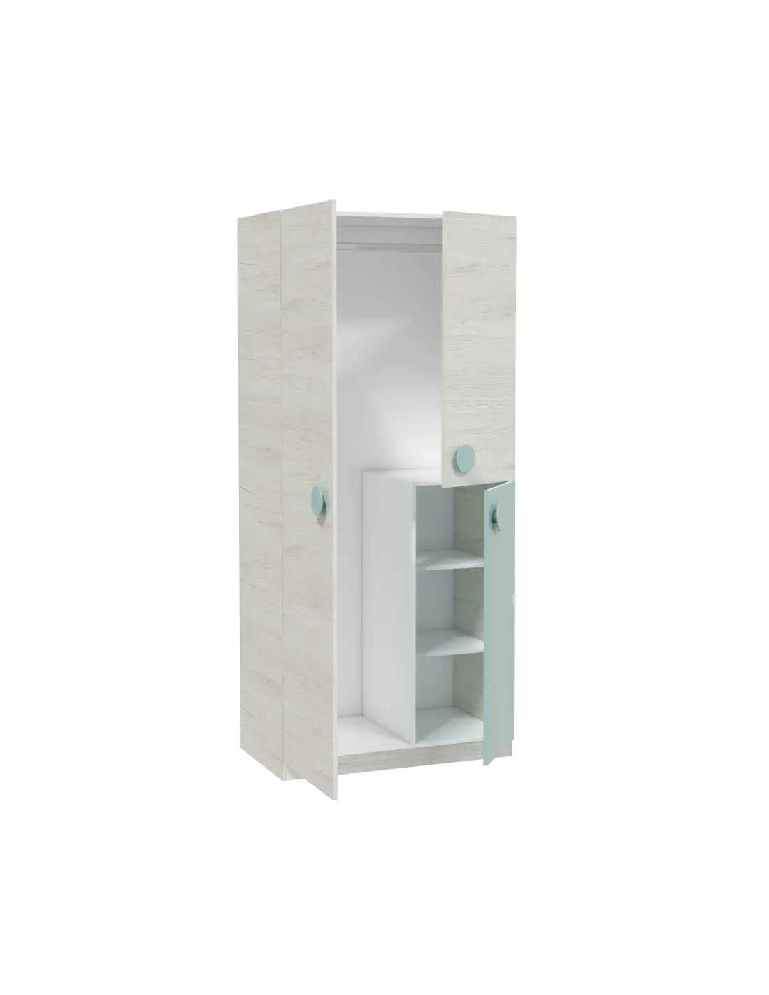 Armario ENJOY de 3 puertas con barra de colgar y tres estantes en su interior, perfecto para organizar ropa y complementos.