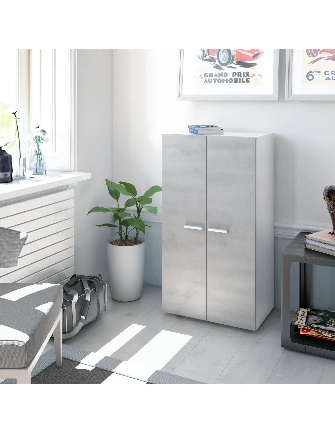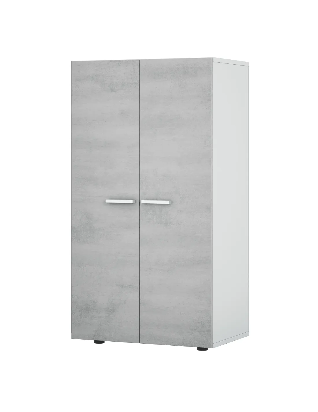 Incorpora bisagras metálicas, soporte de estantes metálicos y tiradores ABS pintados en color blanco. Dispone de patas ABS (termoplástico de alta resistencia) ocultas en la parte inferior del mueble. Los estantes son sueltos, con posibilidad de extracción para crear huecos de mayor altura.
