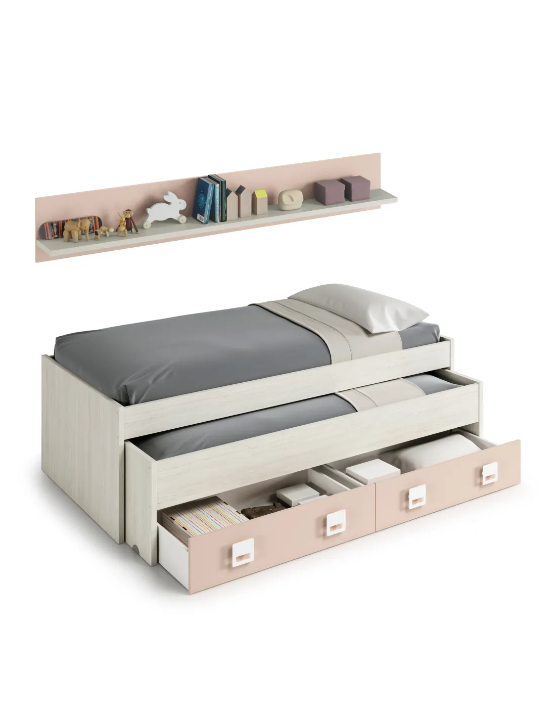 Cama doble diseñada para colchones de 190x90 (cama superior) y 180x90 (cama inferior), equipada con 2 cajones en la parte inferior del mueble y un práctico estante de colgar.