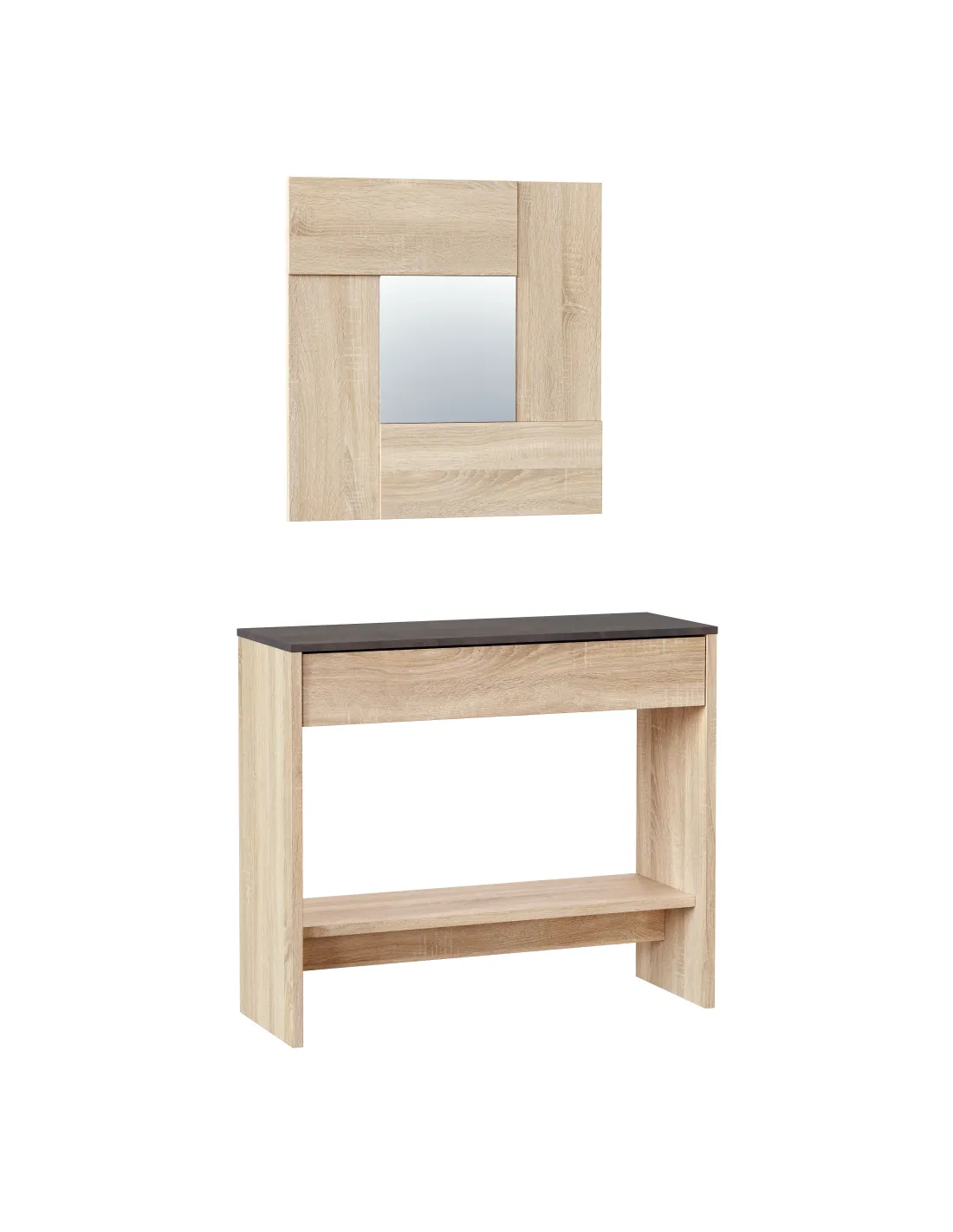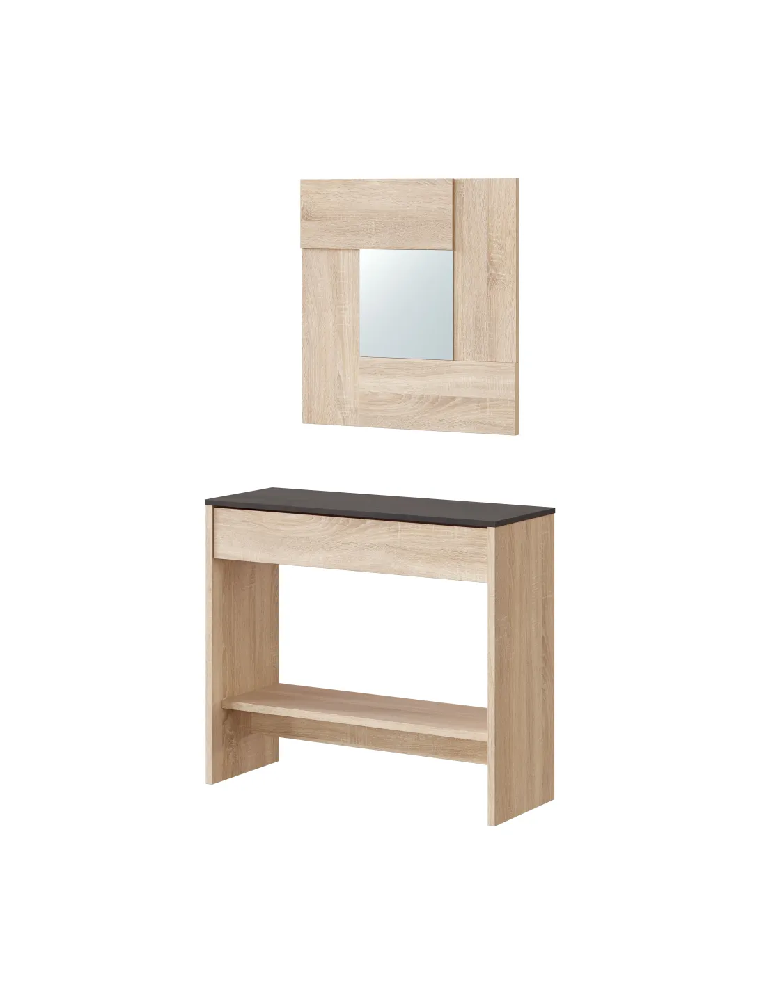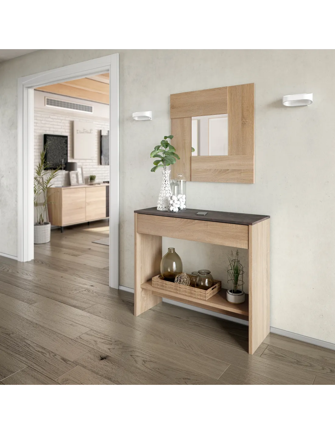 Recibidor con cajón y espejo, ideal para entradas y recibidores, aportando un punto práctico de apoyo y almacenamiento.
