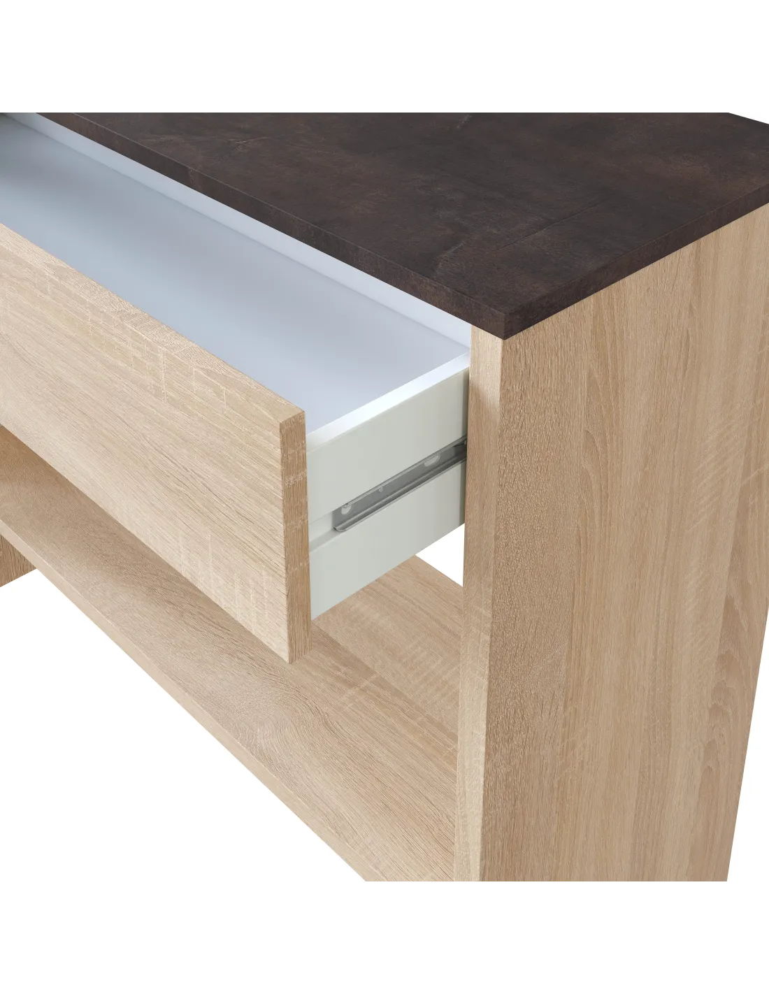 Dispone de guías correderas metálicas para el cajón (no extraíble) y tacos ABS (termoplástico de alta resistencia) quitarruidos y antirayas para la parte inferior del mueble, protegiendo el suelo y aportando estabilidad.