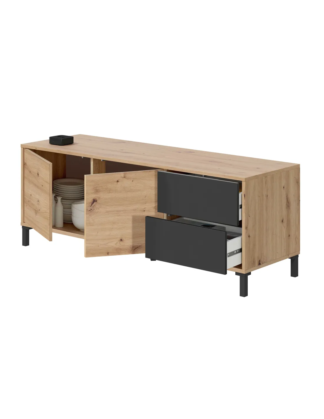 Dispone de patas ABS en color negro, sistema de apertura de las puertas tipo PUSH, bisagras metálicas para las puertas y guías correderas metálicas para los cajones (no extraíbles).