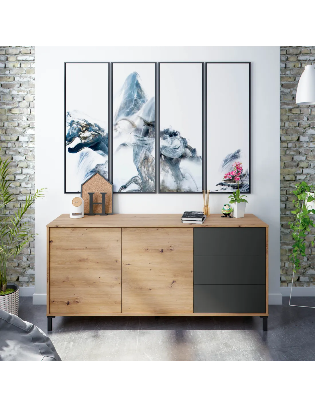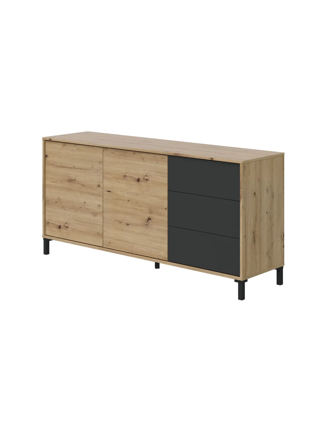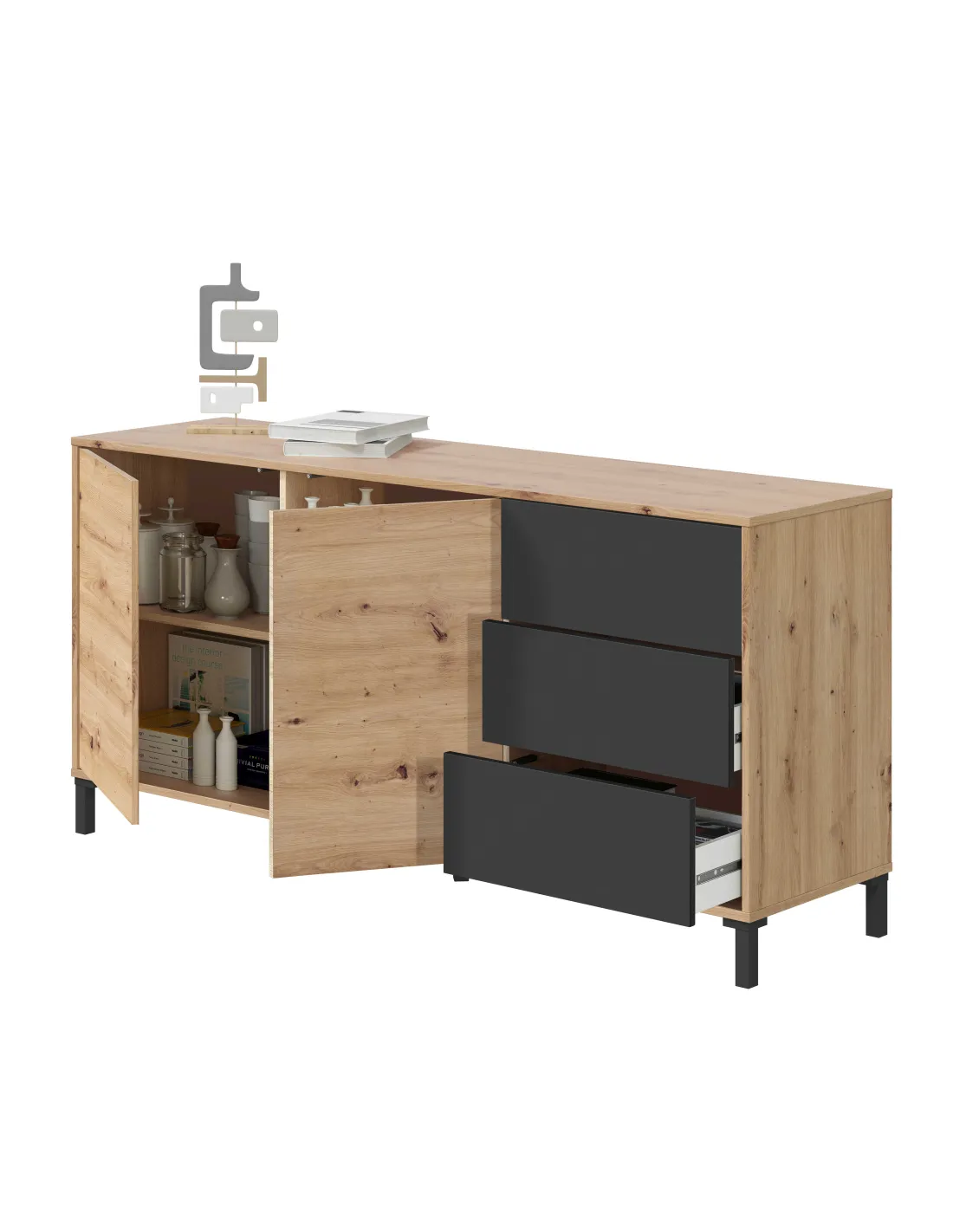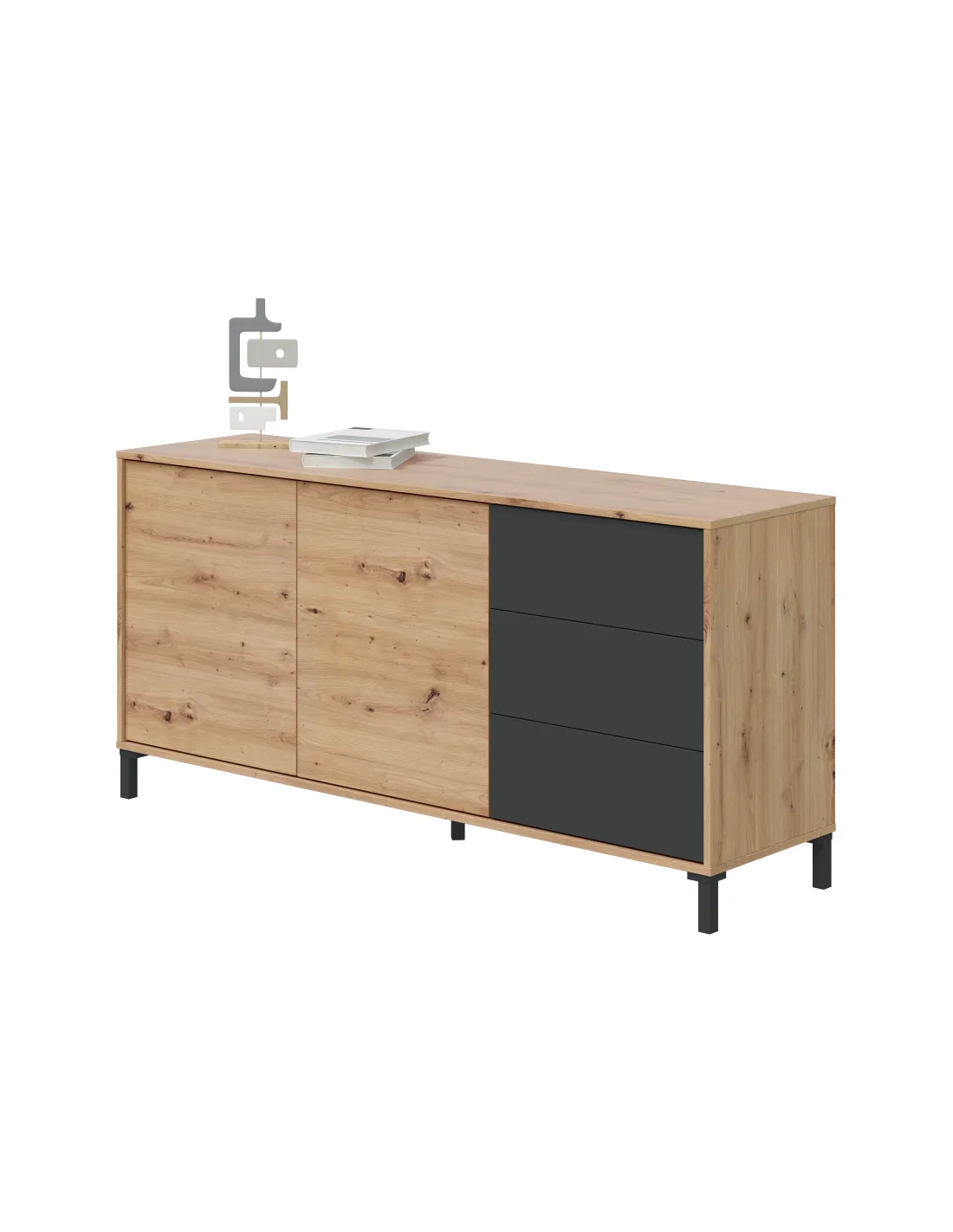 Mueble aparador con 2 puertas y estantes interiores, acompañado de 3 cajones en la parte derecha y apoyado sobre patas, ideal para organizar vajilla, textiles y objetos decorativos en el salón o comedor.