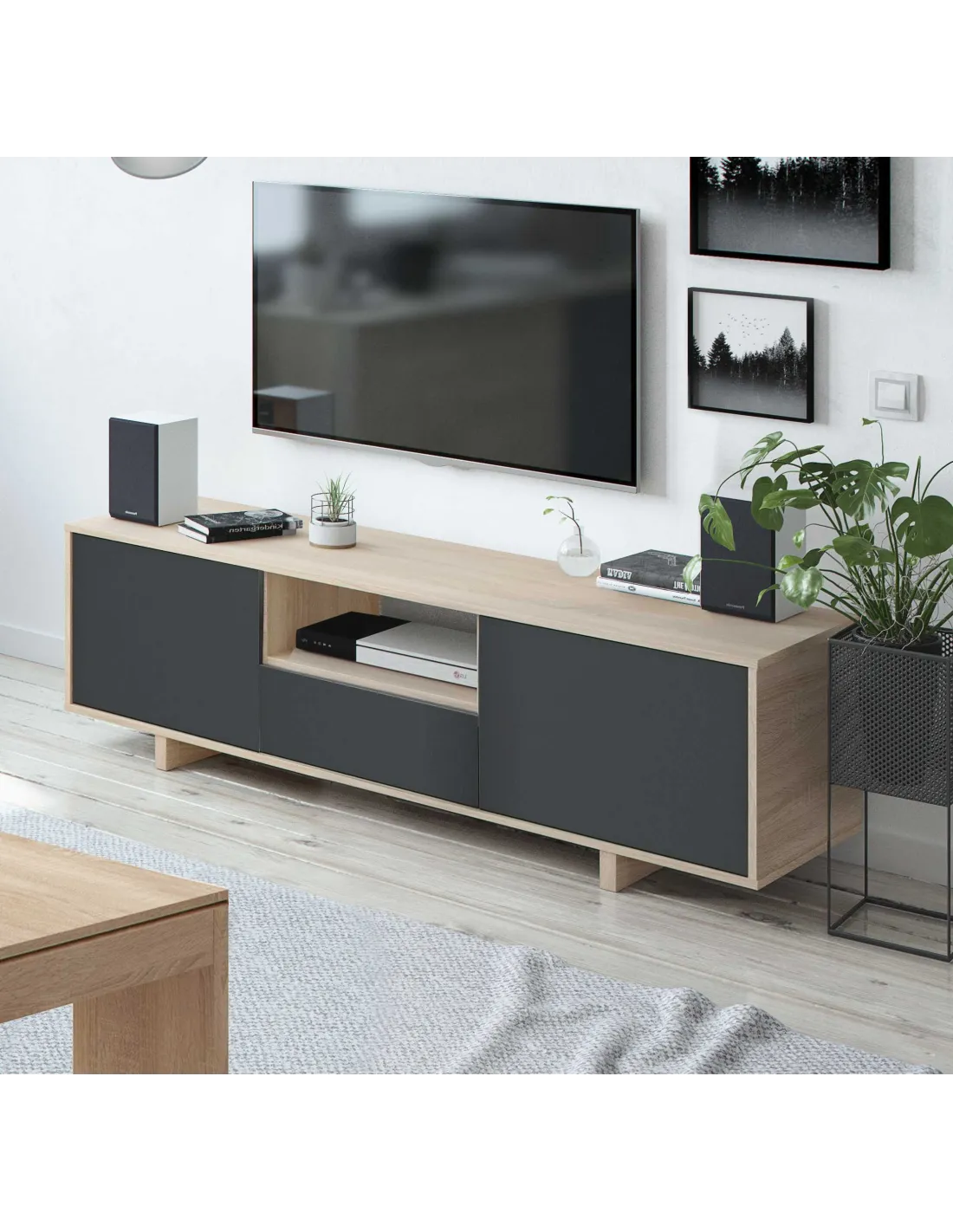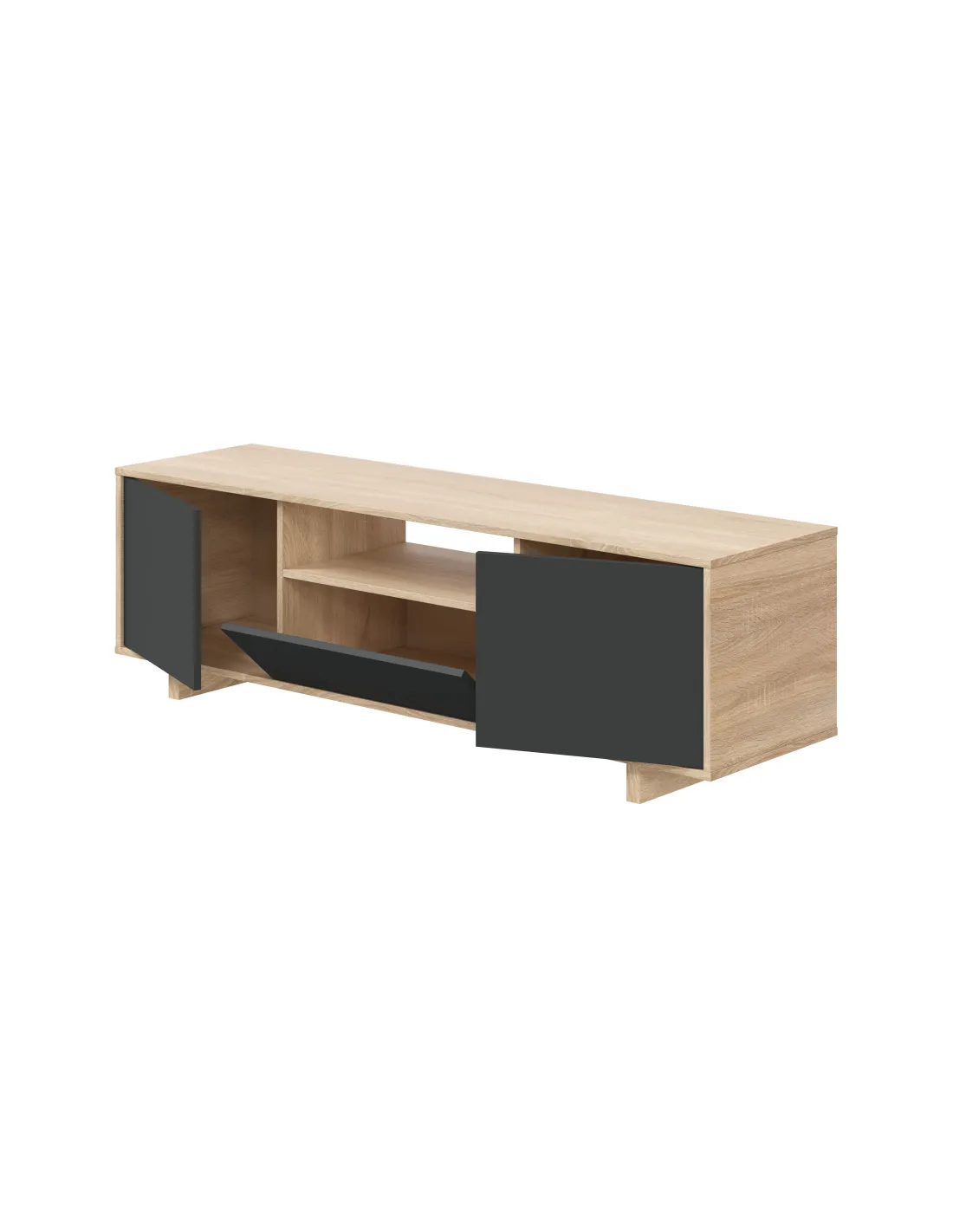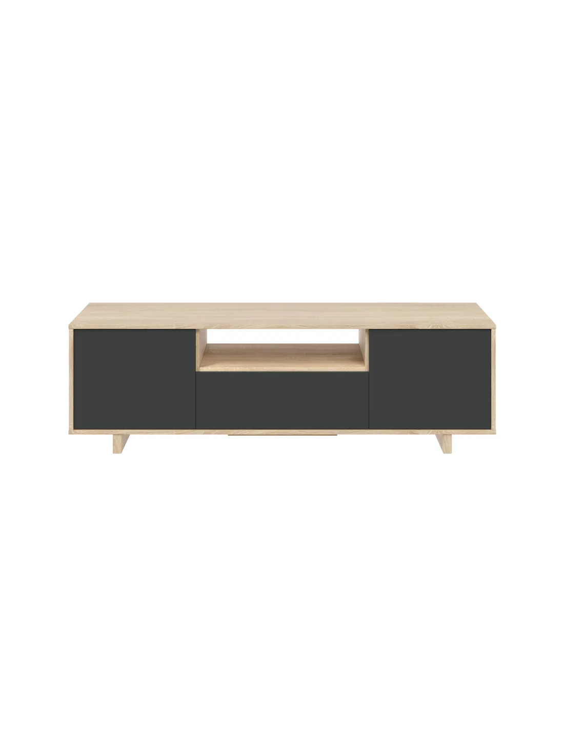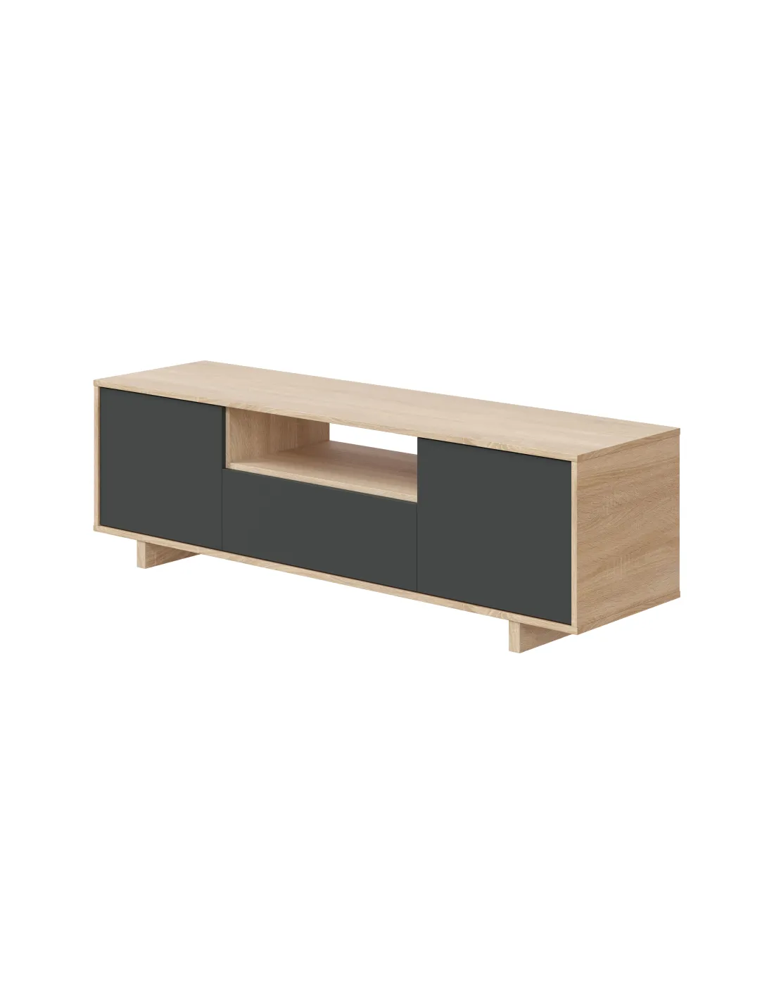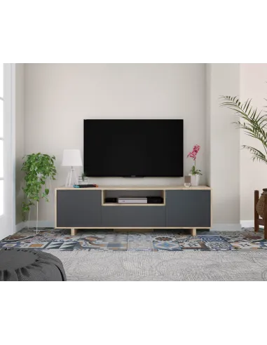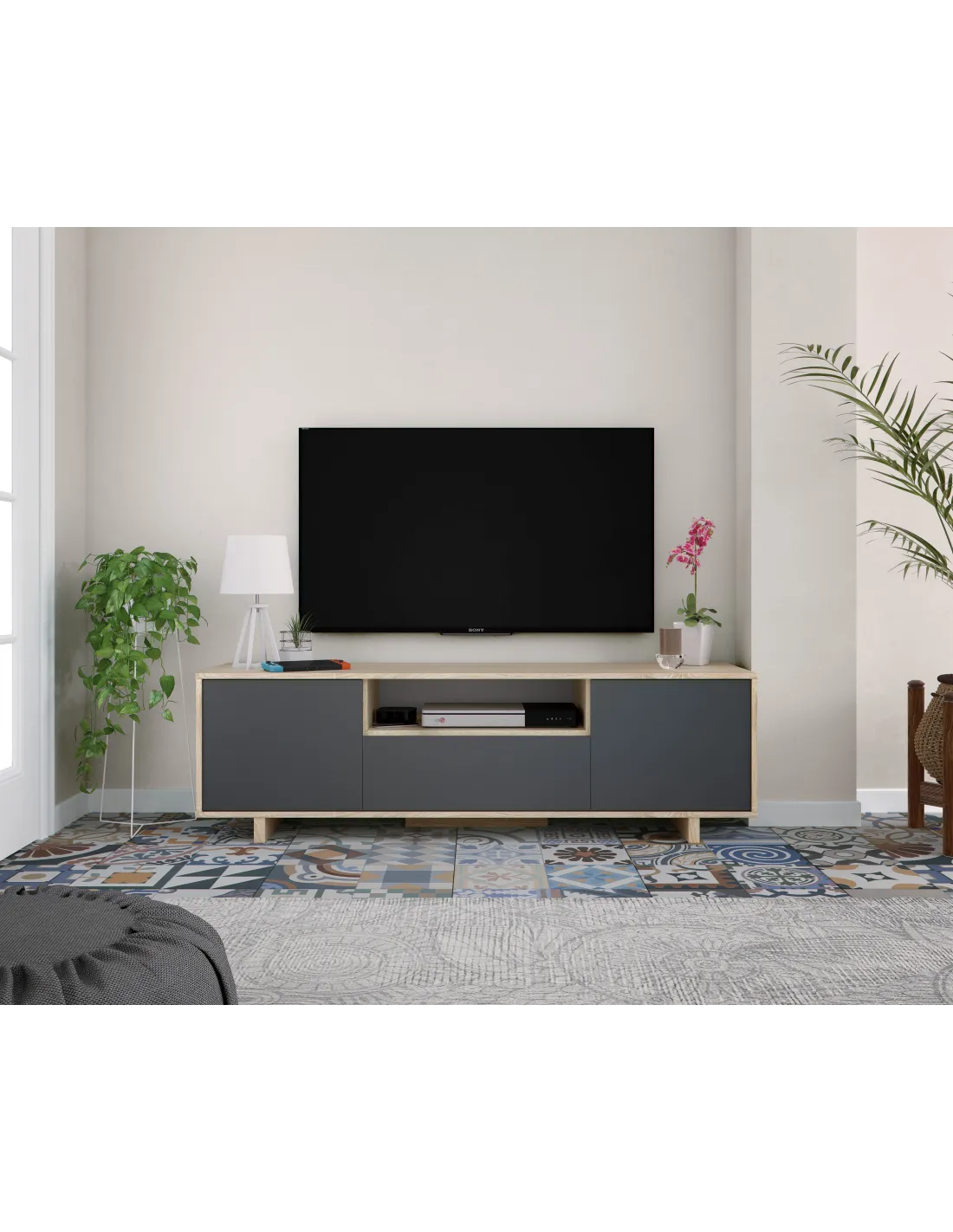 Mueble de televisión con 3 puertas y un hueco en la parte central, ideal para organizar dispositivos electrónicos y accesorios en el salón.