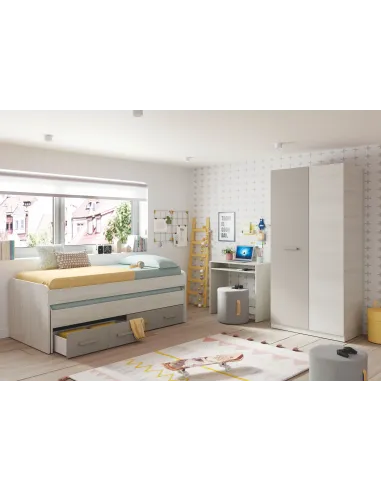 Cama doble diseñada para colchones de 190x90 (cama superior) y 180x90 (cama inferior), equipada con 2 cajones en la parte inferior del mueble para ampliar la capacidad de almacenamiento.