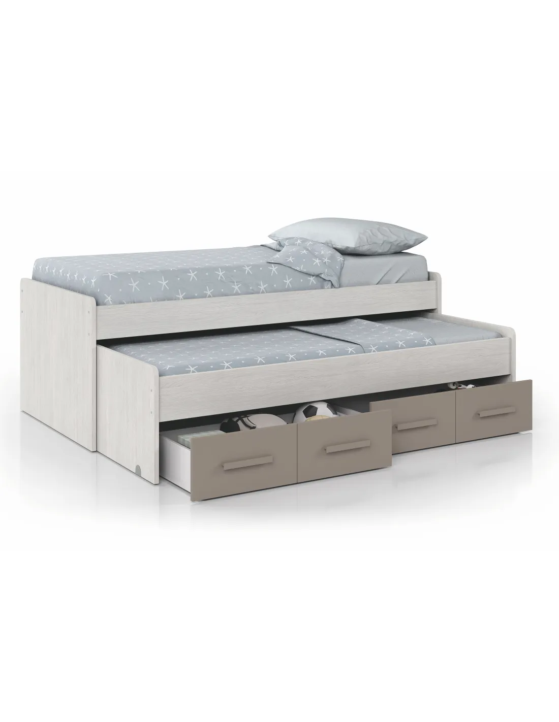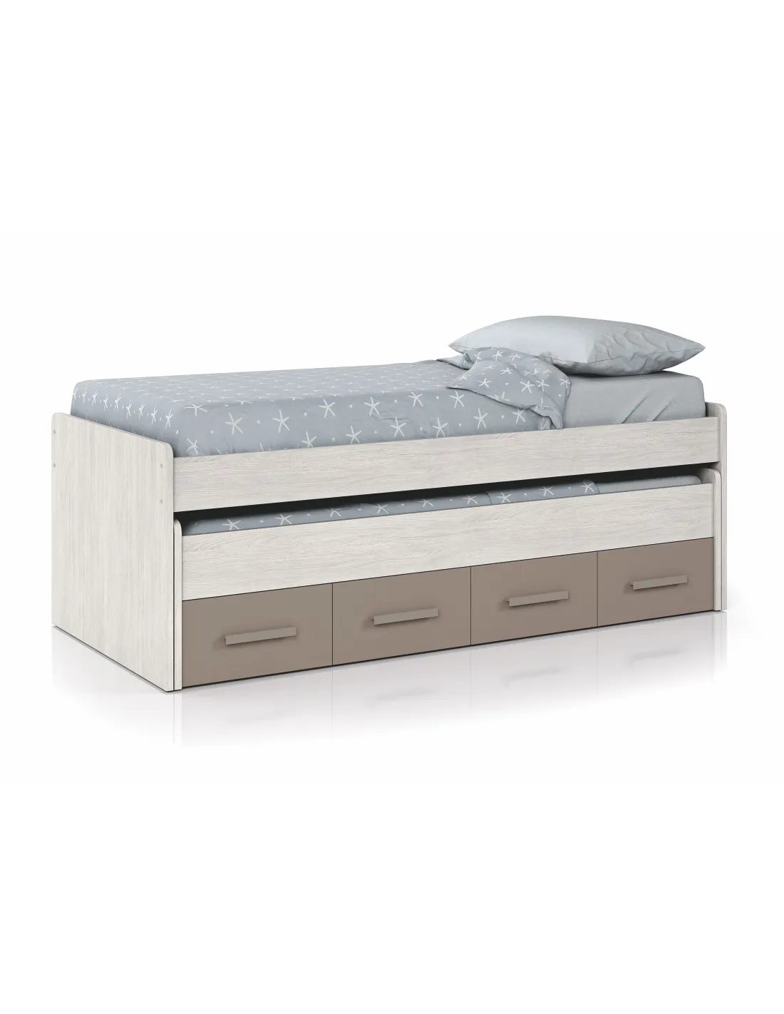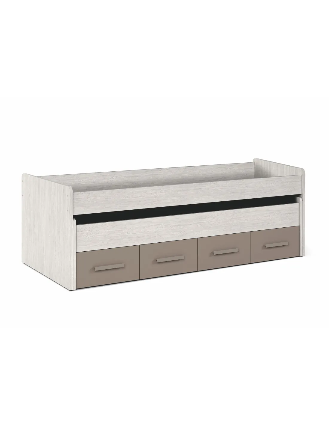 Incorpora larguero metálico de refuerzo para la cama superior, tiradores ABS (termoplástico de alta resistencia) pintados en color basalto y tacos ABS quitarruidos y antirayas para la cama superior. Dispone de ruedas ocultas para la cama inferior y para los cajones.