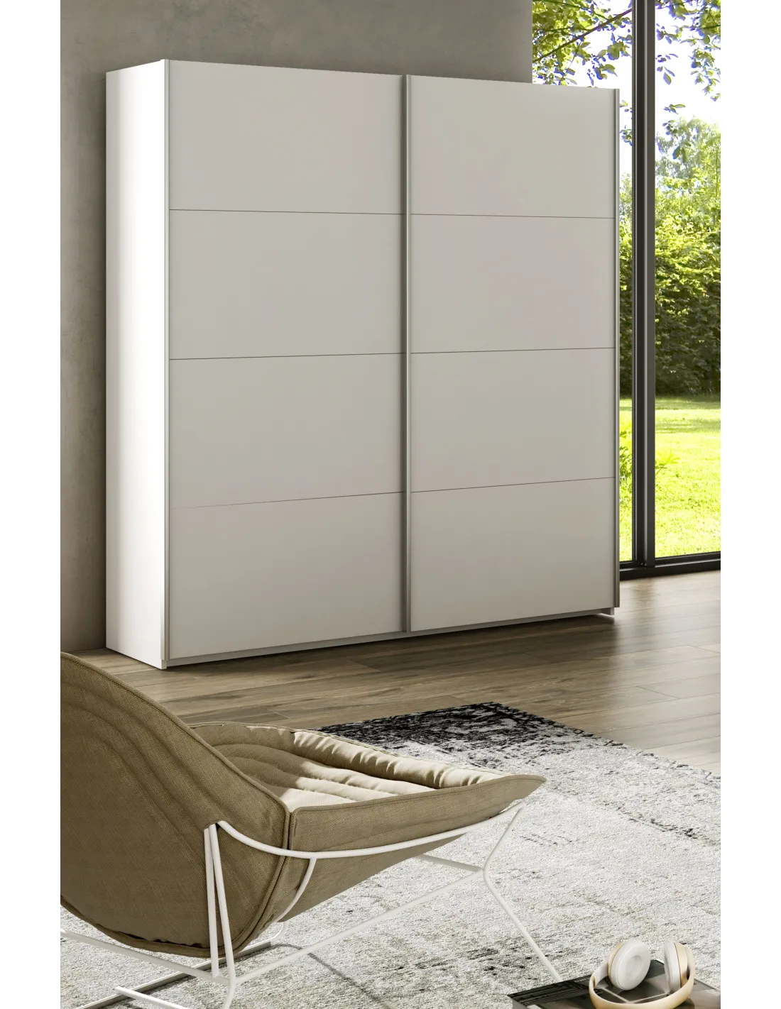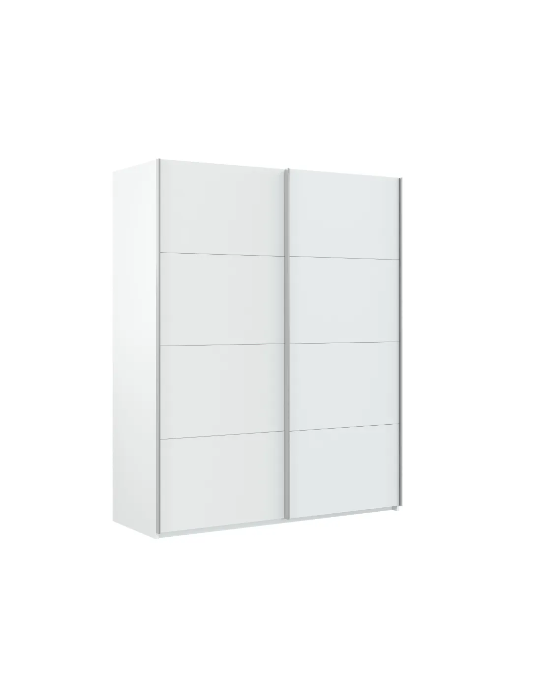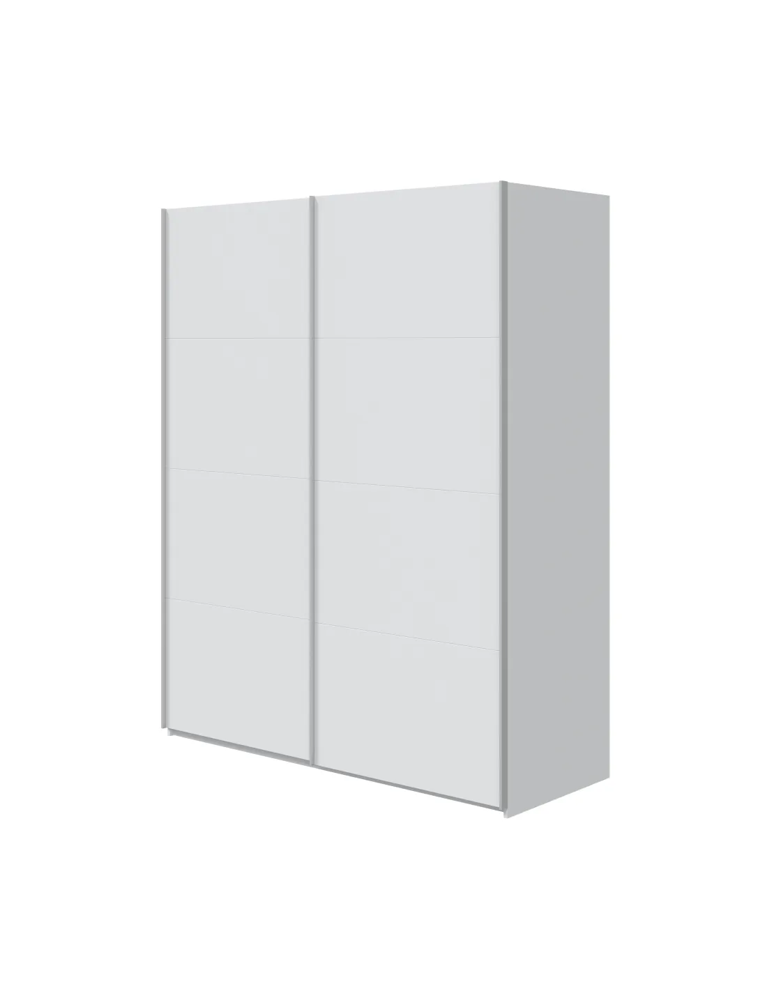 Incorpora barra de colgar de aluminio extraíble (2 unidades), guías correderas metálicas para las puertas con freno y tiradores de aluminio tipo perfil. Dispone de tacos ABS quitarruidos y antirayas para la parte inferior del mueble. El interior está acabado en blanco y los estantes son fijos en altura.