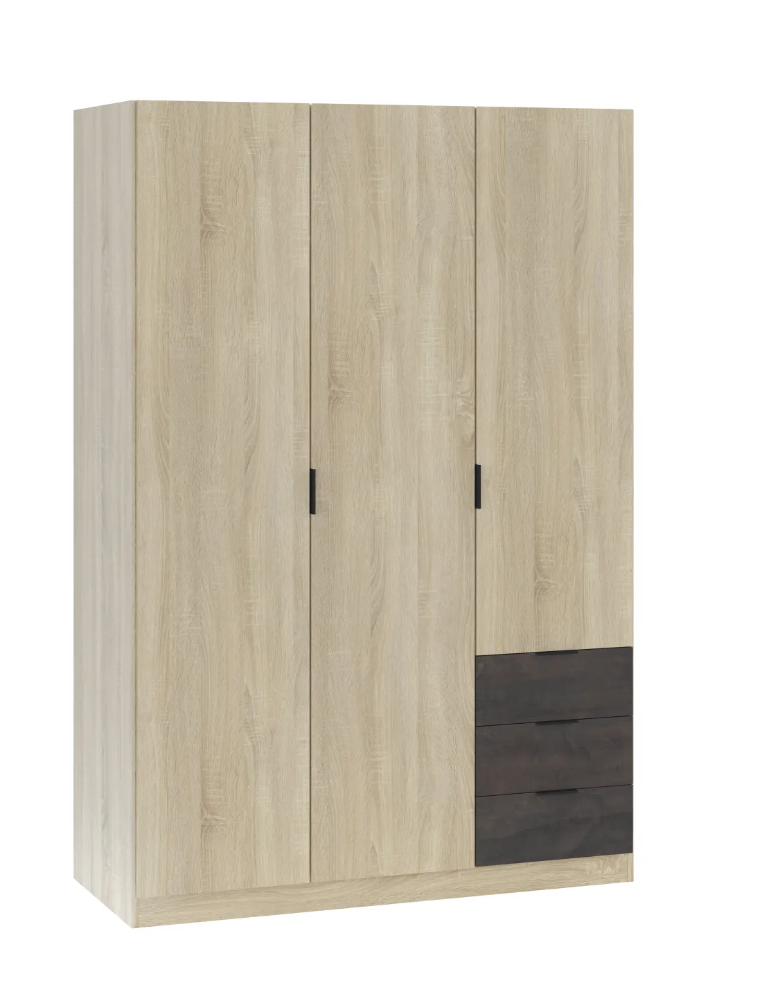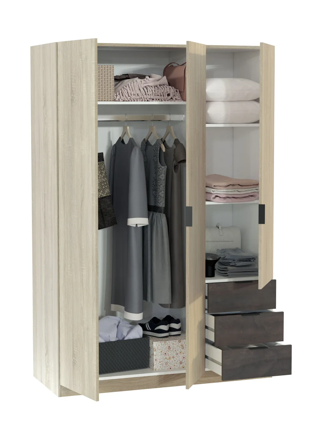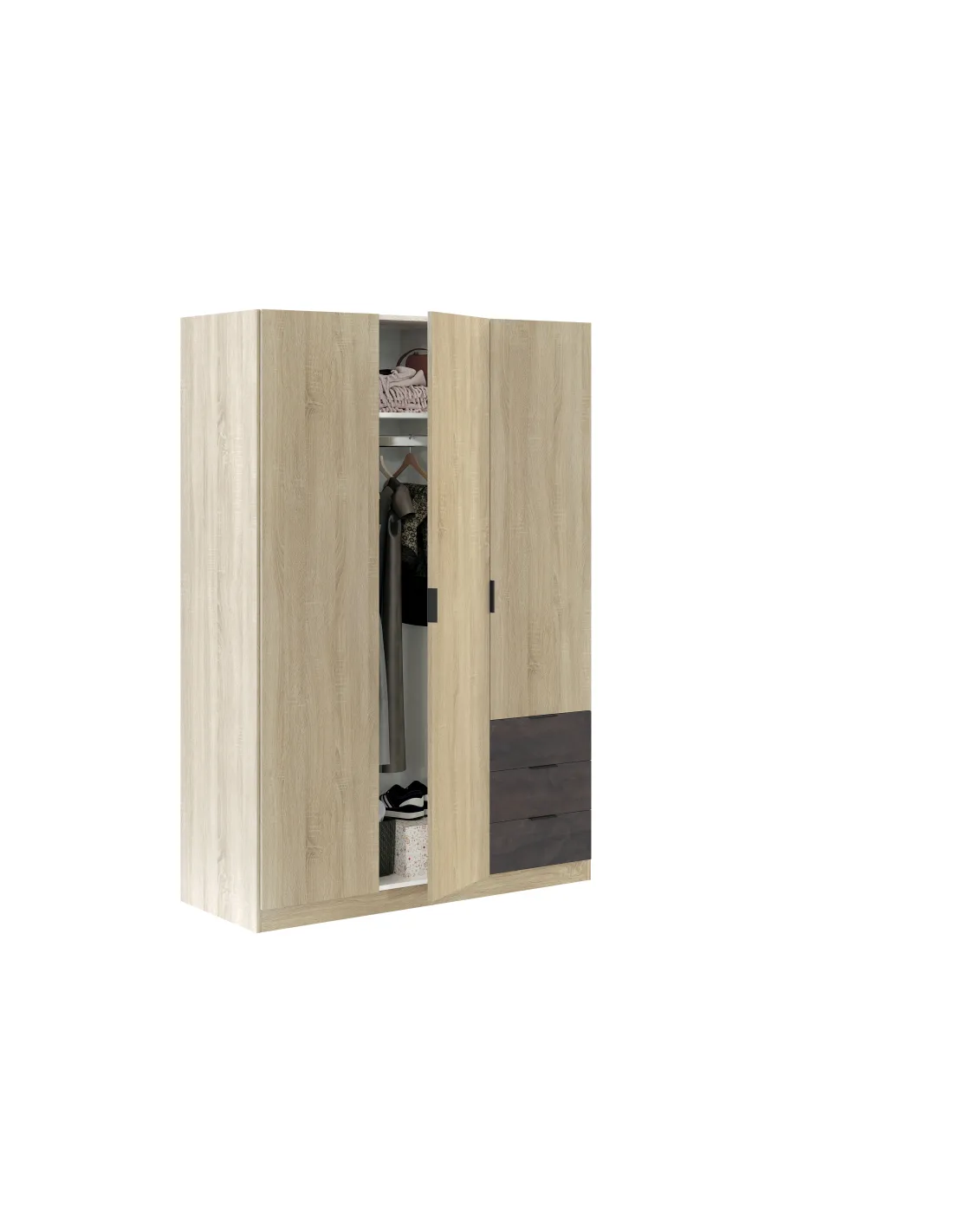 Armario de 3 puertas con barra de colgar de aluminio extraíble y estantes en su interior, acompañado de 3 cajones inferiores situados en la parte derecha, ideal para una organización completa del dormitorio.