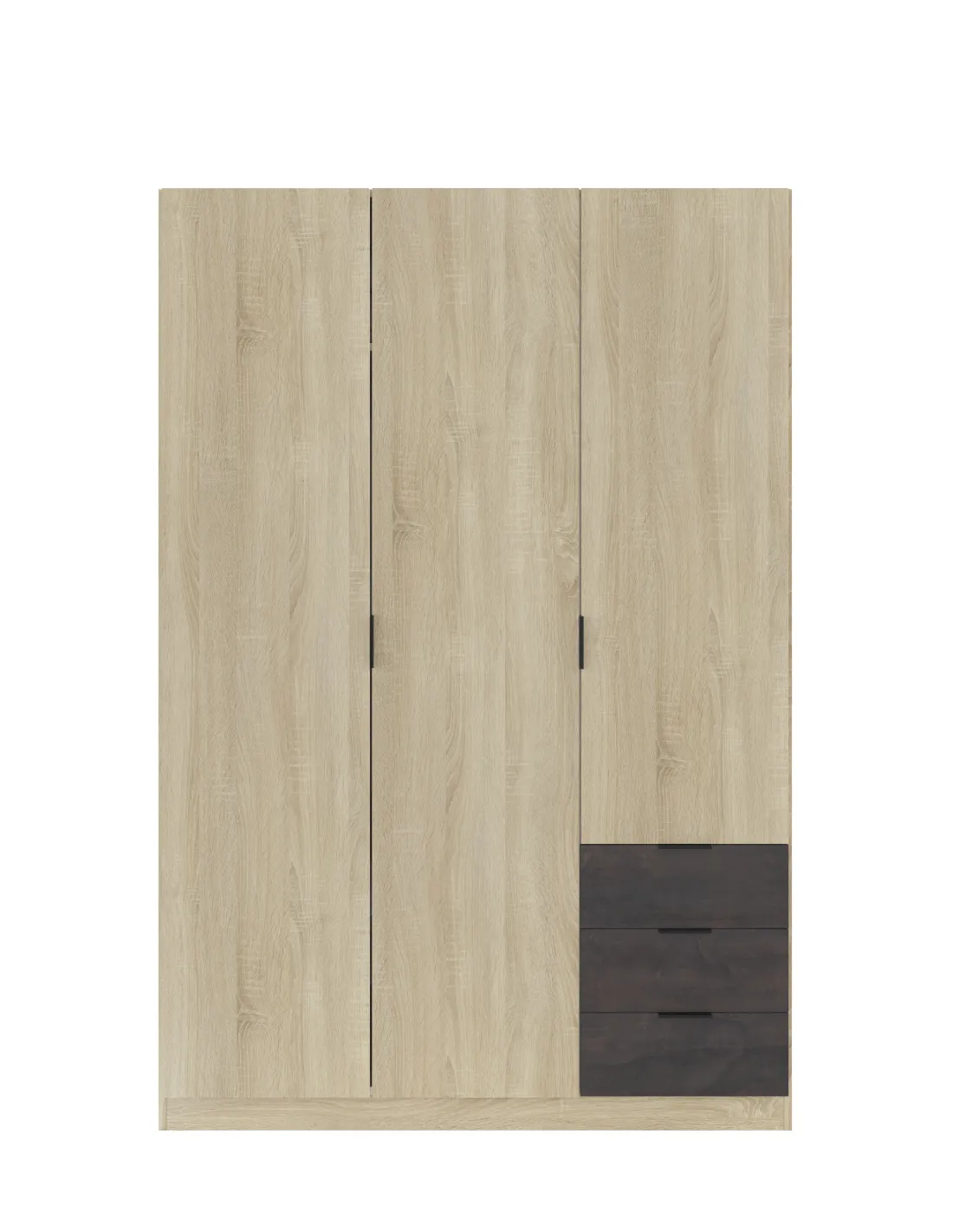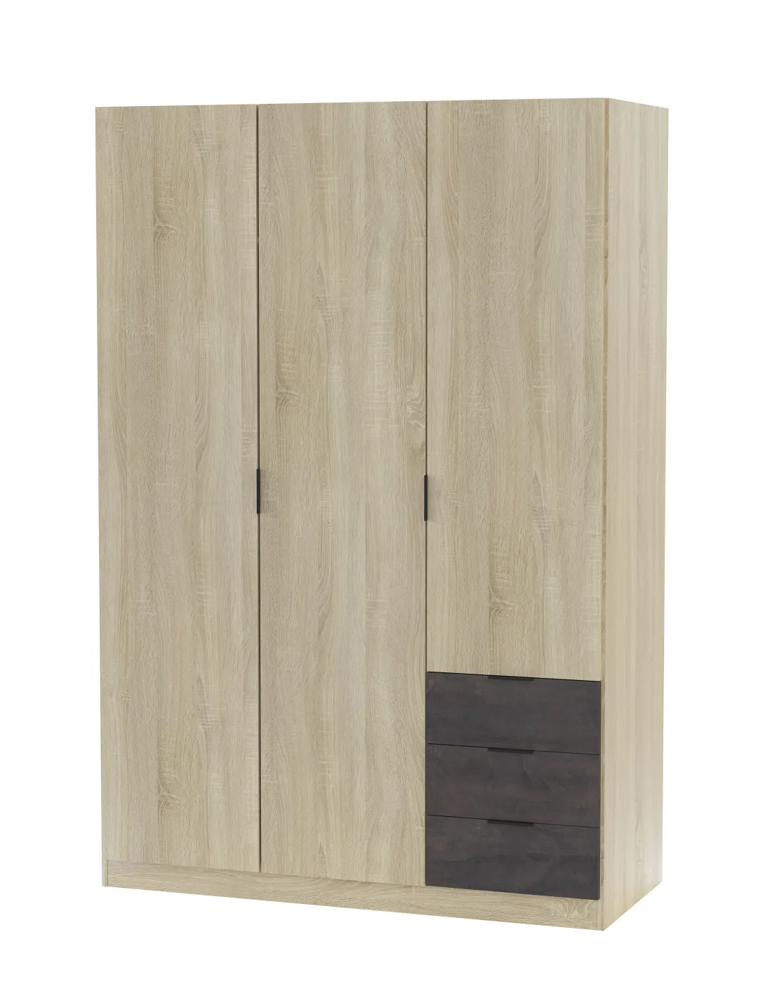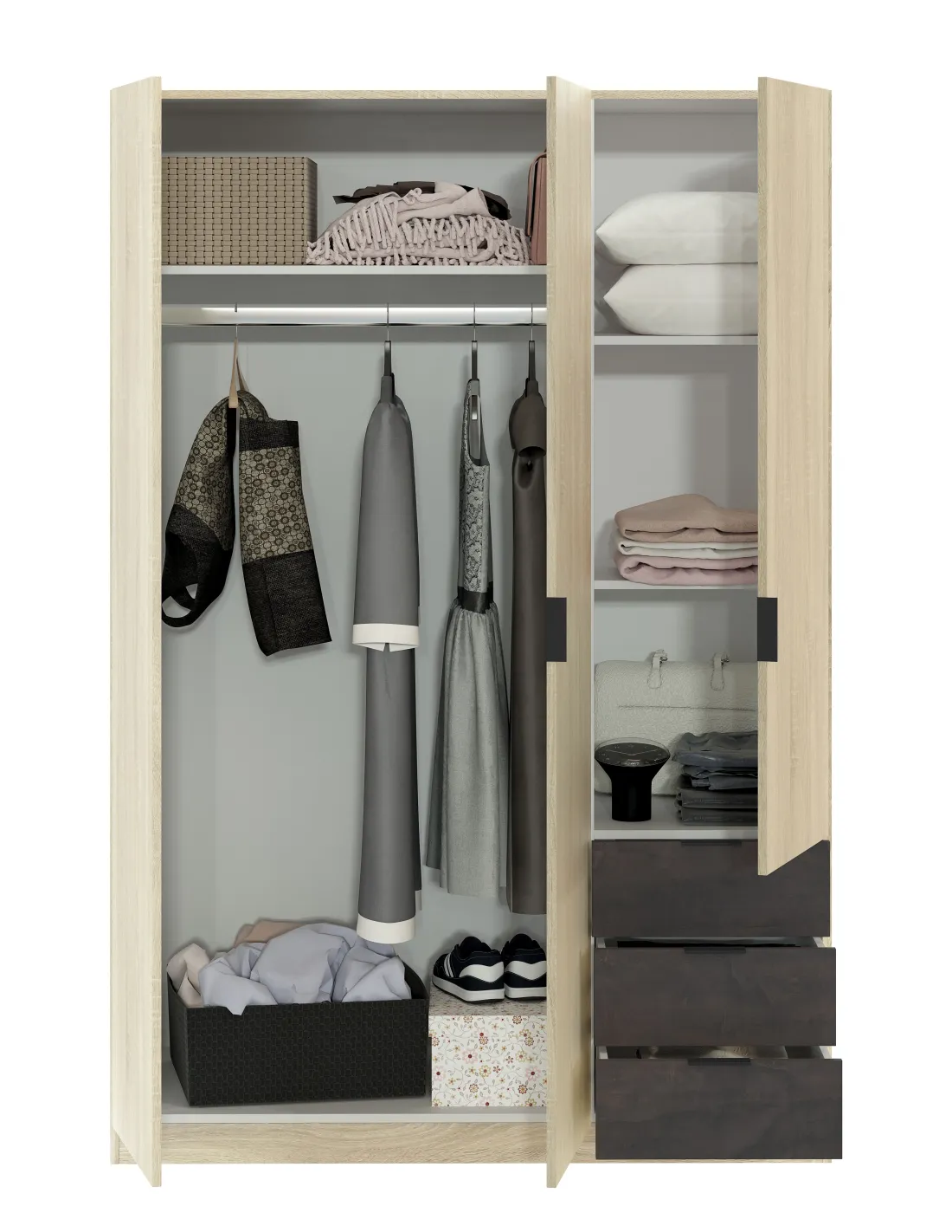 Armario de 3 puertas con barra de colgar de aluminio extraíble y estantes en su interior, acompañado de 3 cajones inferiores situados en la parte derecha, ideal para una organización completa del dormitorio.