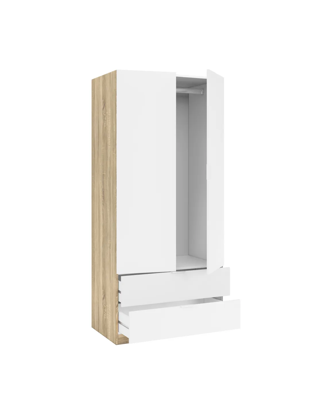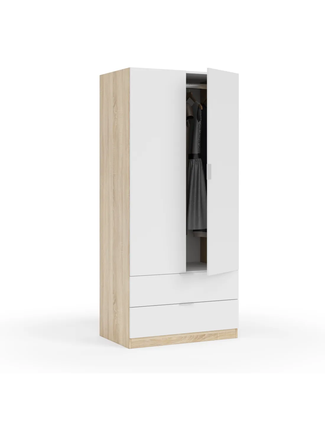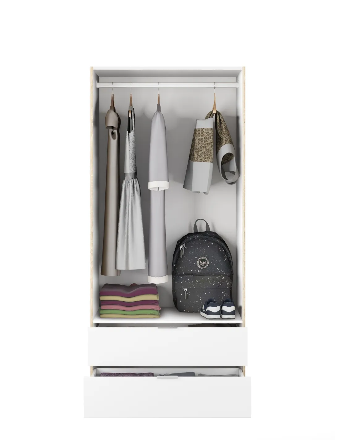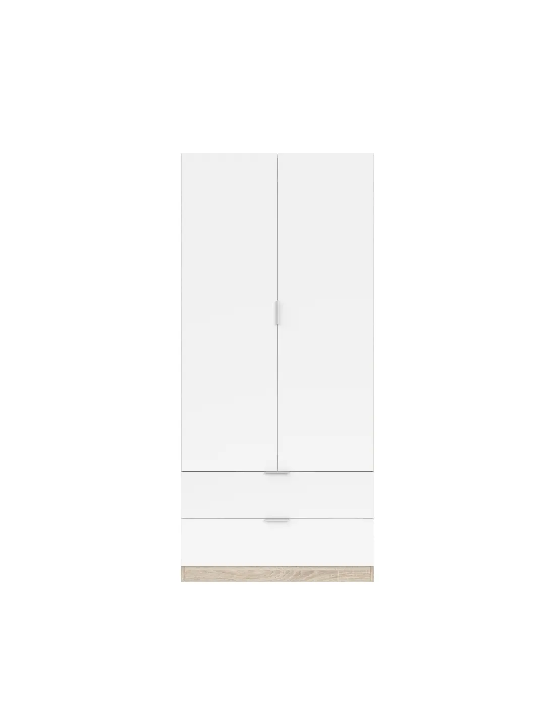 Armario de 2 puertas con barra de colgar y un estante en su interior, acompañado de 2 cajones inferiores, ideal para organizar ropa y complementos en el dormitorio.