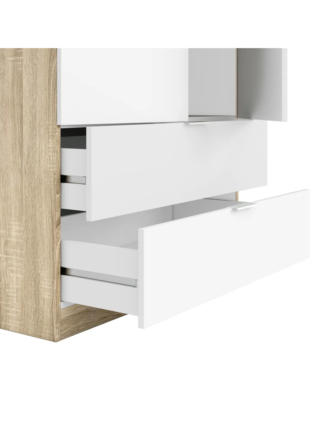 Incorpora barra de colgar de aluminio extraíble, guías correderas metálicas para los cajones (no extraíbles) y bisagras metálicas. Dispone de tacos ABS quitarruidos y antirayas para la parte inferior del mueble y tiradores de aluminio lacados en blanco (3 unidades). El interior del mueble está acabado en blanco.