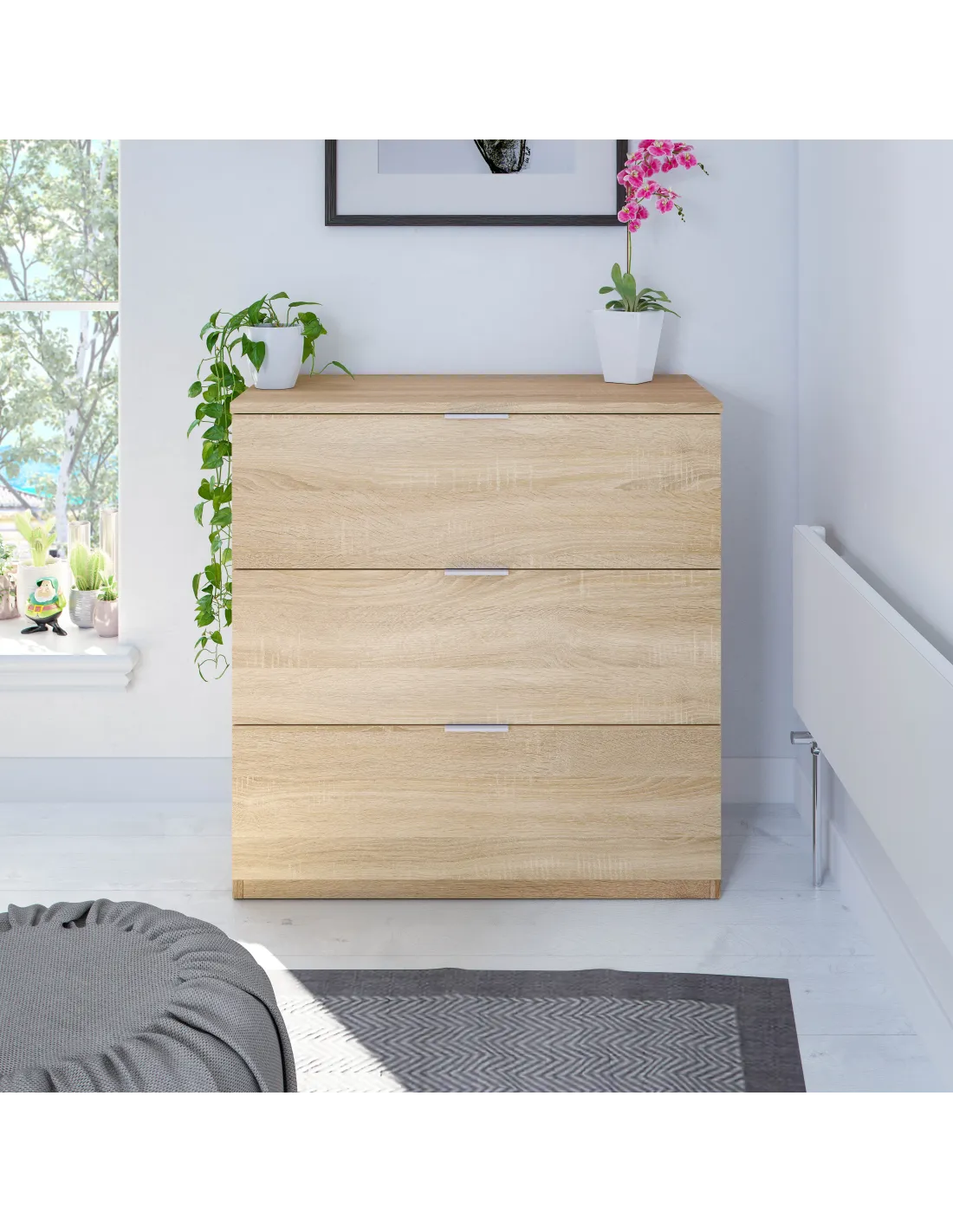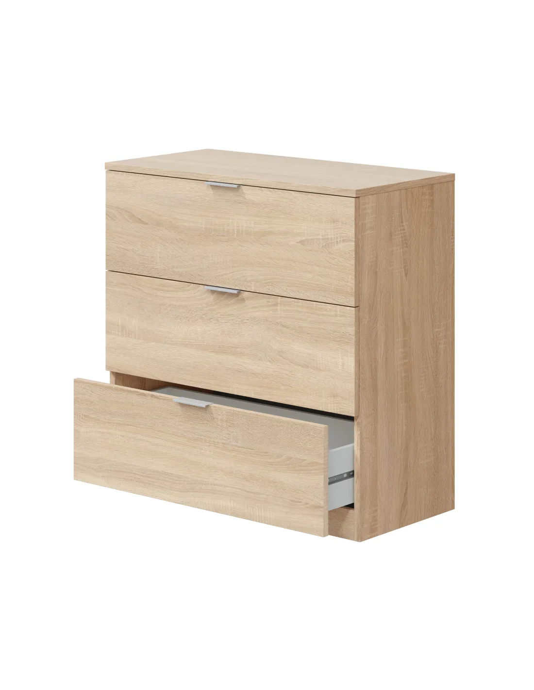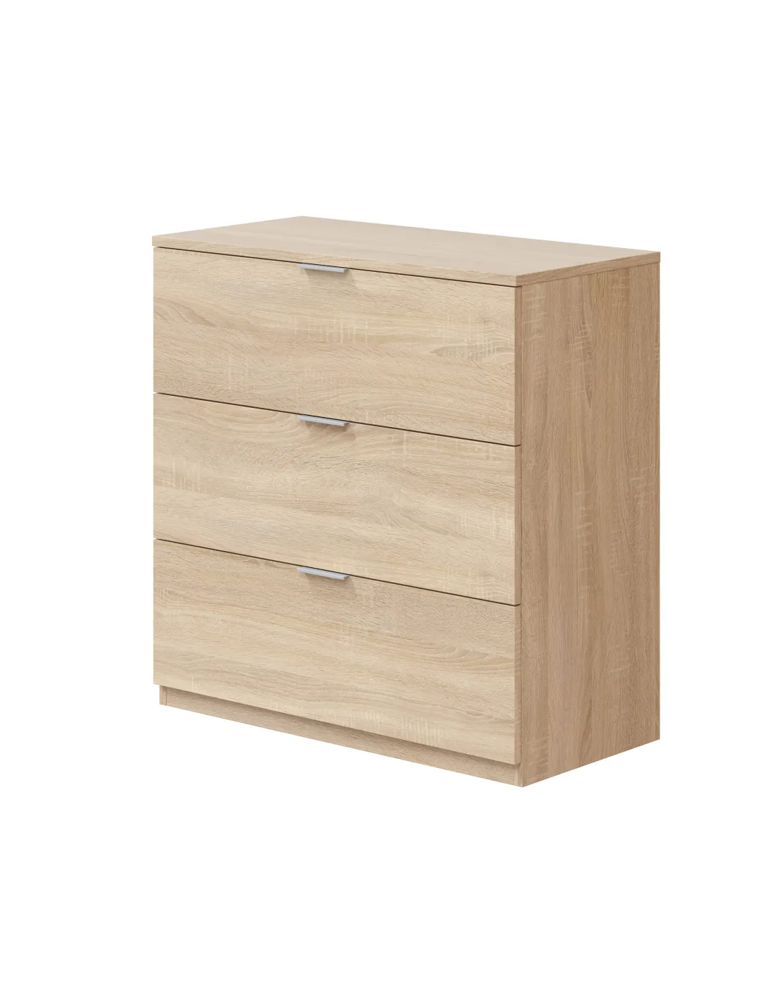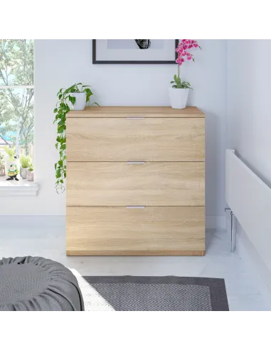 Cómoda con tres cajones, ideal para organizar ropa y complementos en el dormitorio, combinando funcionalidad y un diseño sencillo.