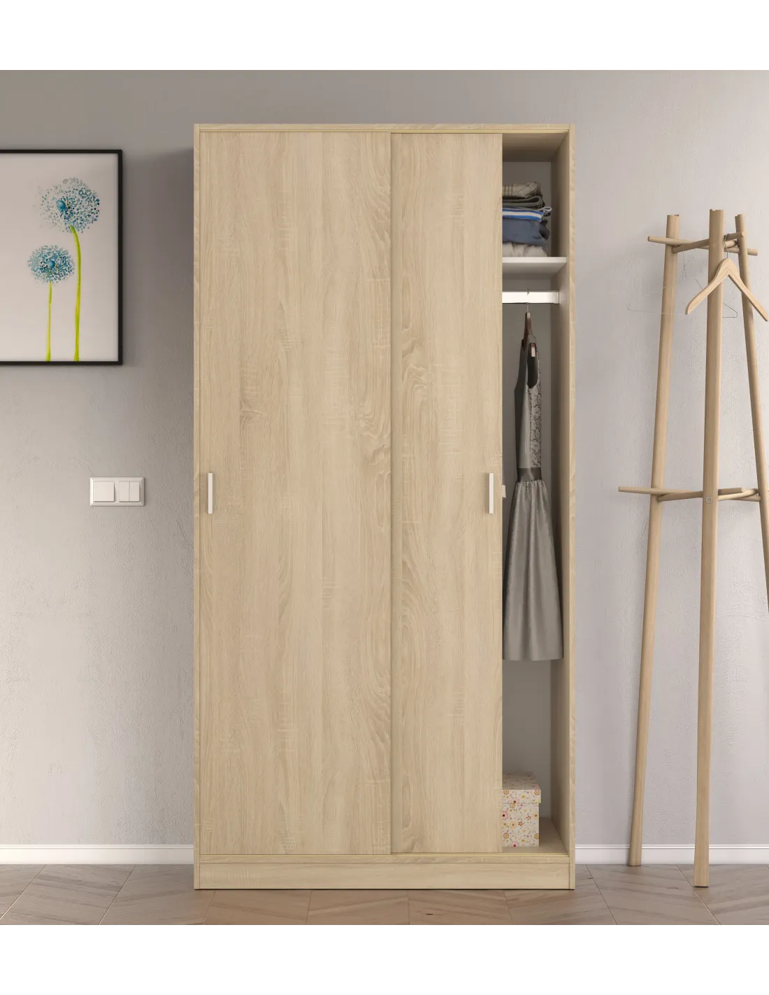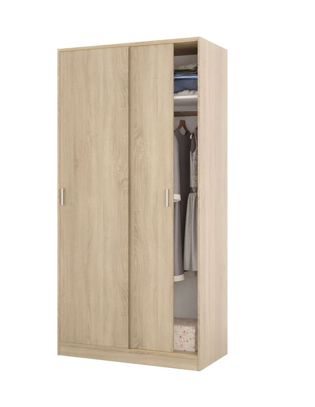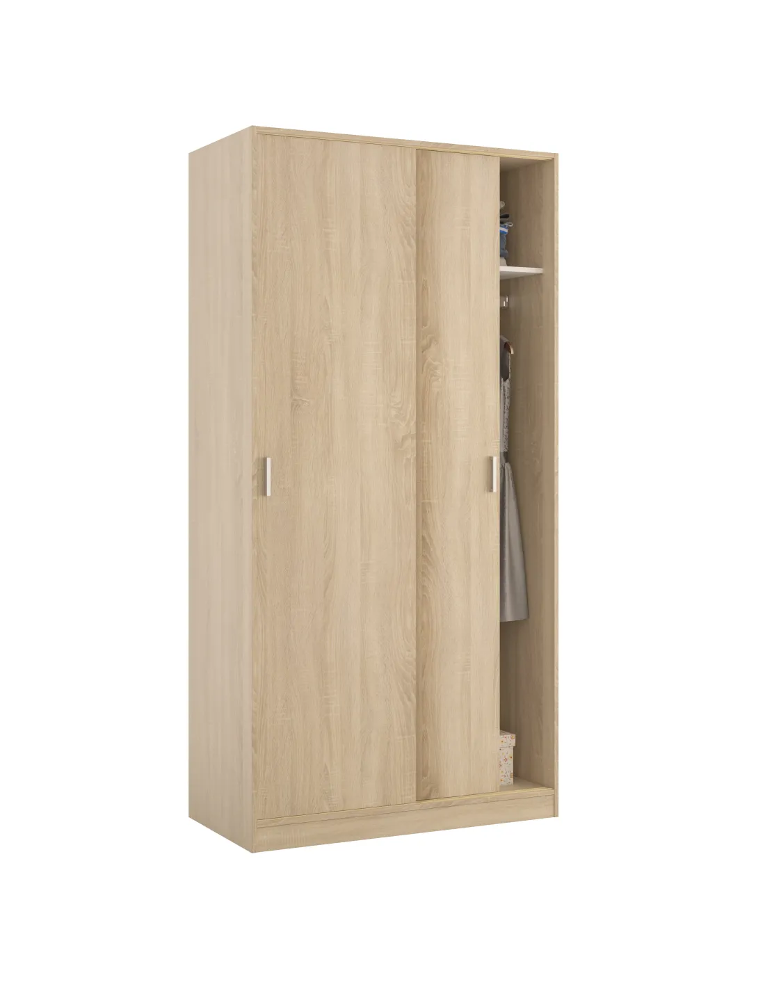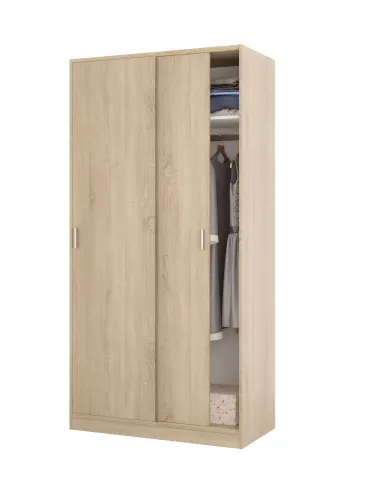 Armario de 2 puertas correderas con barra de colgar y un estante en su interior, ideal para organizar ropa y complementos en el dormitorio.