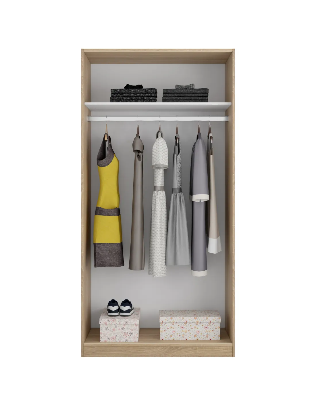Incorpora barra de colgar de aluminio extraíble, guías correderas ABS para las puertas y tiradores ABS pintados en gris aluminio. Dispone de tacos ABS quitarruidos y antirayas para la parte inferior del mueble. El interior está acabado en blanco.