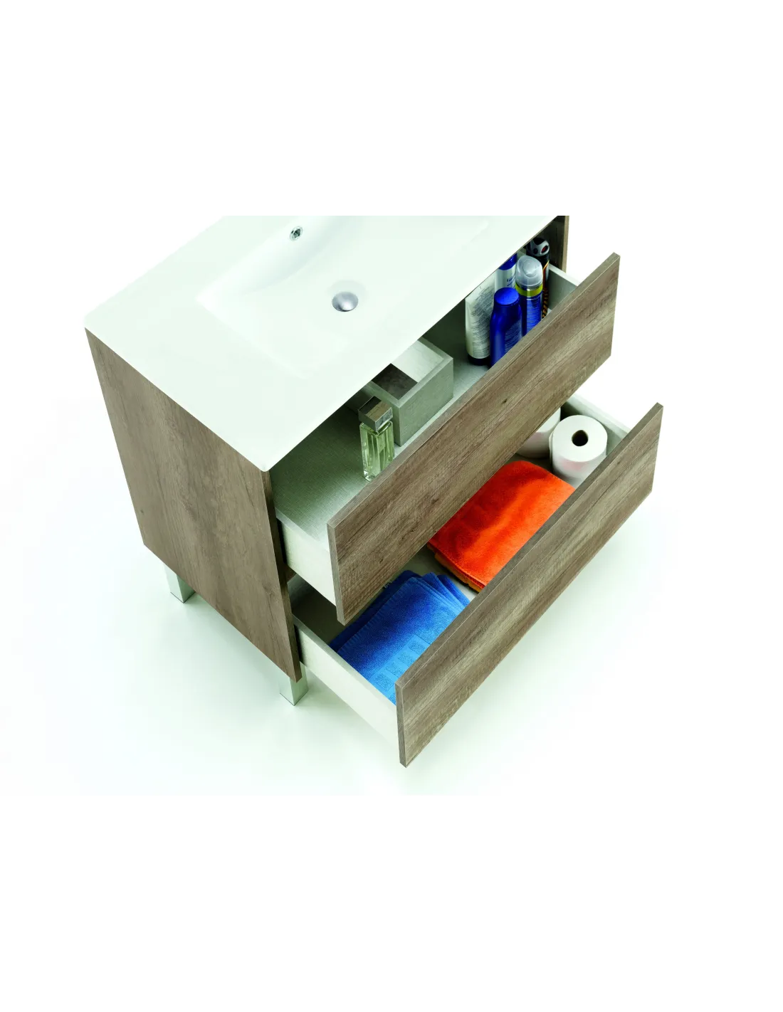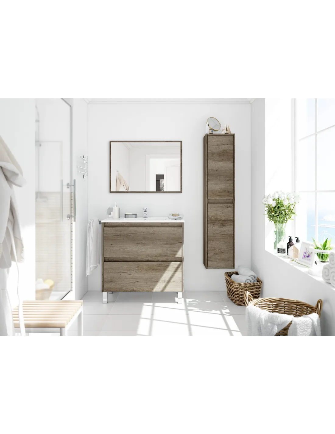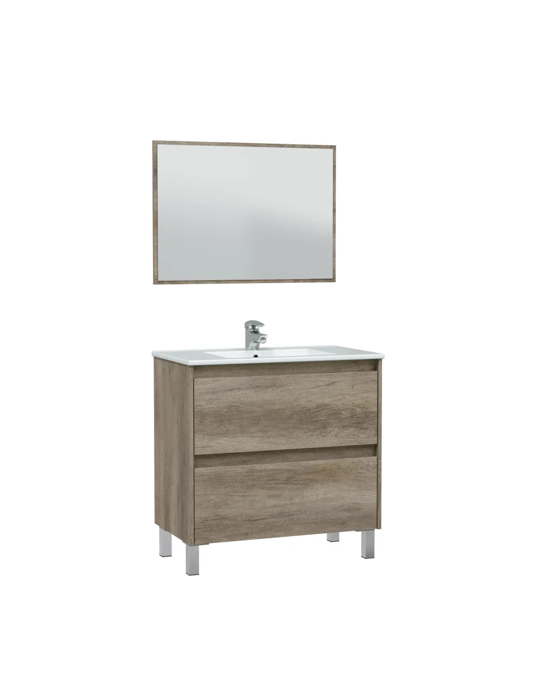 Mueble de baño con 2 cajones y 4 patas. Incluye espejo del mismo acabado para un conjunto coordinado y elegante.