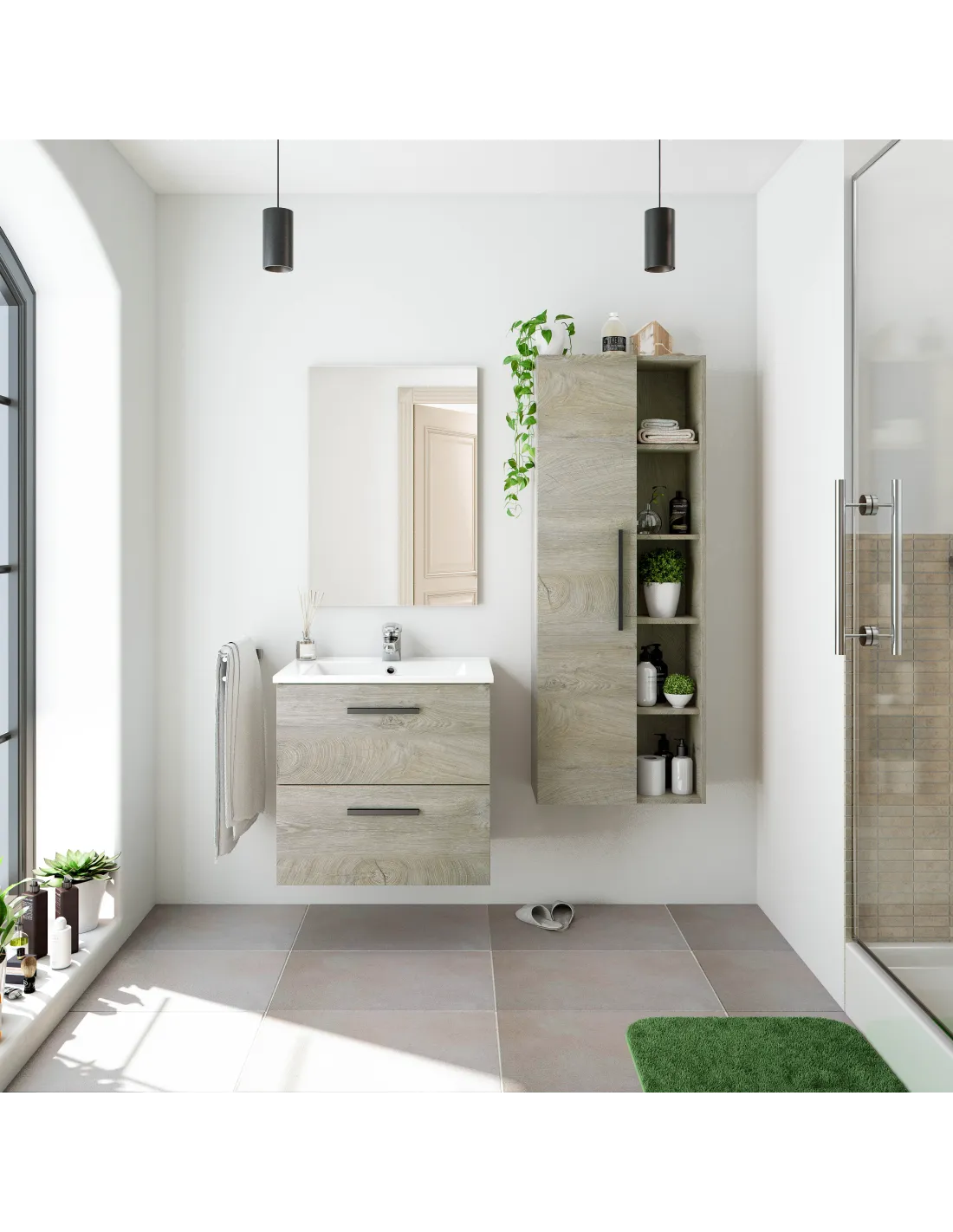 Se incluyen herrajes para colgar en la pared regulables en altura y tiradores aluminio lacados en negro mate para un acabado moderno y elegante.