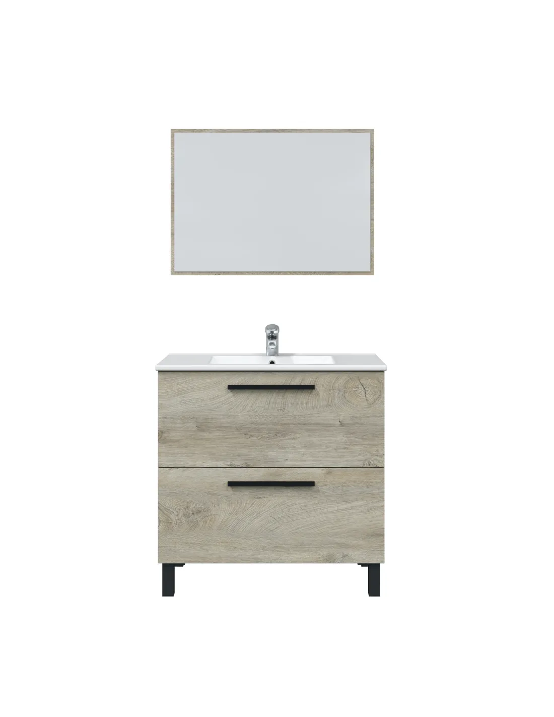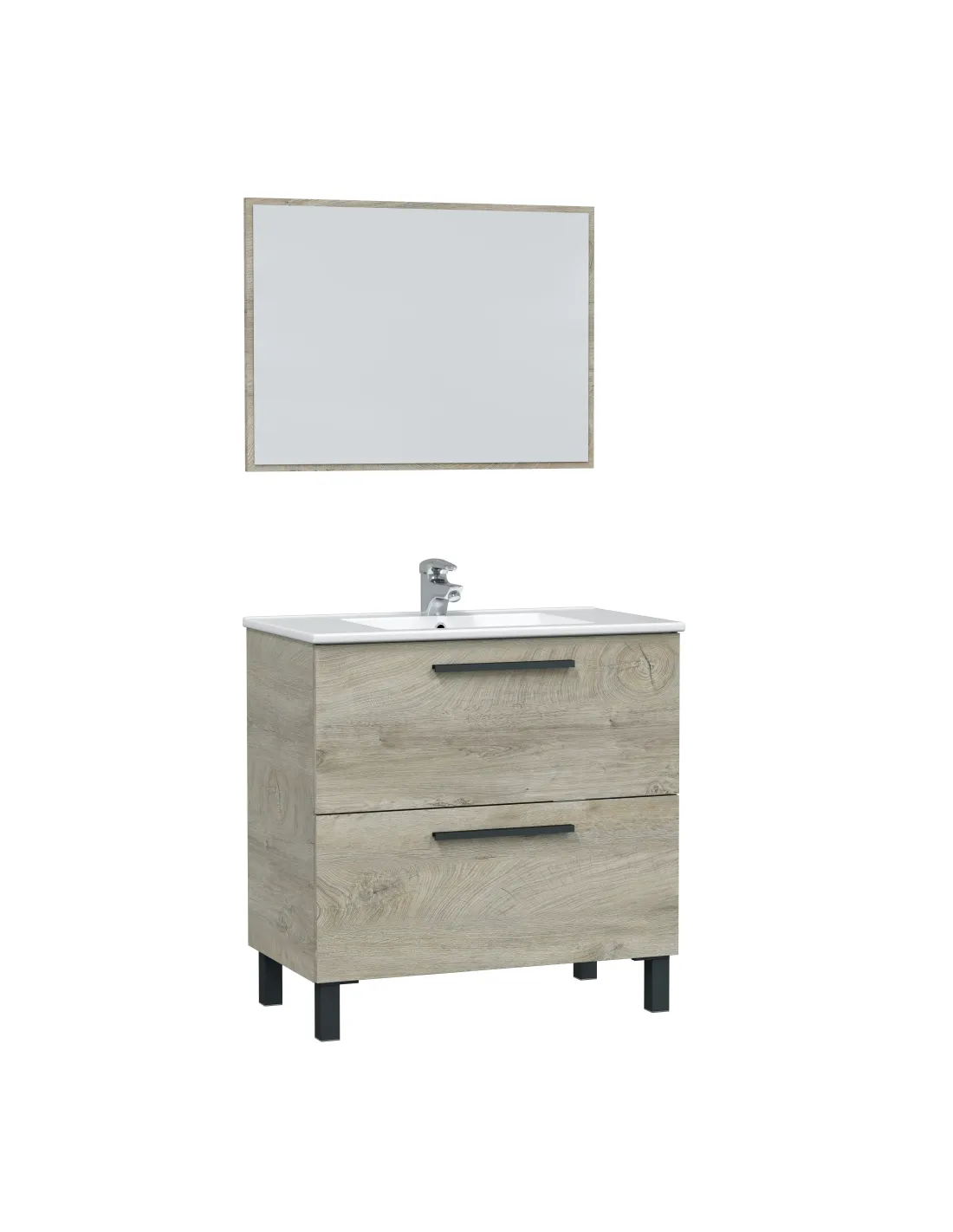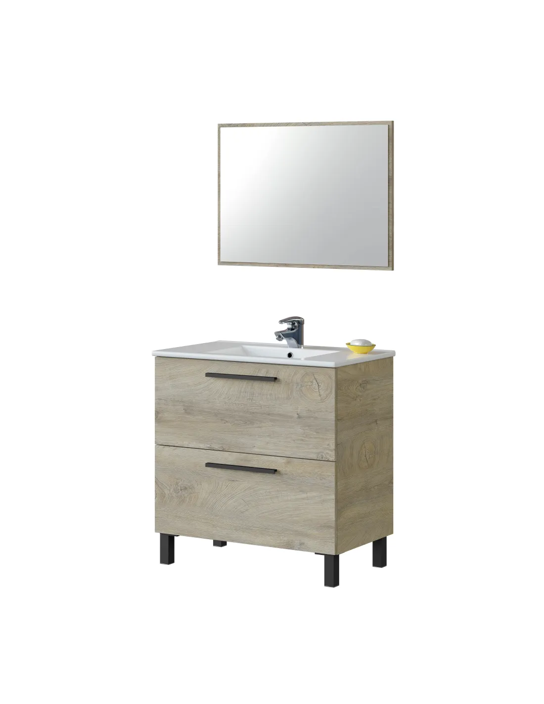 Mueble de baño con 2 cajones y 4 patas. Incluye espejo del mismo acabado para un conjunto armonioso.