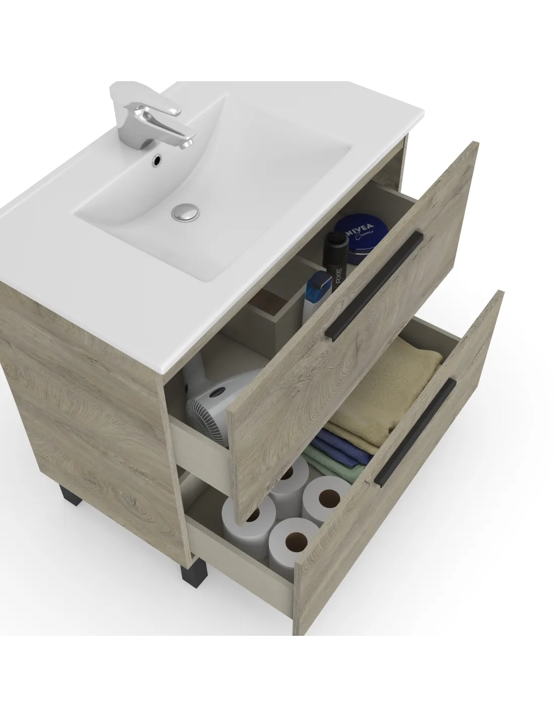 Cuenta con guías ocultas con cierre progresivo mediante sistema Soft Close, garantizando un cierre suave y silencioso. El cajón superior dispone de salva-sifón para optimizar el espacio interior.