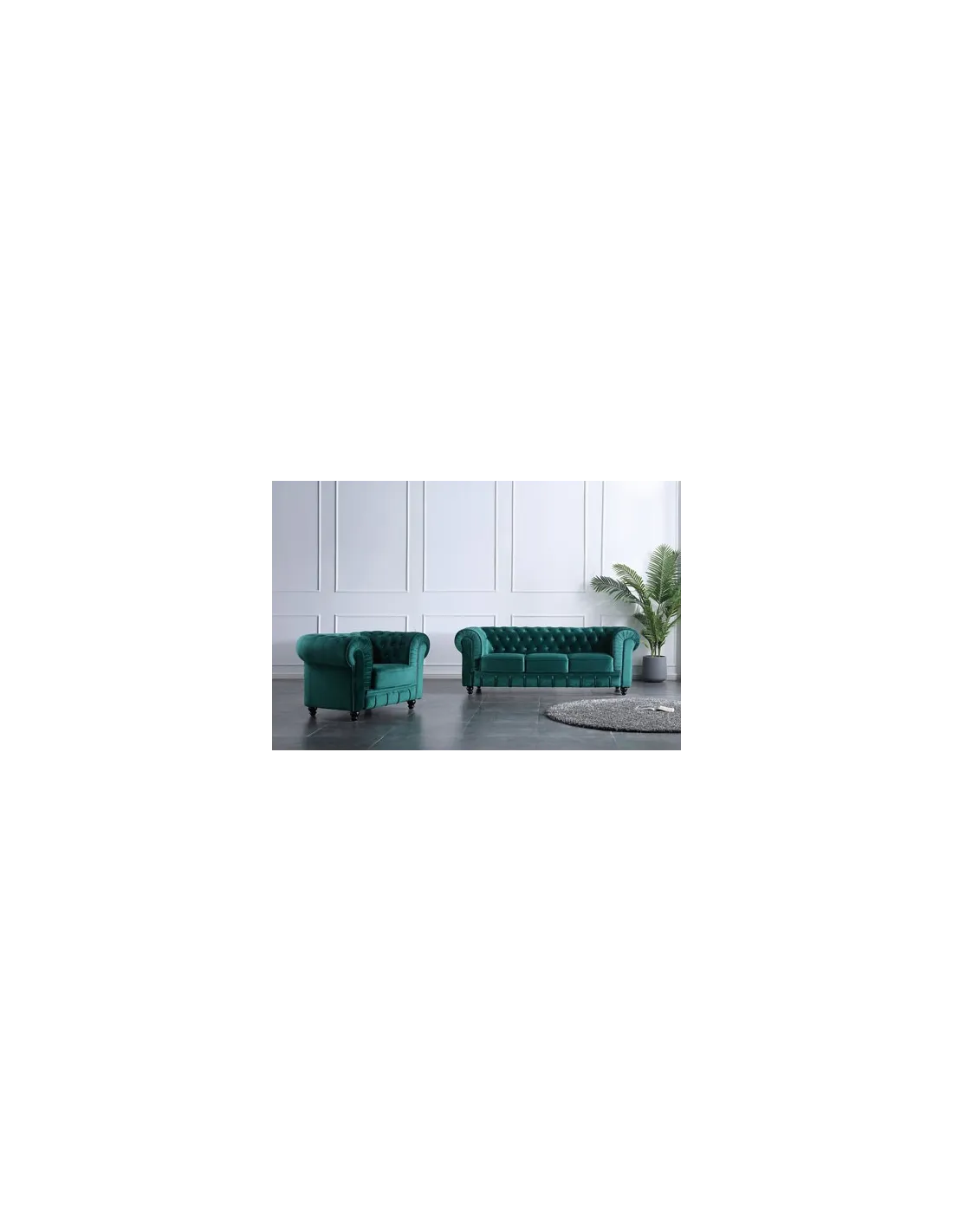 Sofá diseño clásico Chesterfield 3 plazas Acabado capitoné con botones tapizados Tejido Velvet verde Medidas: 205 x 82 x 72 cm - Unidad venta : caja 1 Ud - Volumen : 1 245 M 3 x Ud Entradas previstas : 5 Ud(s) - 15/03 4 Ud(s) - 6 / 8 semanas Colores disponibles : Símil piel negro 7 Ud(s) - 15/03 Chocolate vintage En stock : 2 Uds Velvet verde En stock : 5 Uds 7 Ud(s) - 15/03