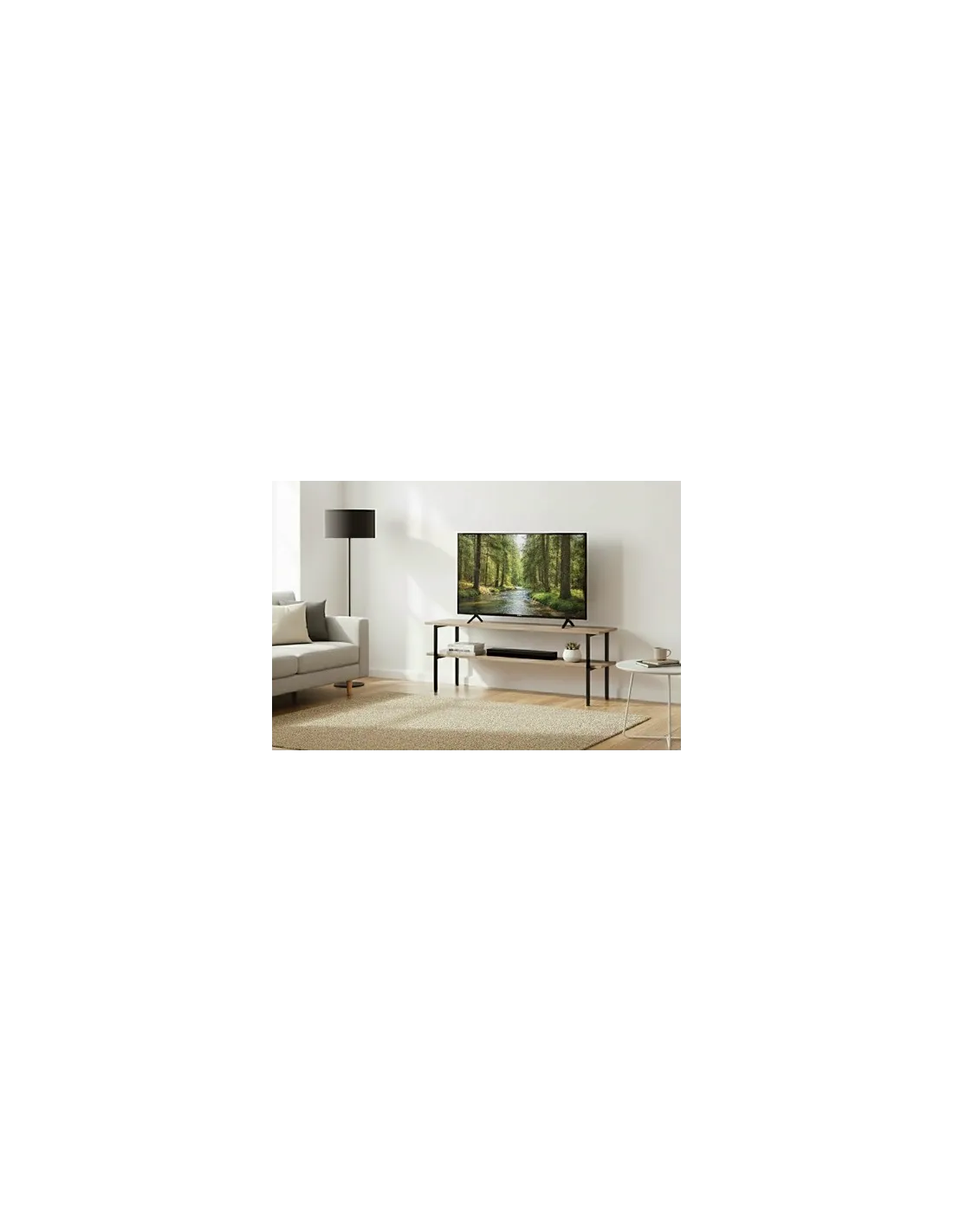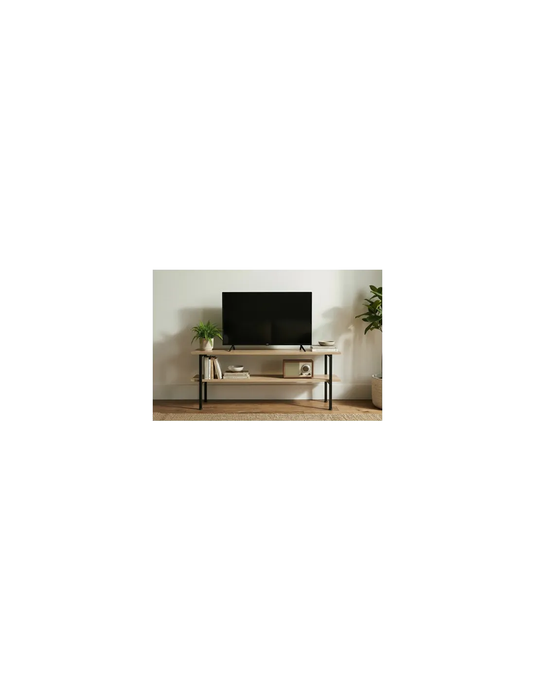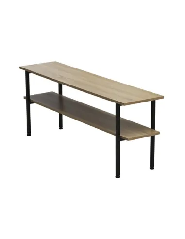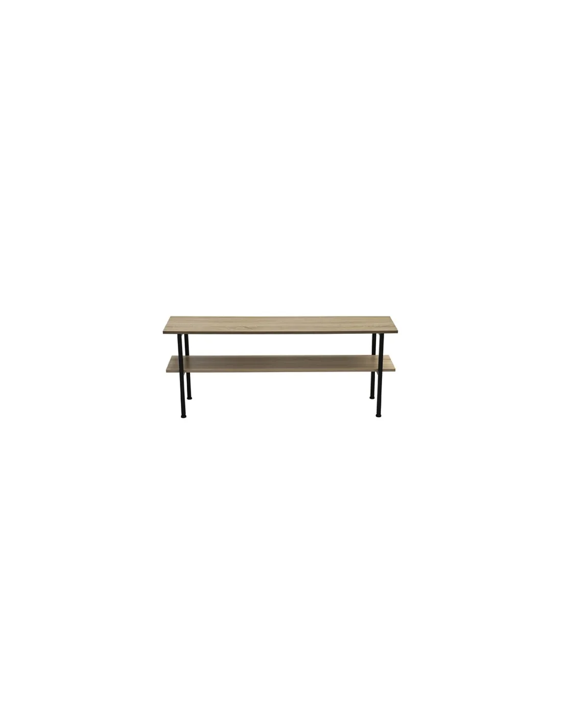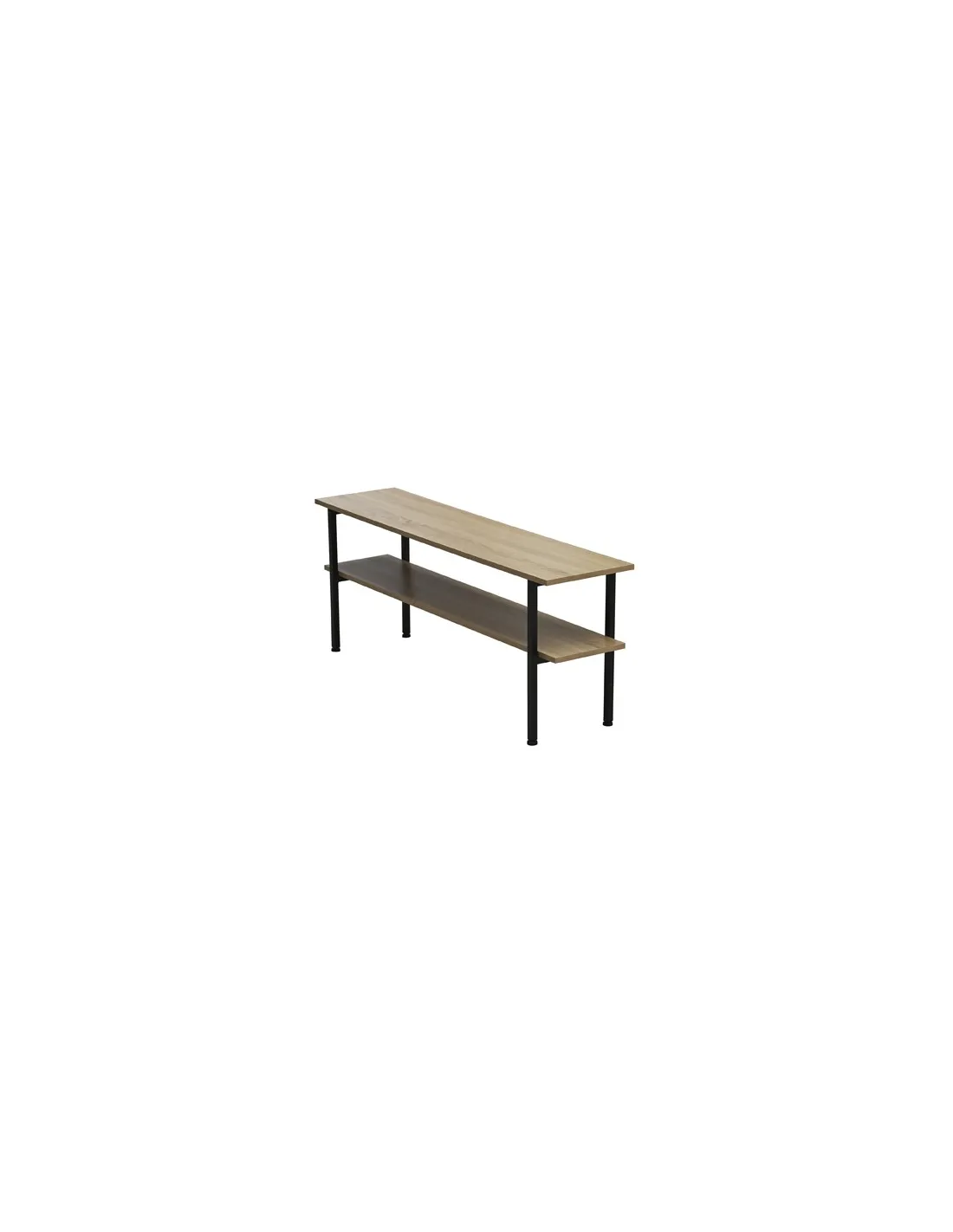 Mesa auxiliar / TV con estante inferior Tapa y estante en melamina color roble Estructura metálica color negro Medidas : 120 x 30 x 48 cm - Unidad venta : caja 1 Ud - Volumen : 0 025 M 3 x Ud Entradas previstas : 99 Ud(s) - 08/03 Colores disponibles : Oak / Negro 99 Ud(s) - 08/03 99 Ud(s) - 08/03
