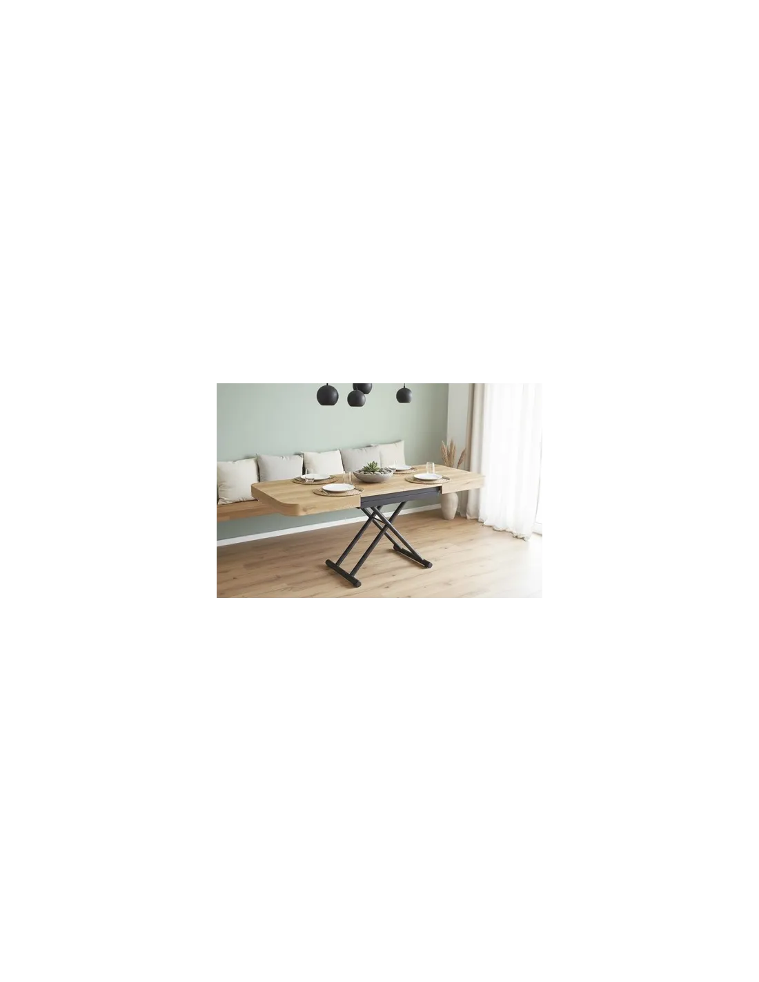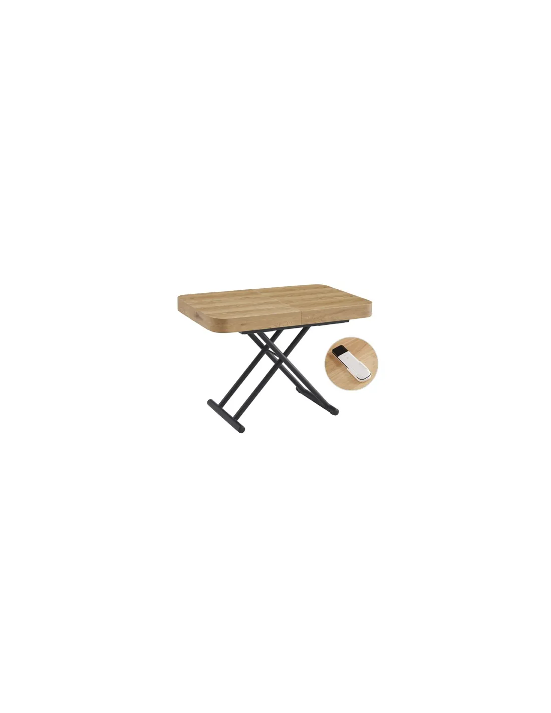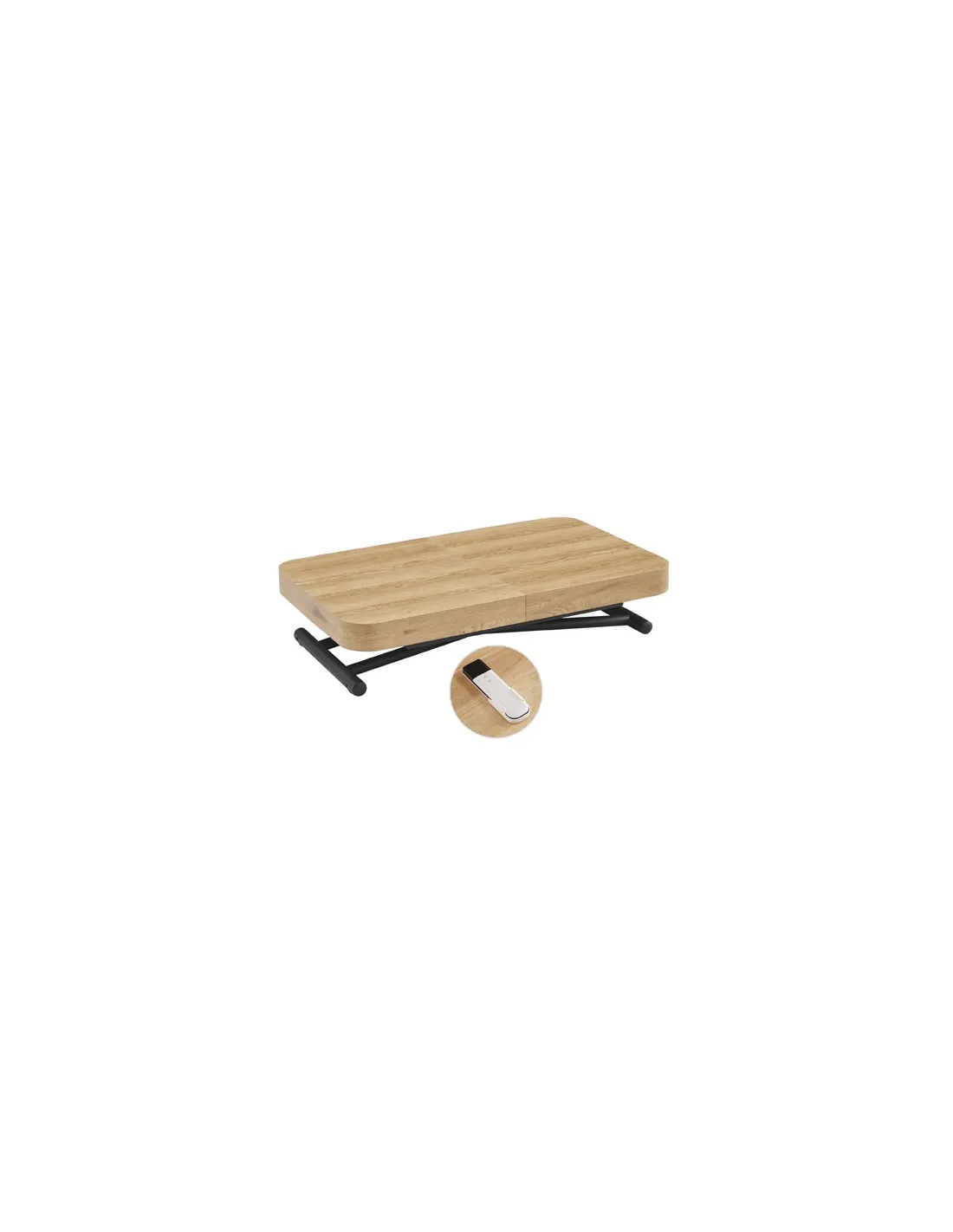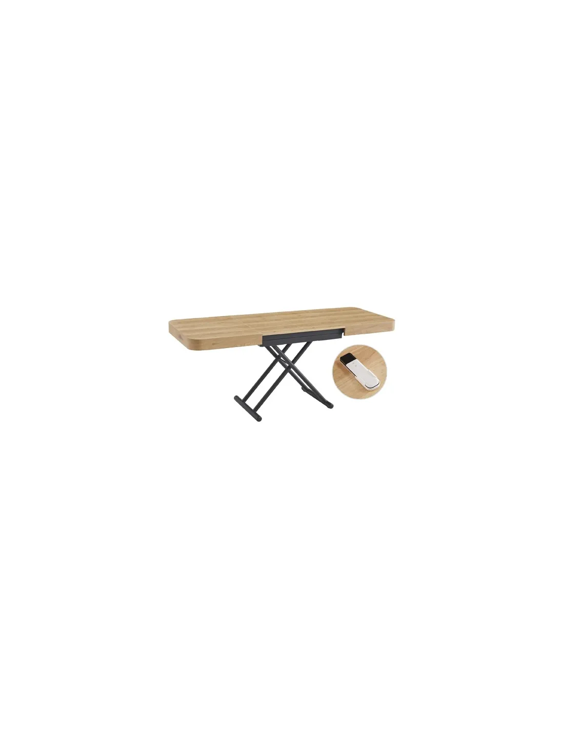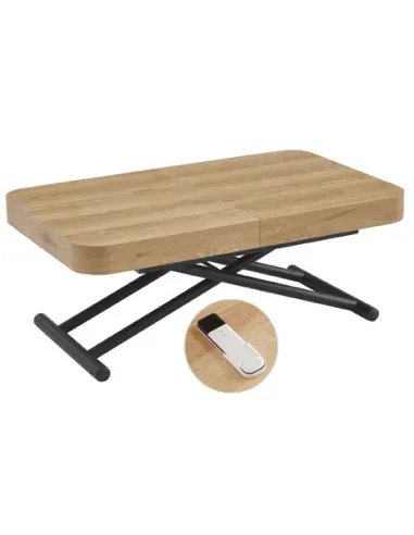 Mesa centro elevable y extensible Tapa y extensibles en melamina color oak 2 Extensibles independientes 40 cm bajo la tapa Estructura metálica color negro Elevacíon eléctrica con batería recargable Accionamiento mediante mando a distancia Medidas : 120 - 160 - 200 x 75 x 28 - 78 cm - Unidad venta : caja 1 Ud - Volumen : 0 358 M 3 x Ud Entradas previstas : 51 Ud(s) - 22/04 Colores disponibles : Oak / Negro 51 Ud(s) - 22/04 Oak / Blanco 48 Ud(s) - 22/04 51 Ud(s) - 22/04