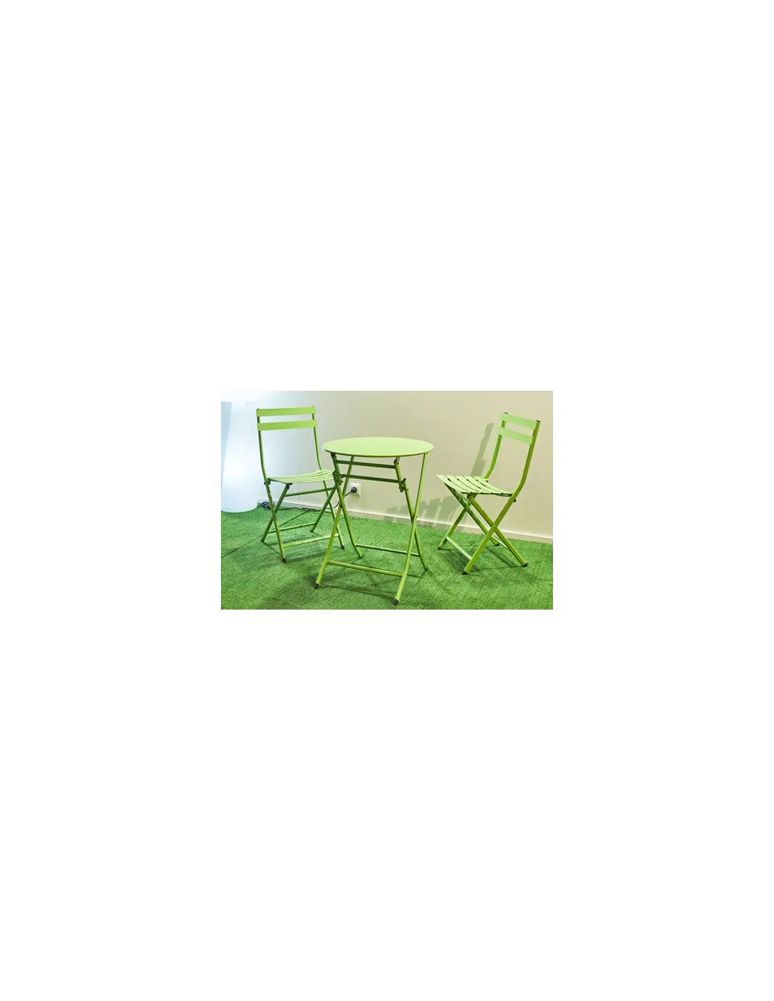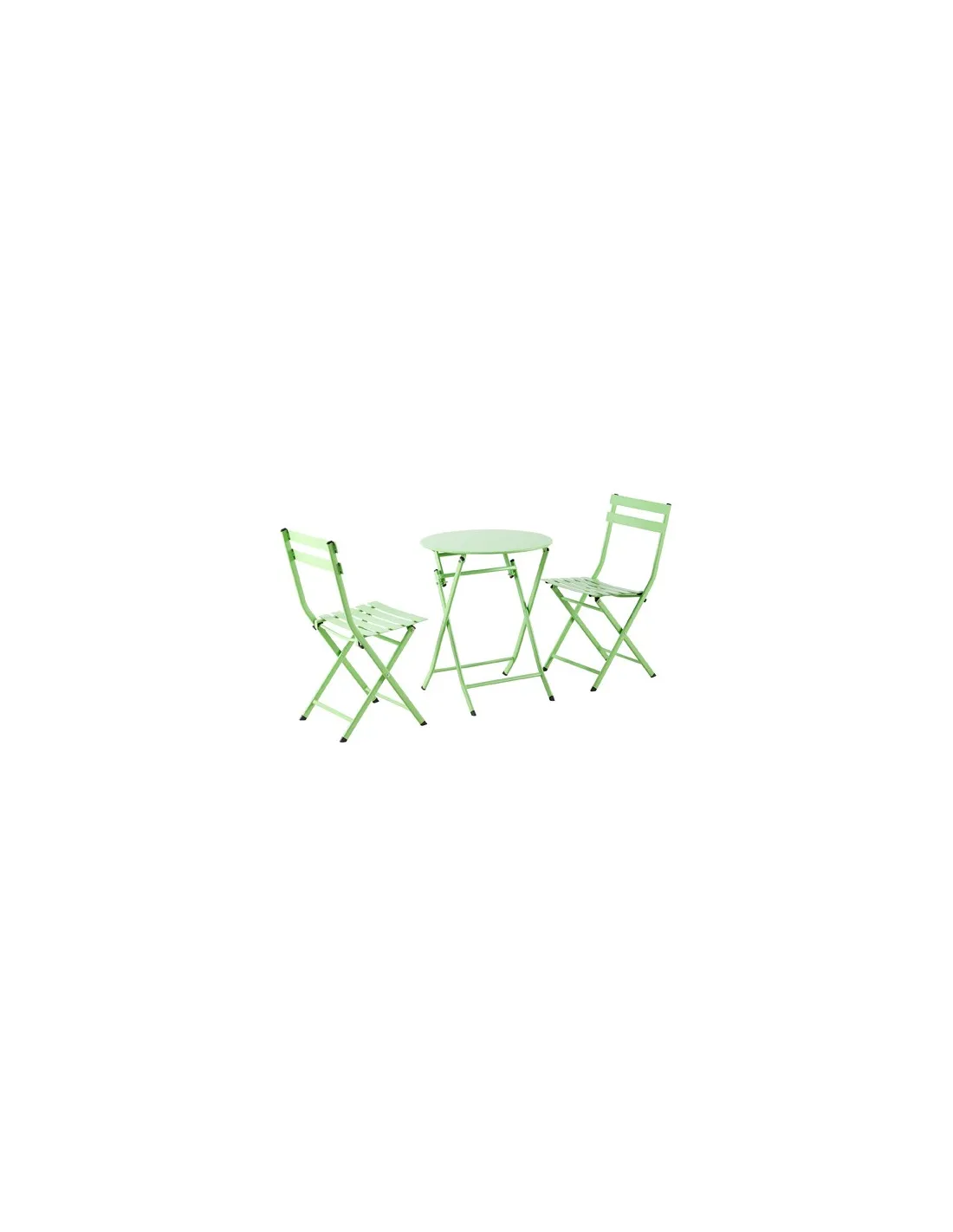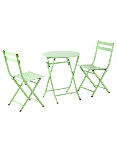 Set cafe compuesto por una mesa redonda y dos sillas Uso exterior / interior Mesa y sillas plegables Conjunto completo fabricado en metal Color pistacho Medidas mesa: 60 x 60 x 71,5 cm Medidas sillas: 38 x 42 x 80 cm - Unidad venta : caja 1 Ud - Volumen : 0 185 M 3 x Ud Entradas previstas : Colores disponibles : Pistacho En stock : 15 Uds En stock : 15 Uds