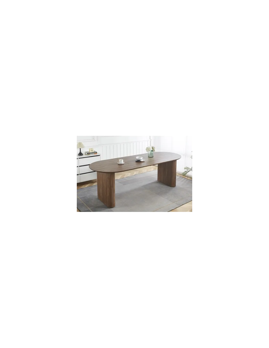 Mesa comedor oval extensible MDF y papel laminado con acabado nogal 2 extensibles individuales de 40 cm ancho Extensible a 190 o 230 cm Ruedas para apertura fácil Color nogal Medidas: 150 - 190 - 230 x 90 x 75 cm - Unidad venta : caja 1 Ud - Volumen : 0 37958 M 3 x Ud Entradas previstas : 12 Ud(s) - 30/03 35 Ud(s) - 30/04 Colores disponibles : Oak 10 Ud(s) - 30/03 Nogal 12 Ud(s) - 30/03 Travertino En stock : 17 Uds 10 Ud(s) - 30/03